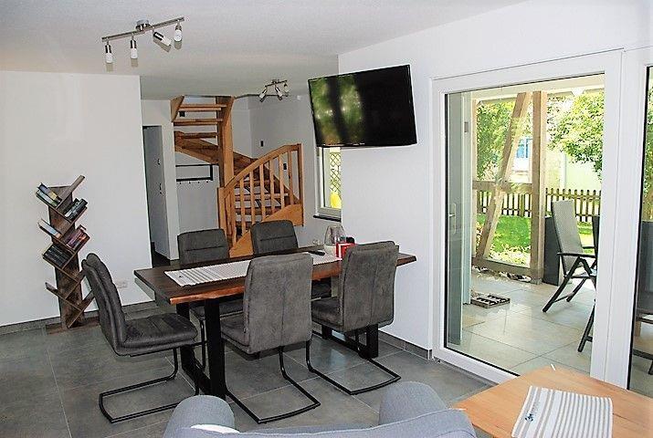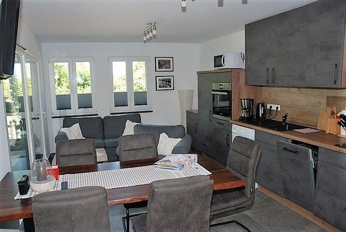 Der helle Wohn- und Essbereich ist stilvoll mit einer komfortablen Sofaecke mit TV-Gerät, Wlan und einem Esstisch möbliert. Die Küche ist ebenfalls in den Raum integriert und bietet viele technische Geräte für eine entspannte Selbstversorgung. Dazu gehören z.B. ein Kühlschrank mit Gefrierfach, ein Herd mit Backofen, Geschirrspülmaschine, Wasserkocher, Kaffeemaschine und vieles mehr.