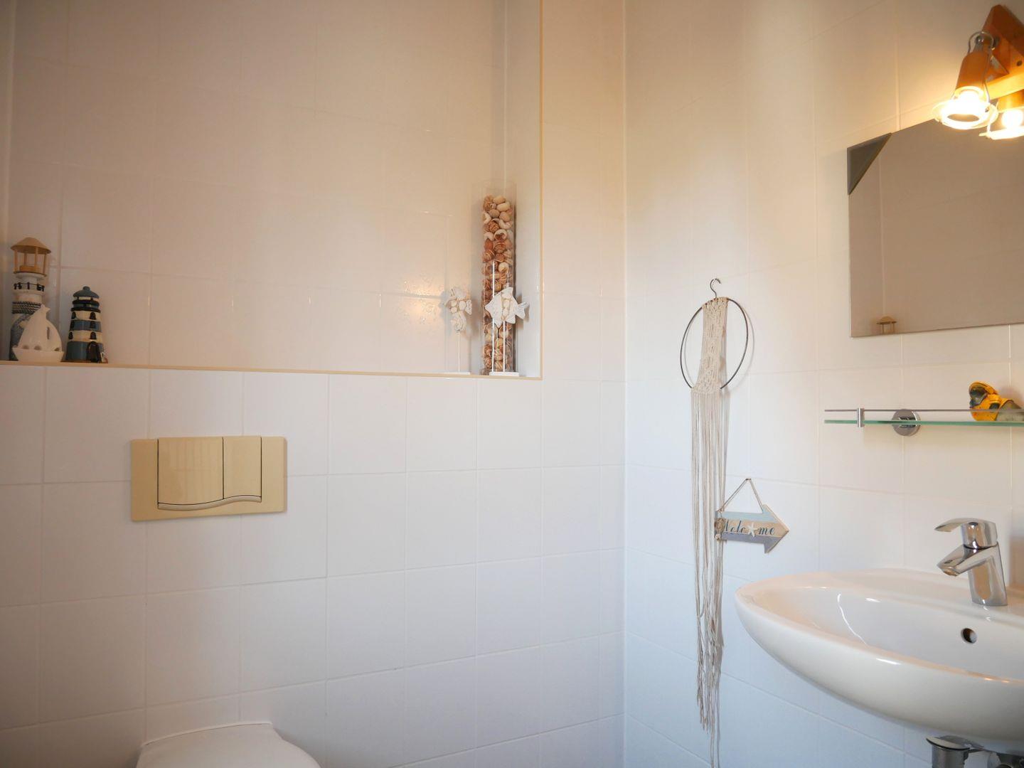 Weiterhin hält das Obergeschoss ein Tageslichtbadezimmer mit Dusche, Waschtisch und WC für Sie bereit. Ein zusätzliches Gäste-WC mit Fenster befindet sich in der unteren Etage.