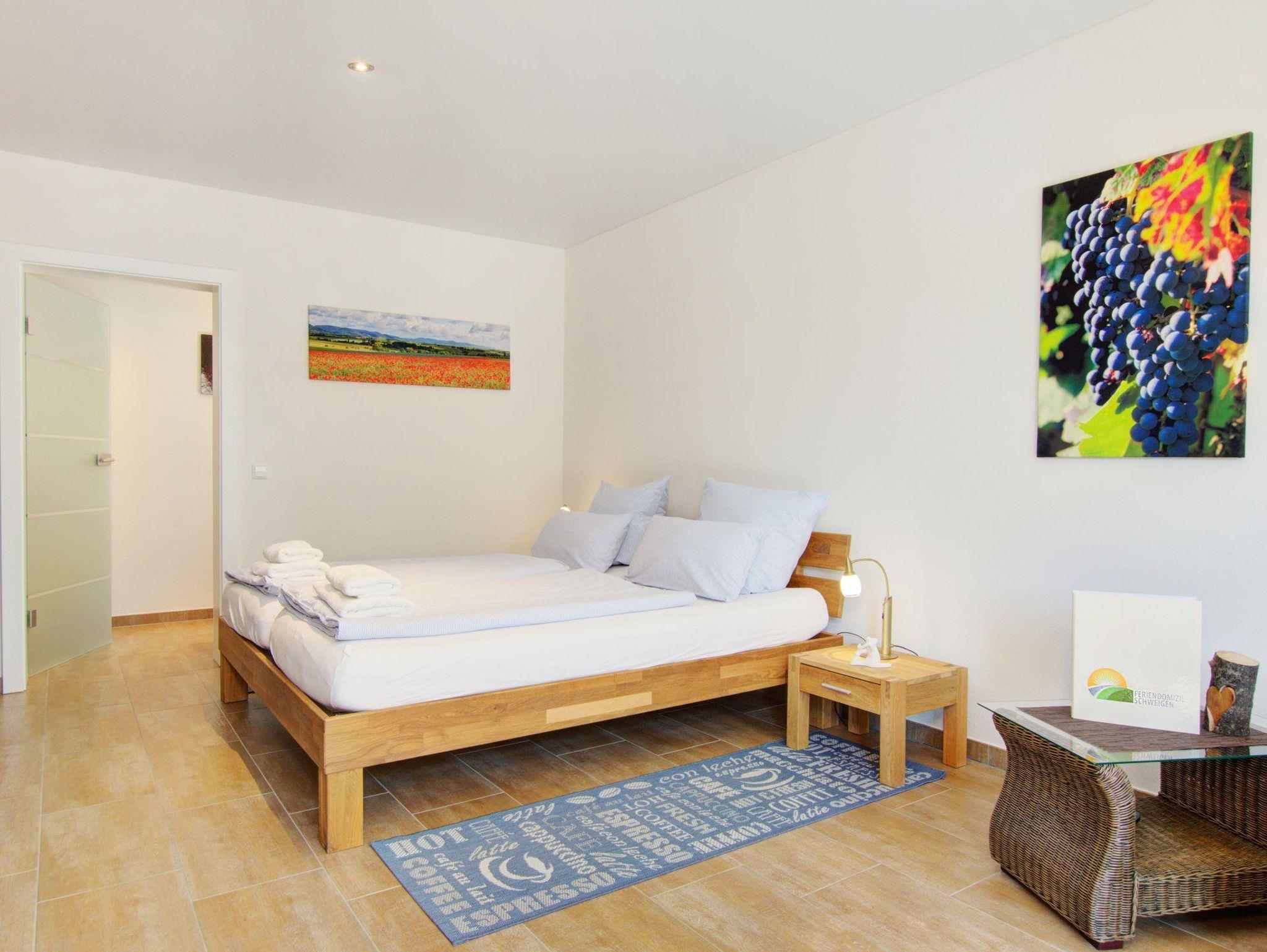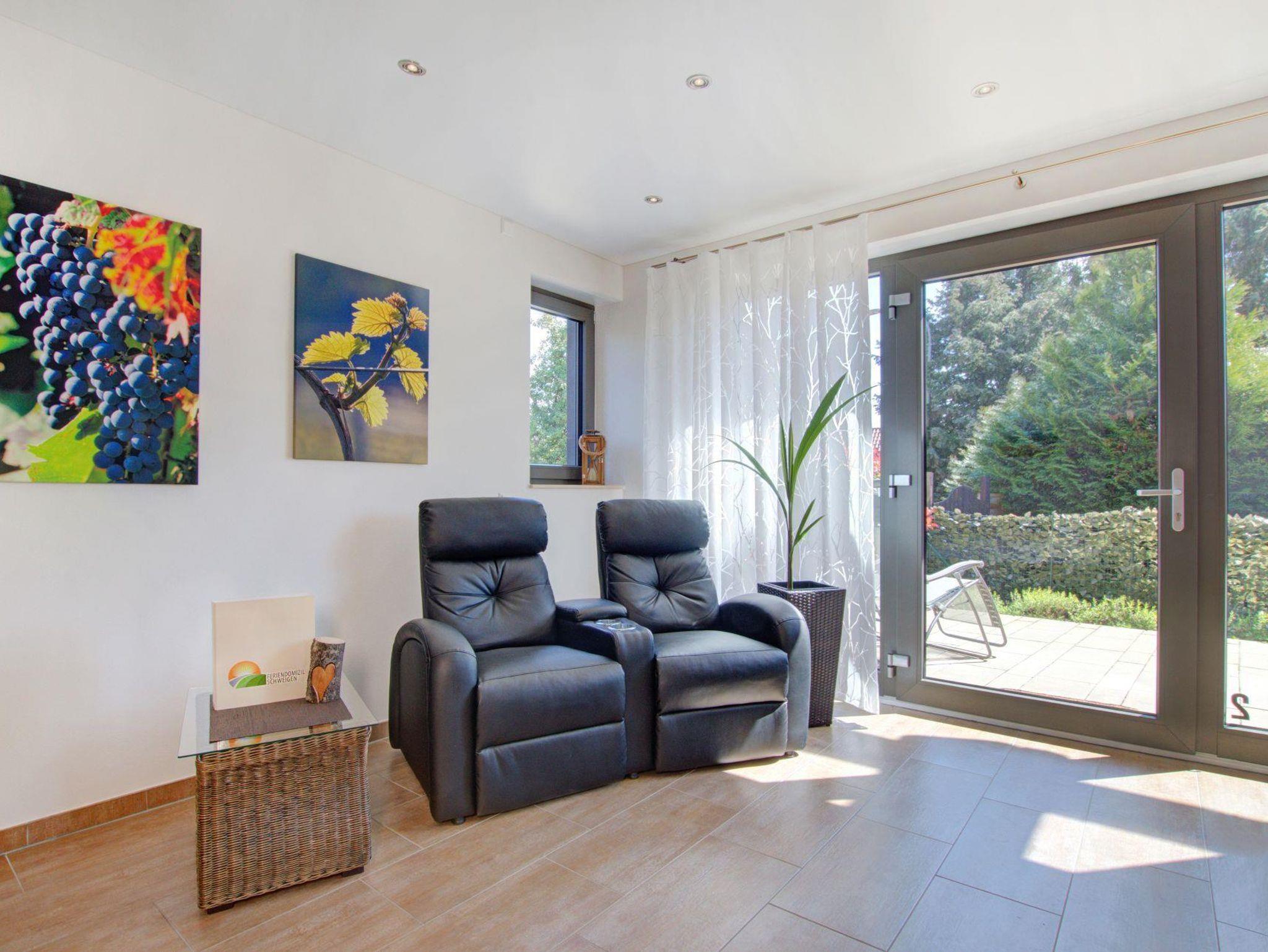 Das Feriendomizil Sonnenberg setzt sichzusammen aus drei unabhängigen Partien, allesamt barrierefrei: Zwei Appartements mit Terrasse im Untergeschosssowie dem Blockhaus, ebenso mit Terrasseund Panoramablick über Weinberge ins Grüne im Erd- und Obergeschoss. DieAusstattung lässt keine Wünsche offen – moderne Technik gepaart mitGemütlichkeit. Durch die Bebauung in den Hang ist es im Sommer angenehm kühl,im Winter sorgt die regelbare Fußbodenheizung für eine Anpassung an dieindividuellen Bedürfnisse.