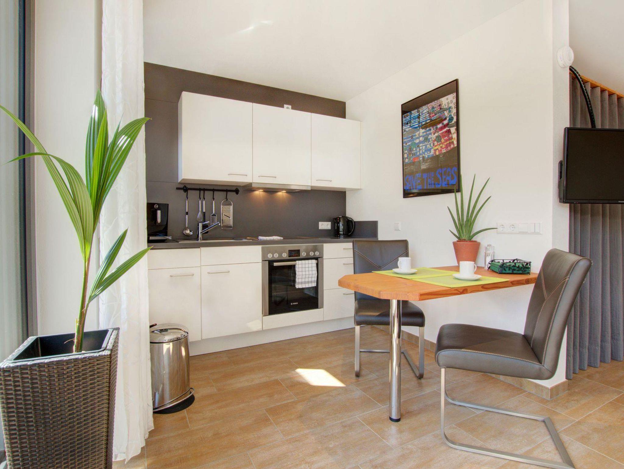 • Küchenzeile mit Induktionsherd, Backofen, Kühlschrank, Wasserkocher, Eierkocher und Jura Kaffeemaschine inkl. Kaffeebohnen