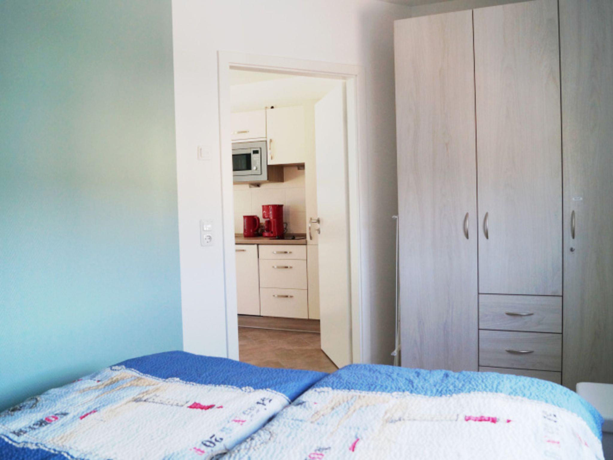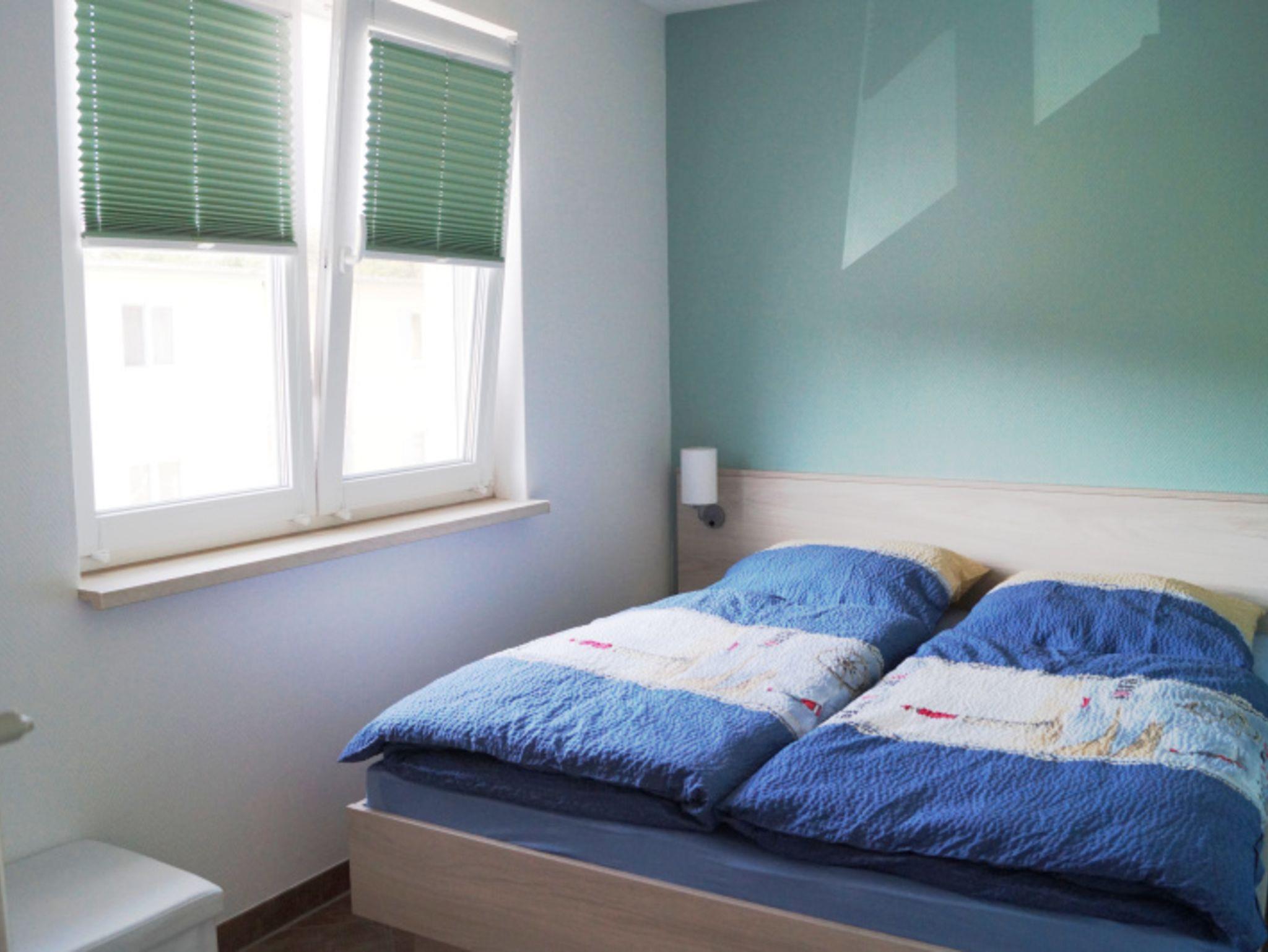 In dem Schlafzimmer befinden sich ein Doppelbett und ein Kleiderschrank.