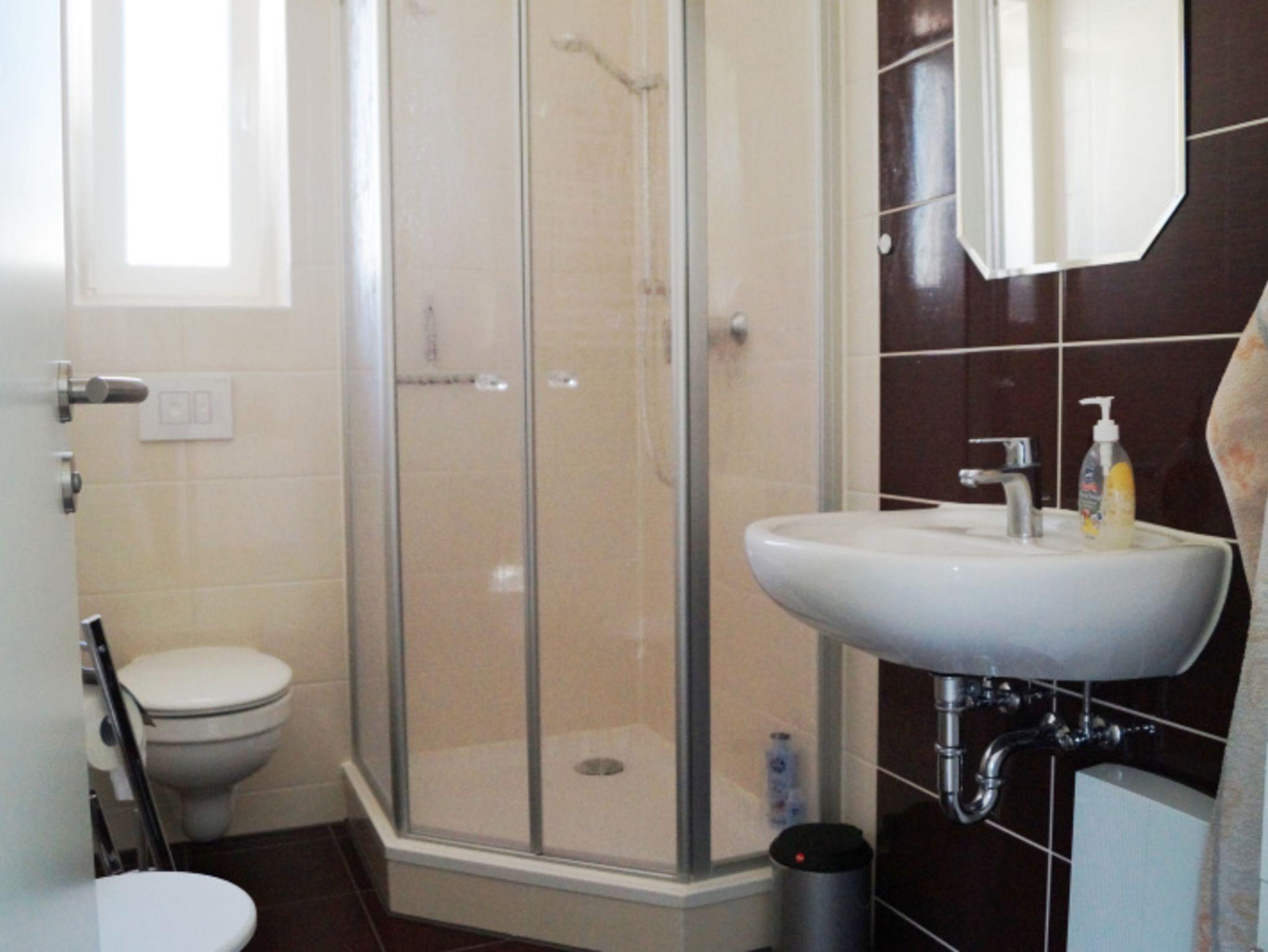Das geflieste Bad mit Fenster hat eine Dusche und ein WC.
