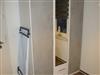 Im Bad gibt hat eine begehbare Dusche, ein Spiegelschrank und einen Handtuchtrockner.