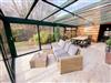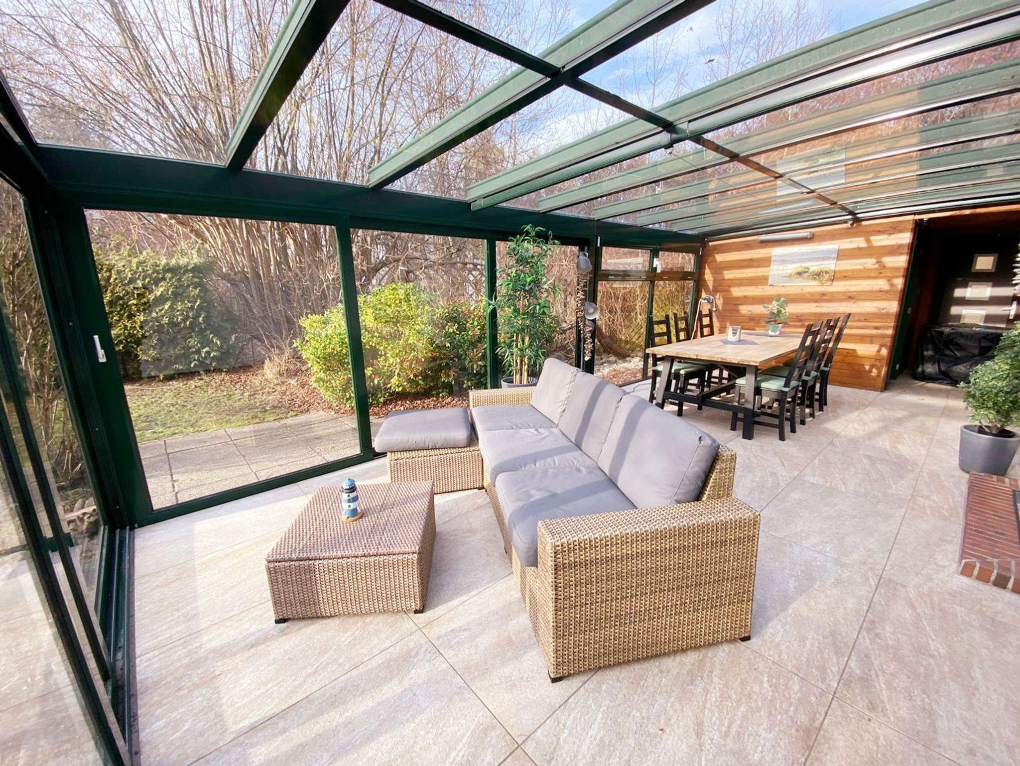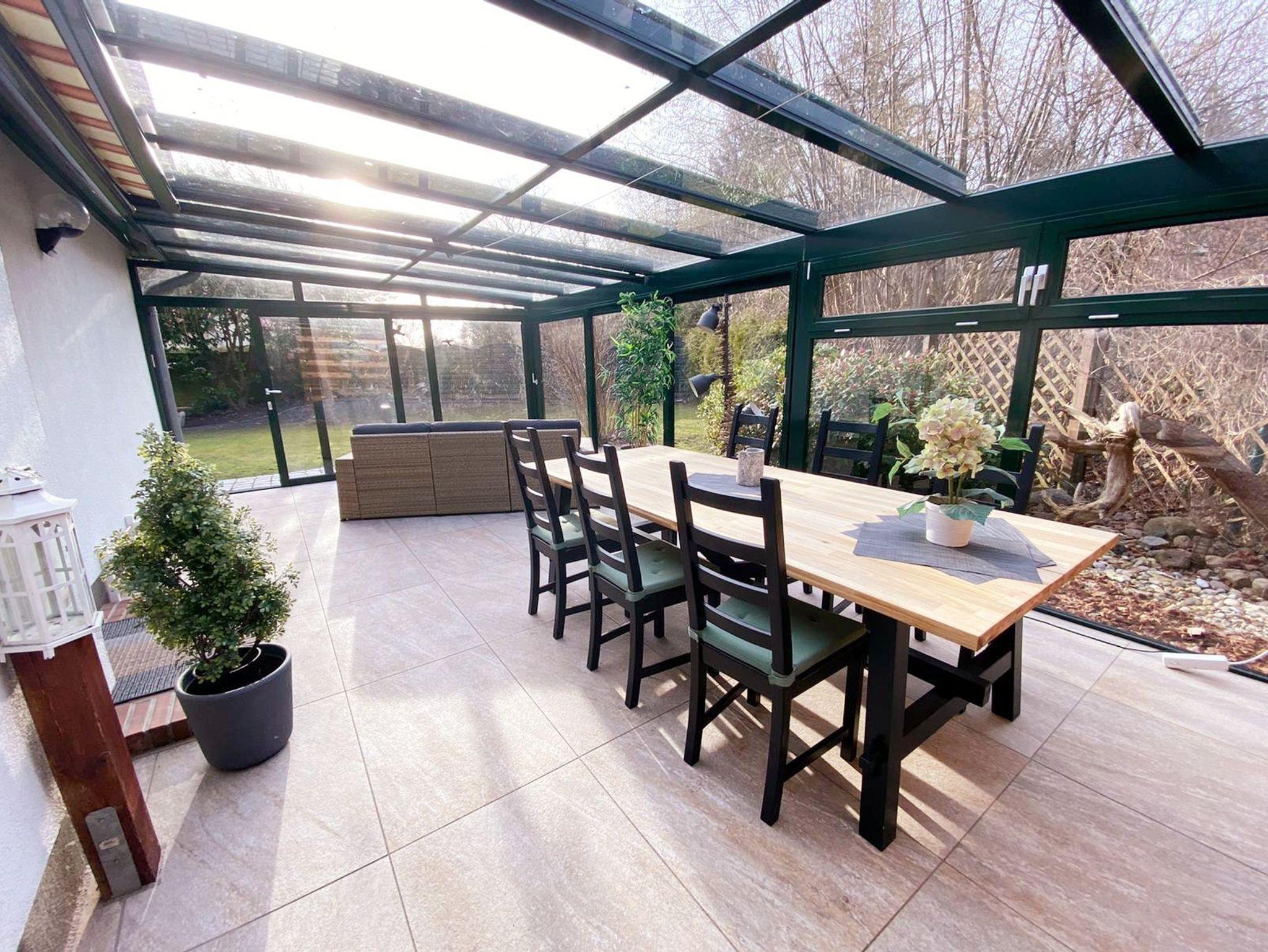 • Wintergarten: 26m³ überdachter Glasanbau mit großem Esstisch und 6 Stühlen und gemütlicher Sitzecke
