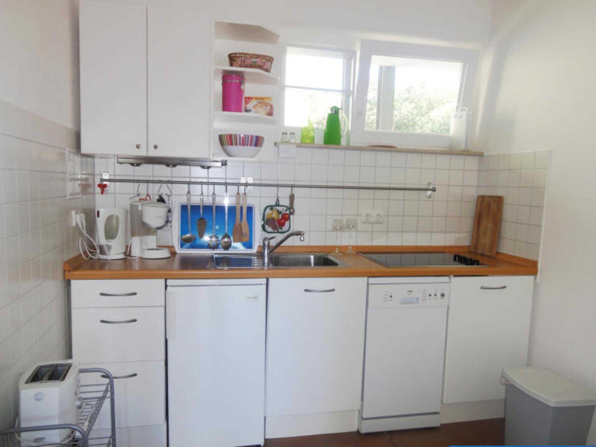 Die Küche ist u.a. mit einem Geschirrspüler, einem Ceranfeld (4 Kochfelder), einem Kühlschrank, einem Wasserkocher und einer Kaffeemaschine ausgestattet. Die Küche ist separat und nicht in das Wohn- / Schlafzimmer integriert.