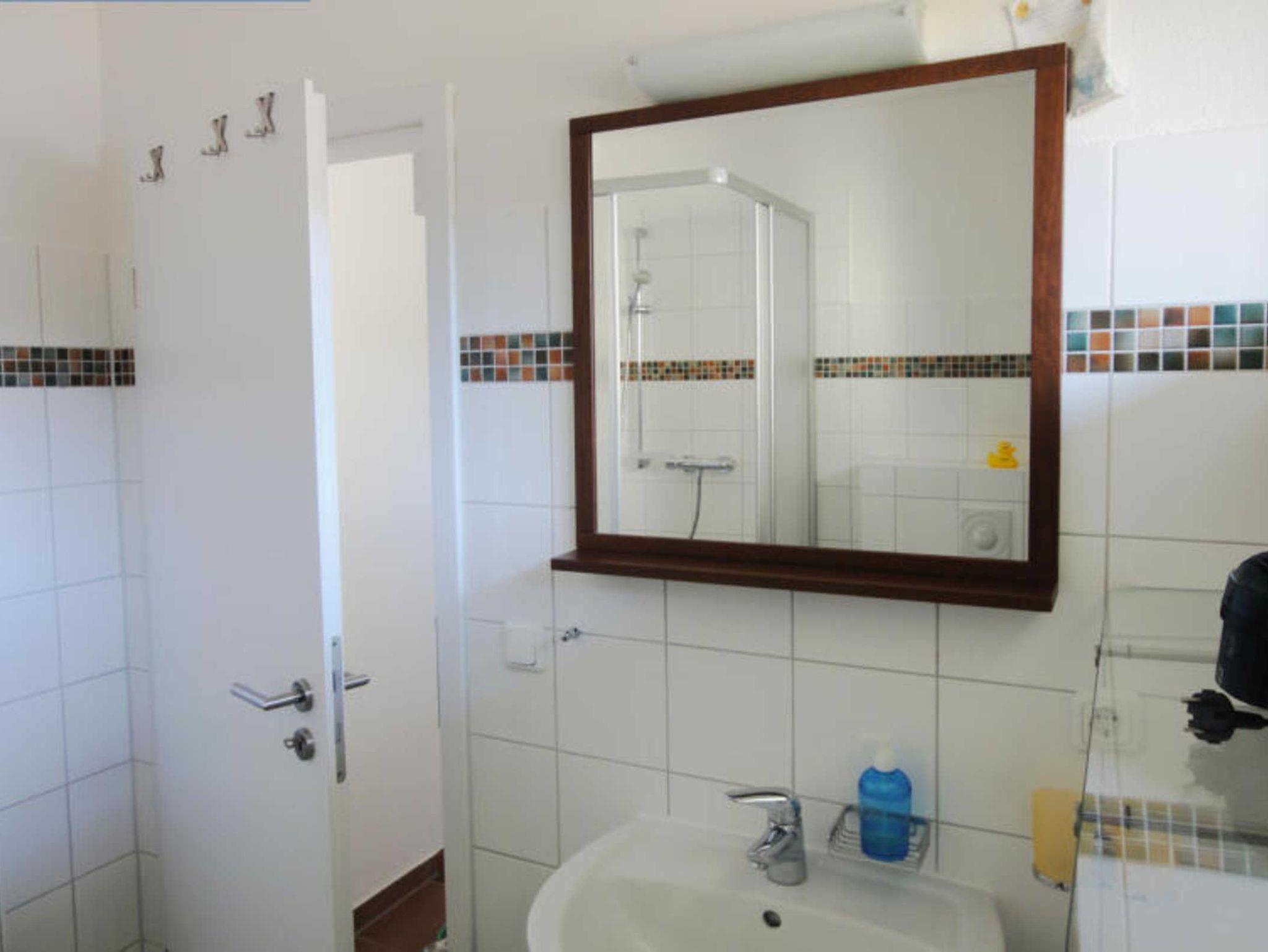 Im gefliesten Bad mit Fenster sind eine Dusche, ein Waschbecken und ein WC. Zu ihrer Unterkunft gehören außerdem ein großzügiger Balkon, ein Kellerraum und ein PKW-Stellplatz.