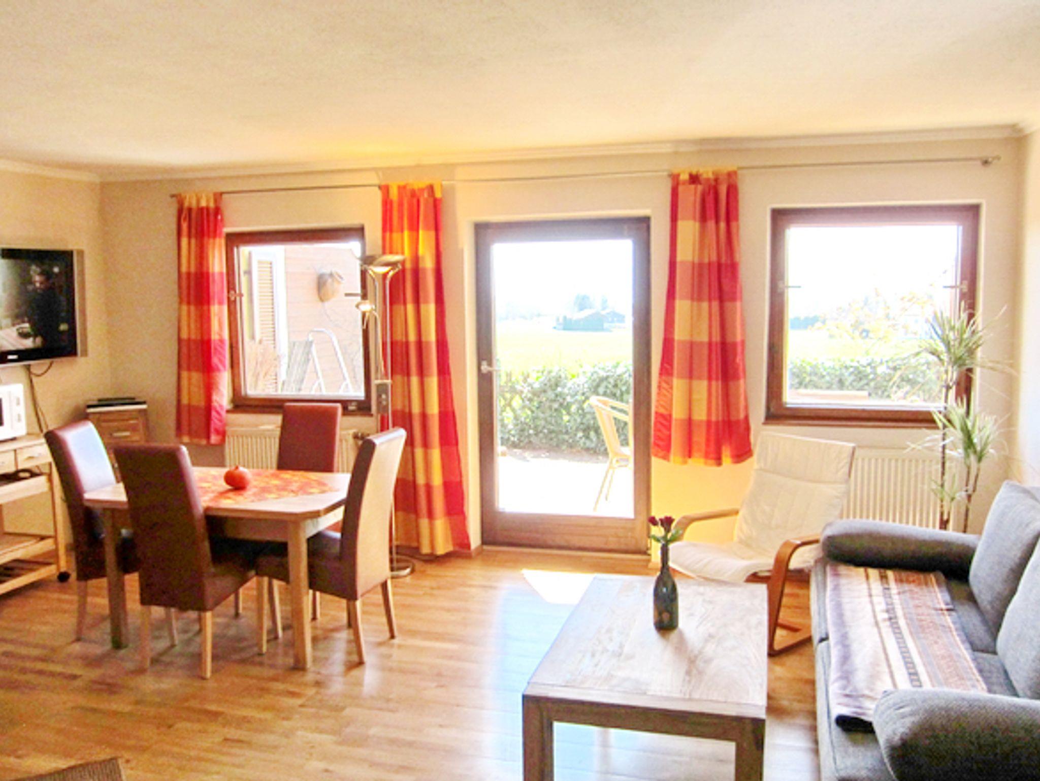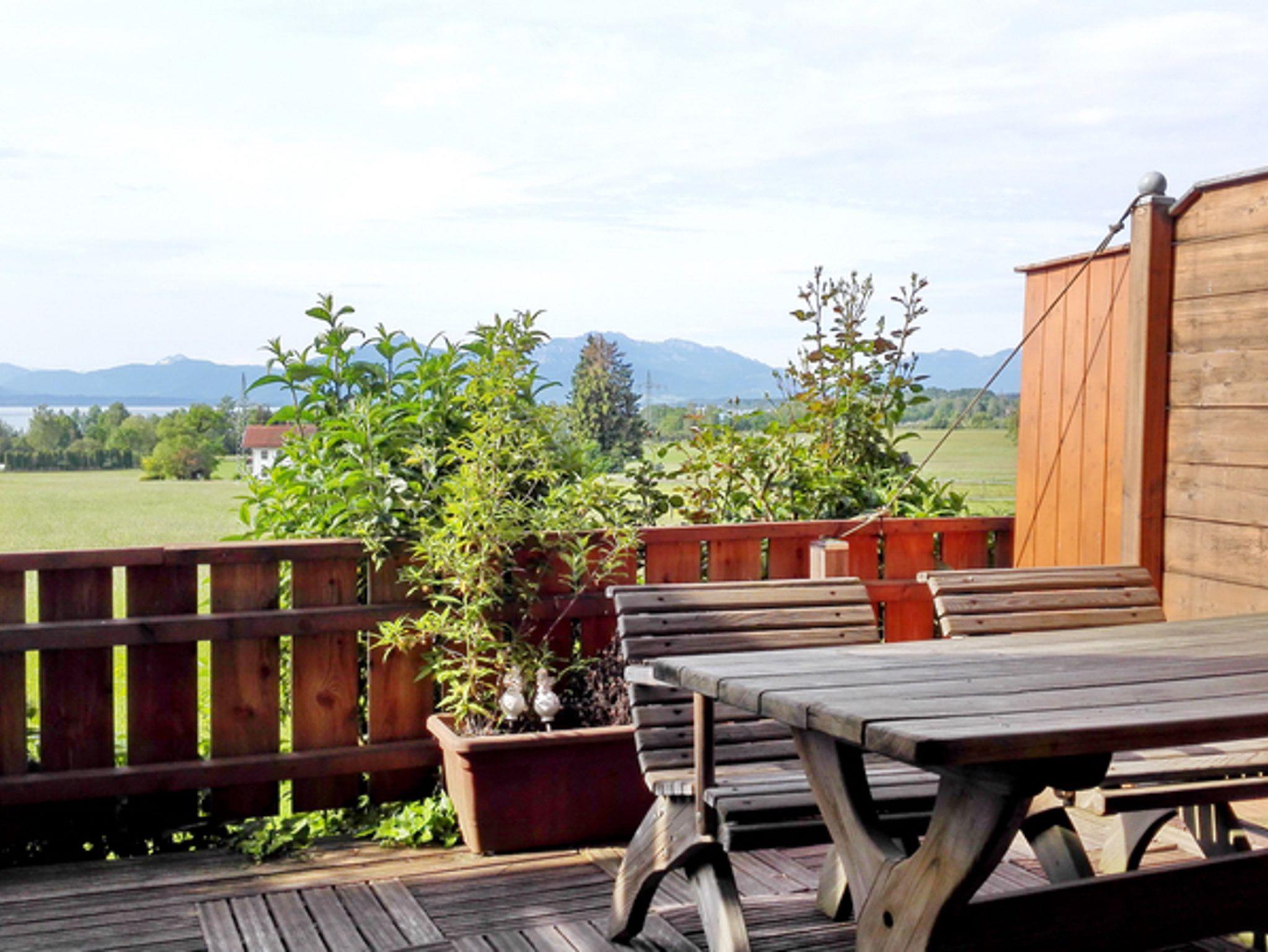 Die Ferienwohnung verfügt über einen separaten Eingang. Kinder erst ab 12 Jahren. Der neu renovierte Wohnbereich ist gemütlich eingerichtet. Hier befindet sich eine bequeme ausziehbare Couch mit Kaltschaummatratze, ein Esstisch mit vier Stühlen, ein Flat LCD Fernseher, eine Küchenzeile sowie ein nutzbarer Kaminofen. Im Wohnbereich ist eine gut ausgestattete Küchenzeile integriert, sowie ein direkter Zugang zum Badezimmer. Abgerundet wird alles durch einen nutzbaren Kaminofen. Eine gemütliche und helle gelegene Essgruppe sorgt für ein schönes Ambiente beim Frühstücken. Von hier aus geht es gleich zur Terrasse die mit Bank und Tisch ausgestattet ist und einen einmalig schönen Blick auf den Chiemsee und die Chiemgauer Alpen ermöglicht. Im Schlafzimmer befindet sich ein Doppelbett mit den Maßen 180x200 cm. Das Badezimmer bietet mit Dusche eine angenehme Wohlfühlatmosphäre. Die Ferienwohnung hat einen Terrasse mit Zugang vom Wohnzimmer.