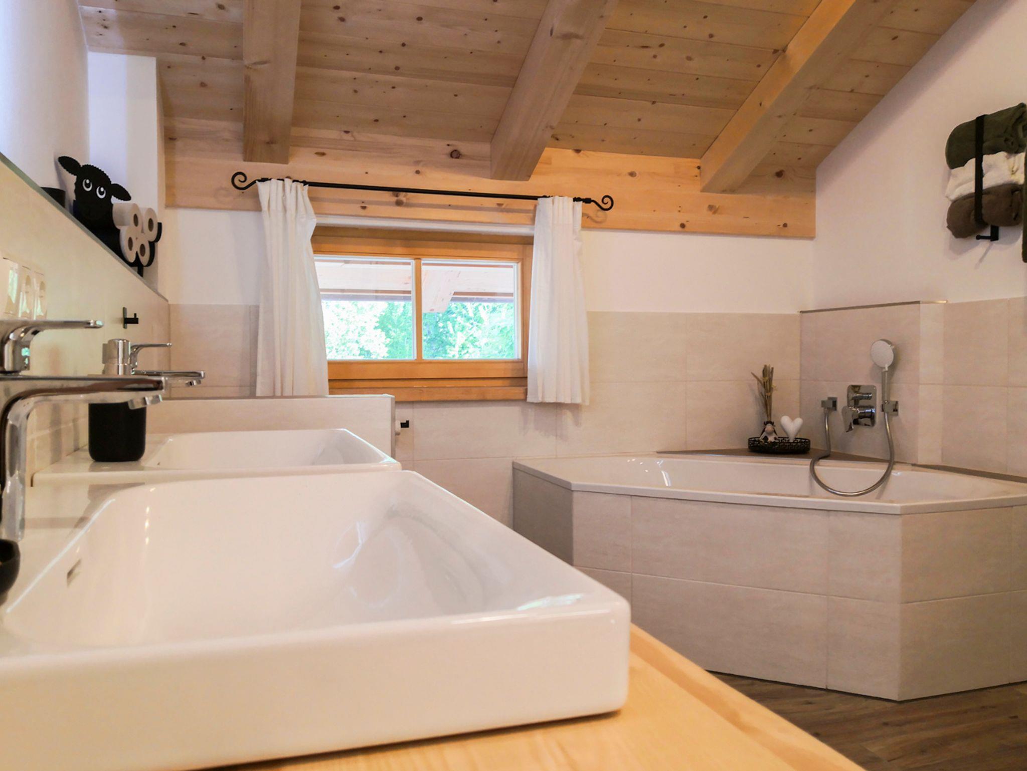 – 1 Badezimmer mit WC, zwei Waschbecken, Badewanne, begehbare Dusche, Haartrockner und Kosmetikspiegel