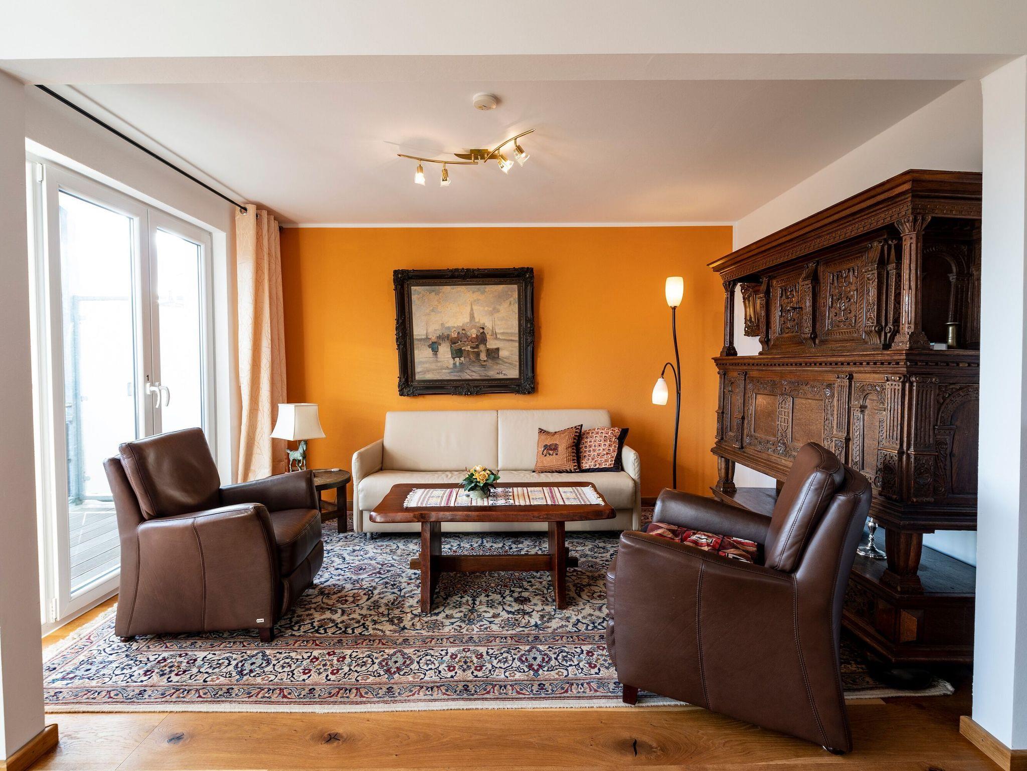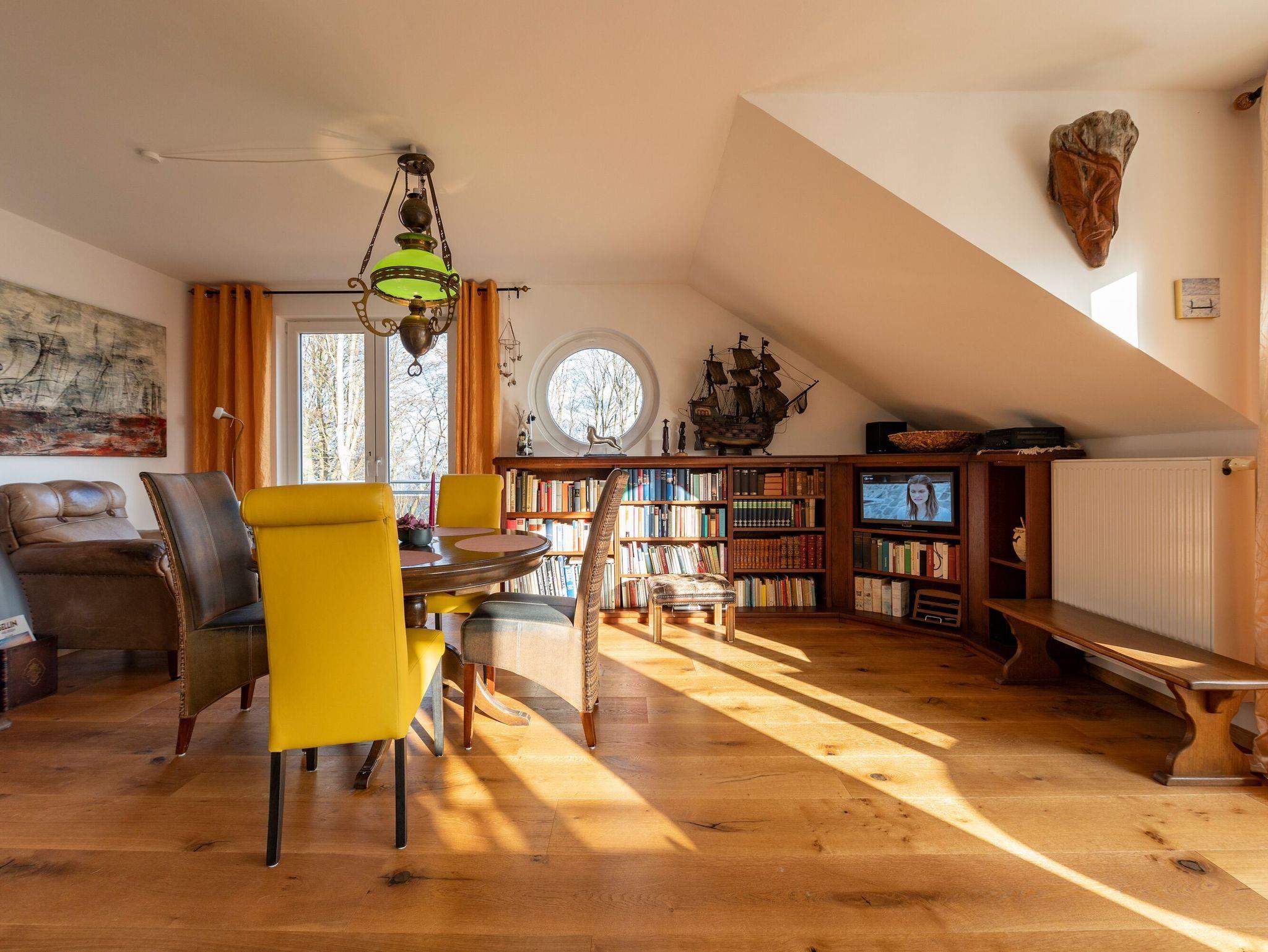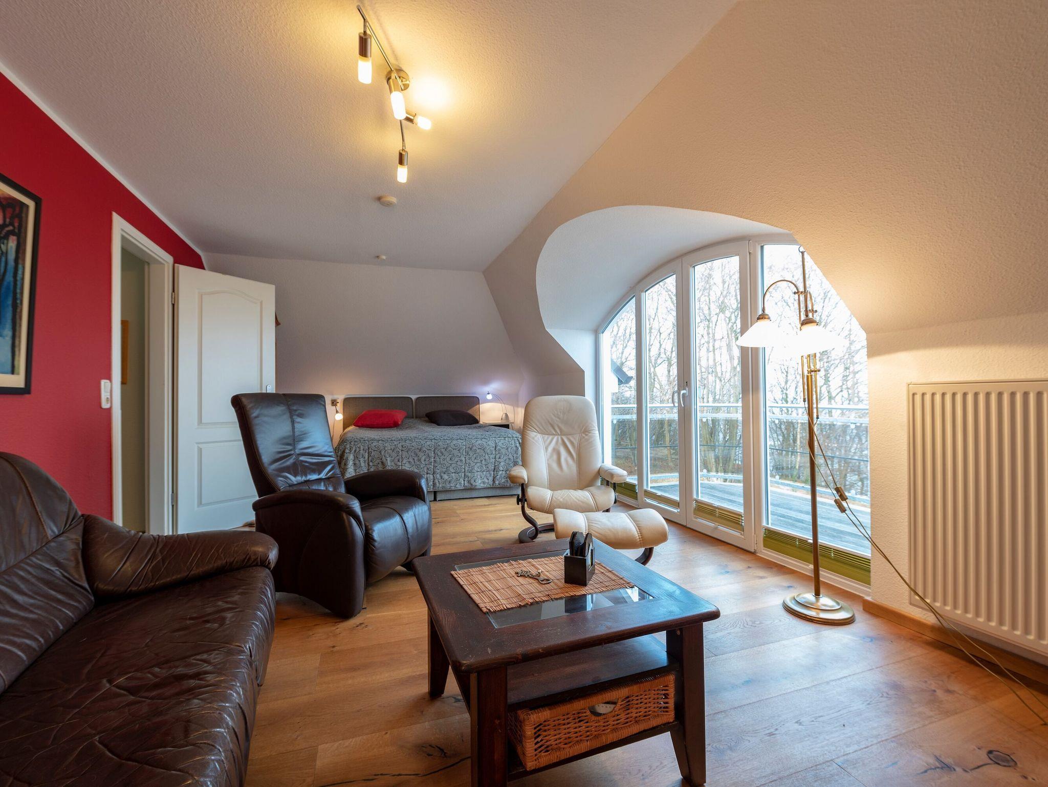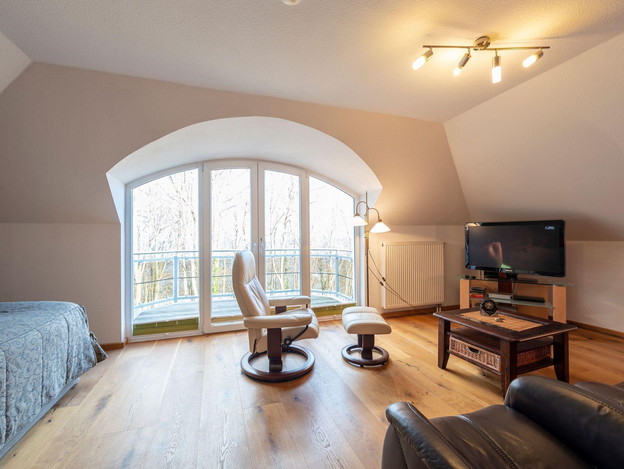 Vom Flur mit der Garderobe aus gelangen Sie in das Wohnzimmer. Es empfängt Sie ein 38 qm großer, lichtdurchfluteter Raum mit Dielen aus massiver Eiche, zwei Balkonen, wertvollen Eichenmöbeln, einem gemütlichem Sofa, zwei Sesseln, TV und einer umfangreichen Bibliothek. Hier kann man wunderbar entspannen und den Urlaubstag Revue passieren lassen.