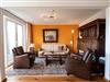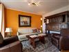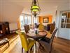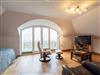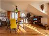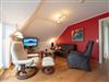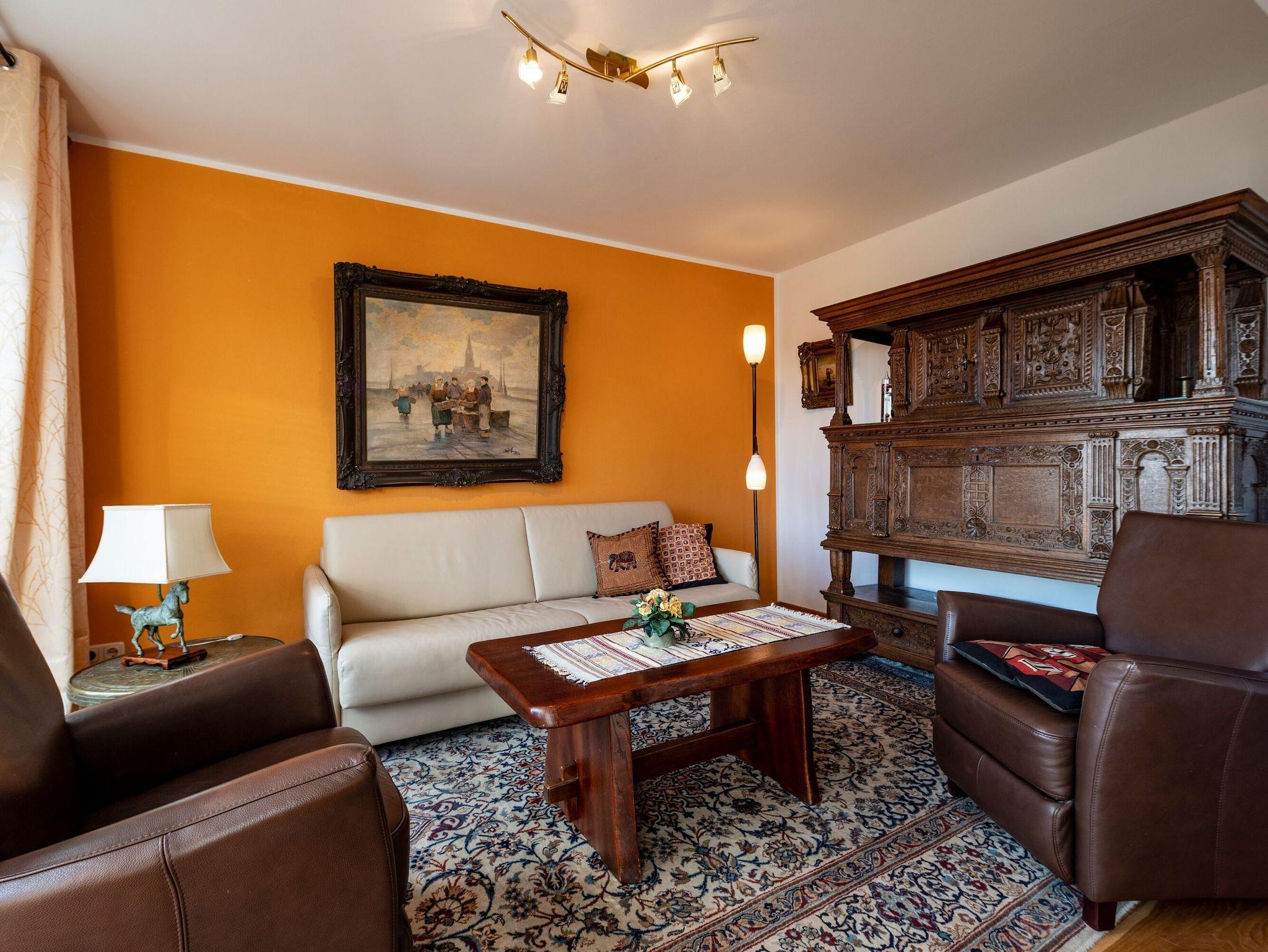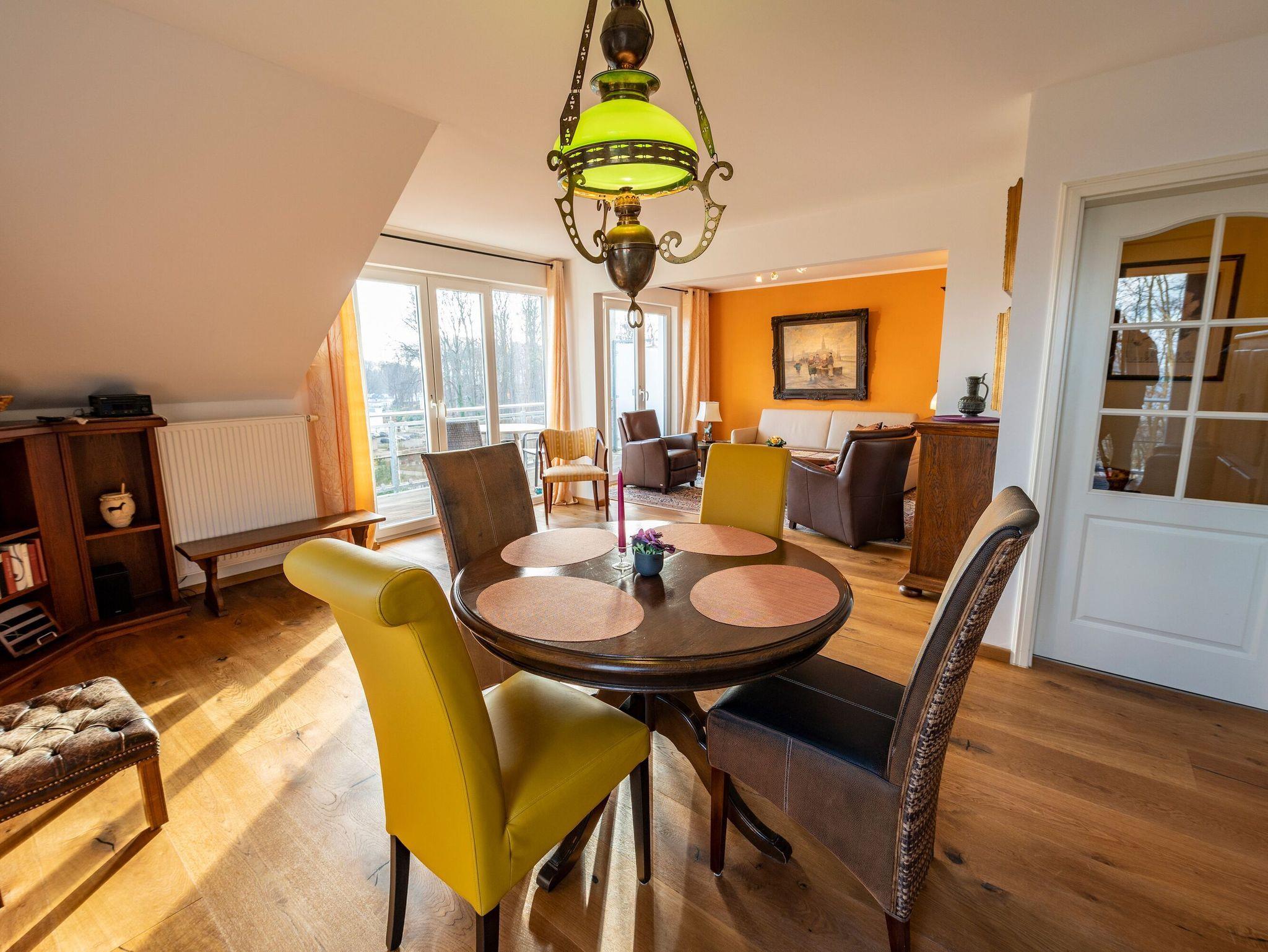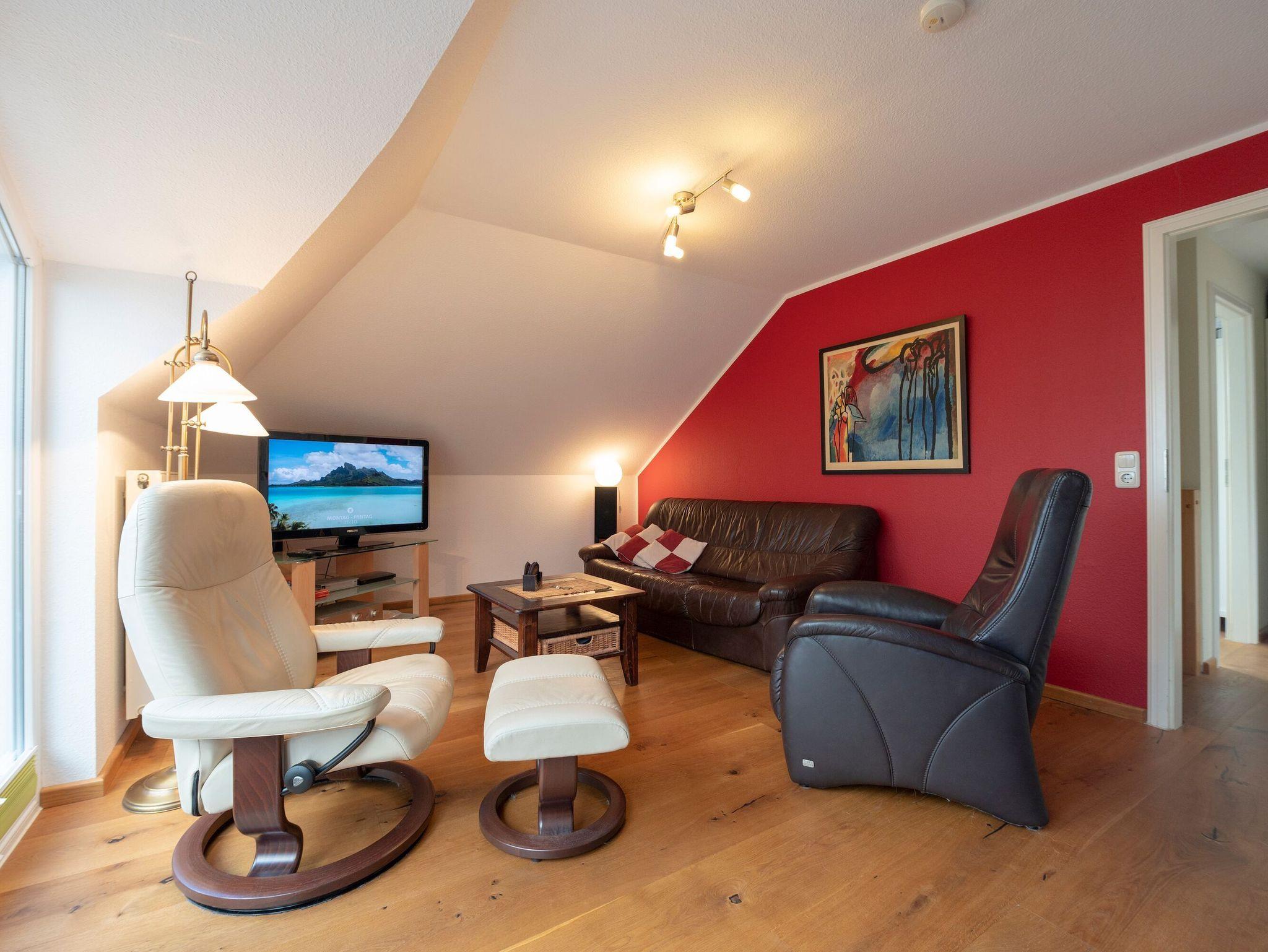 Vom Flur mit der Garderobe aus gelangen Sie in das Wohnzimmer. Es empfängt Sie ein 38 qm großer, lichtdurchfluteter Raum mit Dielen aus massiver Eiche, zwei Balkonen, wertvollen Eichenmöbeln, einem gemütlichem Sofa, zwei Sesseln, TV und einer umfangreichen Bibliothek. Hier kann man wunderbar entspannen und den Urlaubstag Revue passieren lassen.