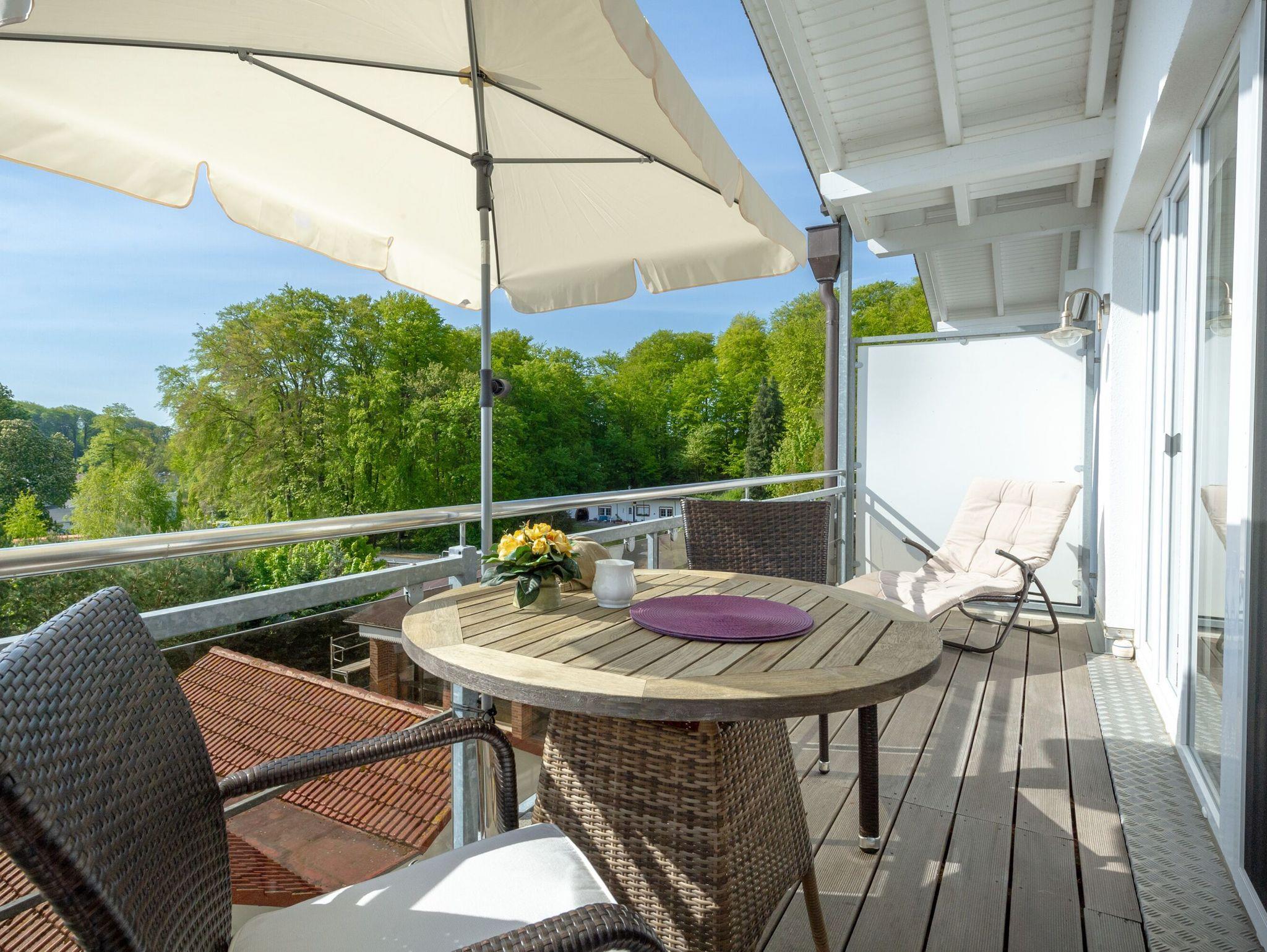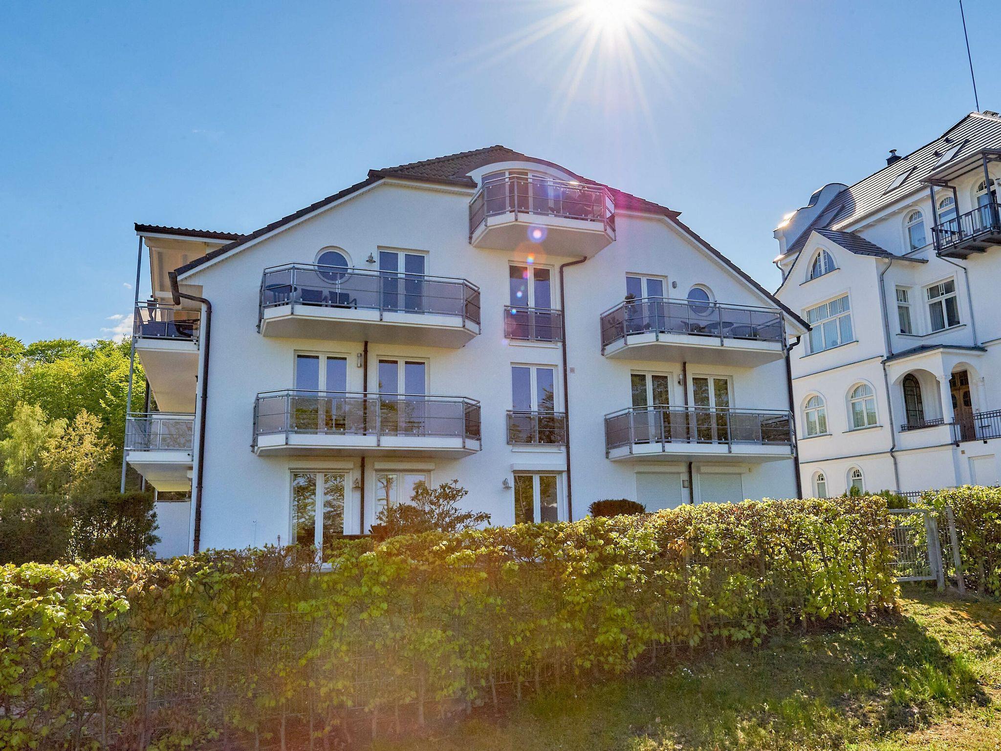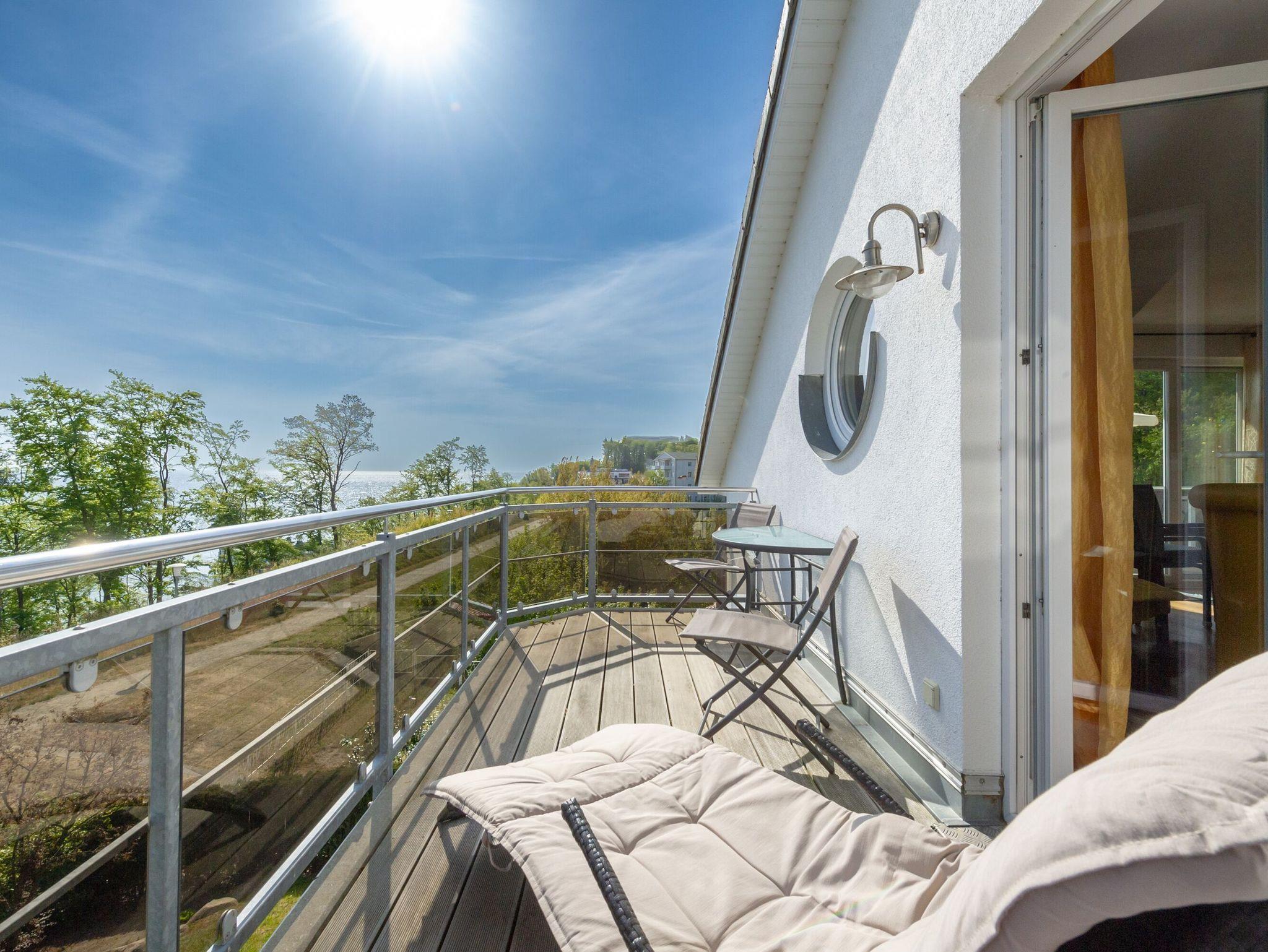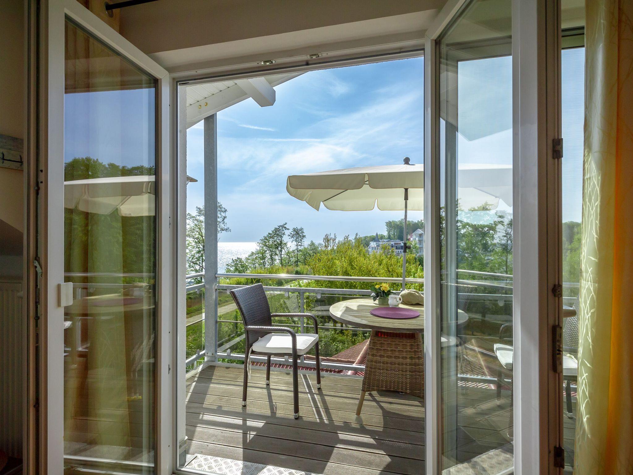 Während Ihnen die kleinen Balkone zur Seeseite im Wandel der Jahreszeiten einen schönen Ausblick auf die Ostsee bzw. das mit Buchen bewachsene Hochufer und das angrenzende Waldgebiet der Granitz erlauben, haben Sie auf dem überdachten Hauptbalkon die Sonne von ihrem Aufgang über dem Meer bis gegen 15 Uhr zu Gast. Und auch danach können Sie die Sonne weiter sehen, nämlich vom oberen Balkon aus.