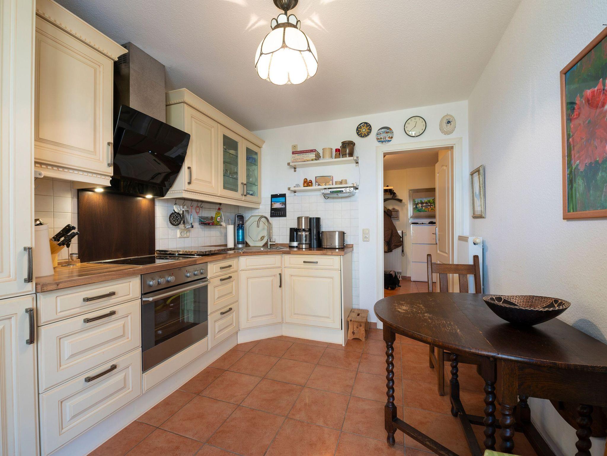 Die separate Wohnküche bietet alles, was man braucht, um sich selbst zu bekochen, wenn man nicht gerade unterwegs auf der Insel Rügen einkehrt. Neben einem 4-Zonen-Ceranherd mit Backofen, einem Kühlschrank mit Gefrierschrank, einer Spülmaschine sowie einer Filterkaffeemaschine, einem Wasserkocher und einem Toaster gibt es selbstverständlich auch genügend Töpfe, Pfannen und Geschirr.