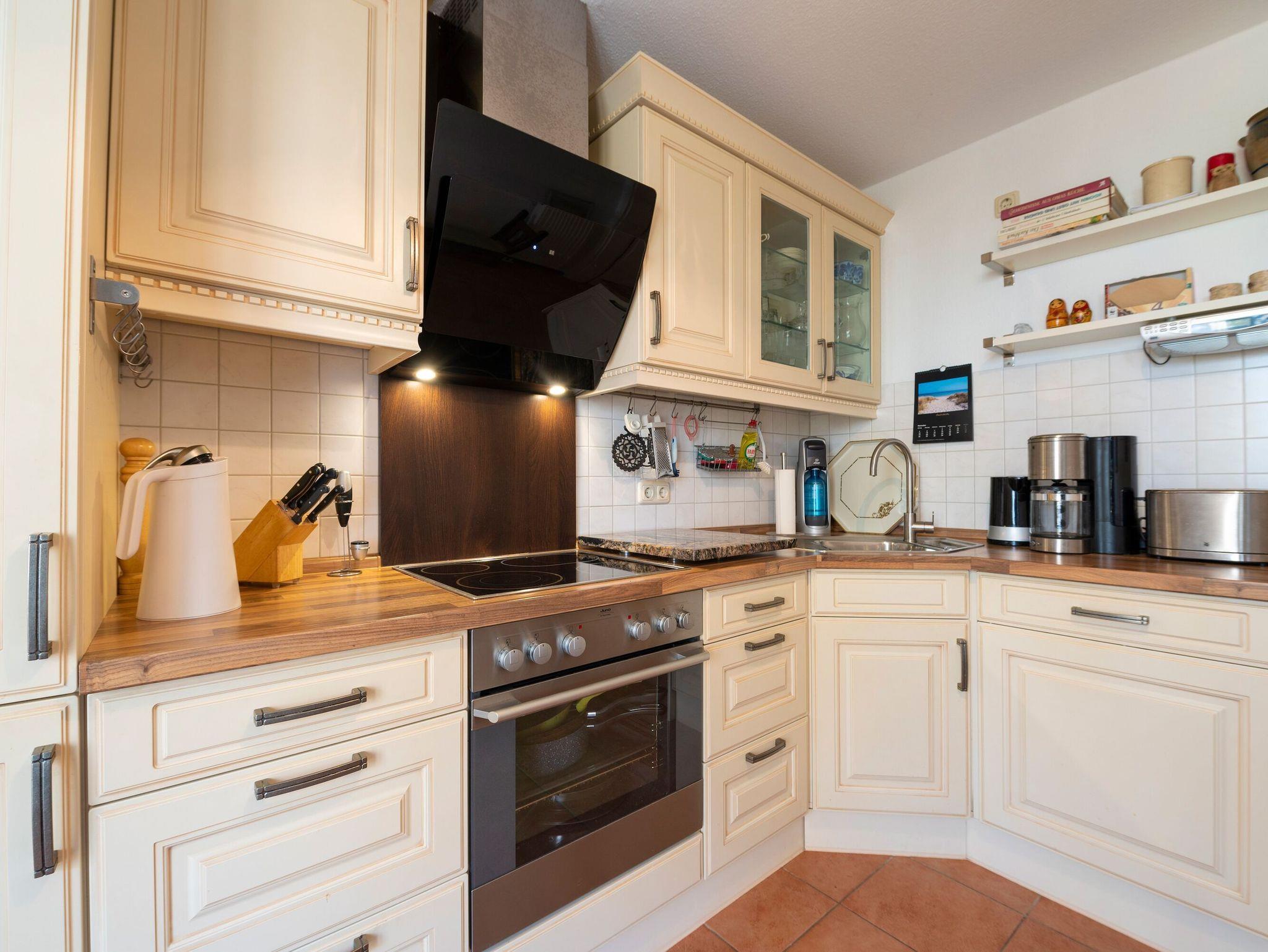 Die separate Wohnküche bietet alles, was man braucht, um sich selbst zu „bekochen“, wenn man nicht gerade unterwegs auf der Insel Rügen einkehrt. Neben einem 4-Zonen-Ceranherd mit Backofen, einem Kühlschrank mit Gefrierschrank, einer Spülmaschine sowie einer Filterkaffeemaschine, einem Wasserkocher und einem Toaster gibt es selbstverständlich auch genügend Töpfe, Pfannen und Geschirr.