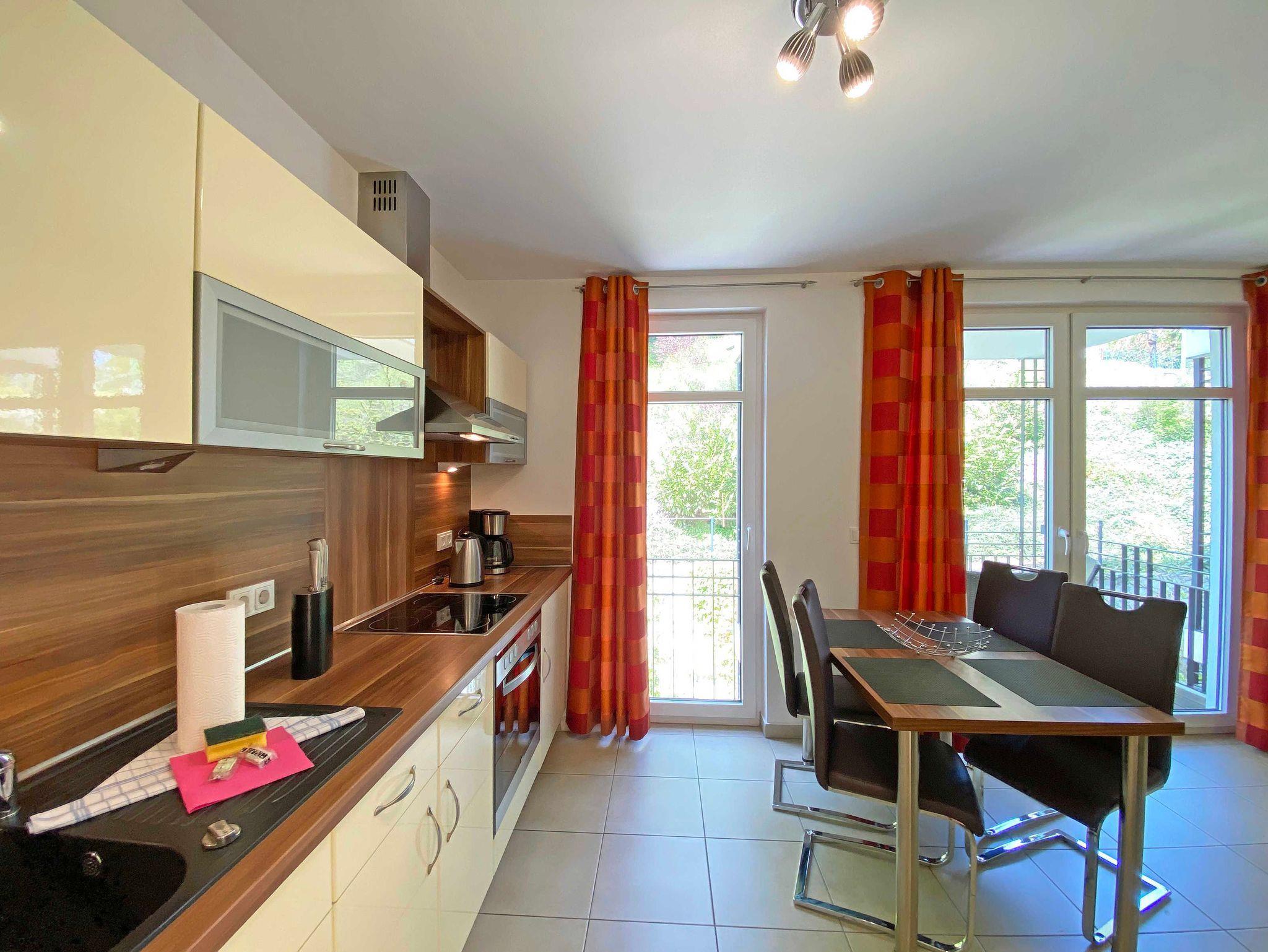 Die Nichtraucherwohnung Nr. 09 in der Villa Lena befindet sich im 1. Obergeschoss des Hauses und ist bequem mit dem Fahrstuhl zu erreichen. Die Wohnung hat eine Größe von ca. 45qm und bietet Ihnen Platz für max. 2 bis 4 Personen. Vom Eingangsbereich mit Garderobe erreichen Sie alle Räumlichkeiten. Der helle Wohnbereich verfügt über eine Schlafcouch (Aufbettungsmöglichkeit für 3./4. Person mit einer Maße von 1,55m x 2,00m), einer Stehlampe und einem Sideboard mit einem Smart-TV, Mini-Stereo-Anlage und WLAN-Anschluss. Die angrenzende Küchenzeile ist mit allem, was Sie zum Kochen benötigen, ausgestattet wie einem Backofen, einem Kühlschrank mit Gefrierfach, einem Geschirrspüler, einer Mikrowelle, einer Kaffeemaschine, einem Toaster, einem Wasserkocher und diversen Küchenutensilien. Ein Essplatz am Fenster rundet den Raum ab. Von hier gelangen Sie auf Ihren bestuhlten Balkon (Süd/West) wo Sie den Tag ganz in Ruhe mit Blickrichtung zum Friedensberg ausklingen lassen können. Das separate Schlafzimmer ist mit einem Doppelbett (1,80m x 2,00m), Nachtischablagen mit Beleuchtung, einem großen Kleiderschrank und einer Verdunklungsmöglichkeit sowie einem Insektenschutzgitter bestückt. Das geflieste Tageslicht-Bad verfügt über eine ebenerdige Dusche, ein WC, einem Waschtisch, einen Kosmetikspiegel sowie einem Handtuchheizkörper. Im kleinen Abstellraum befindet sich Reinigungsutensilien sowie ein Wäscheständer und ein Staubsauger. Für eine angenehme Wärme sorgt in allen Räumlichkeiten eine Fußbodenheizung. Ein Haustier ist gegen einen Aufpreis ein gern gesehener Gast. Im Untergeschoss des Hauses können Sie gegen eine Extragebühr eine Waschmaschine sowie einen Trockner nutzen. Ihre mitgebrachten oder geliehenen Fahrräder können Sie im separatem Fahrradunterstand auf dem hinteren Grundstück, welche Sie durch einen kleinen Fußweg erreichen, abstellen. Ihr PKW- Stellplatz Nr.09 (Einfahrtshöhe 2,00m) befindet sich in der Tiefgarage. Es handelt sich um einen Doppelparker, für eine max. Auto Maße von 5,00m Länge, 1,80m Höhe und einem Gewicht bis 2 Tonnen geeignet ist. Die Erstausstattung eines Wäschepaketes (komplette Bettwäsche, 1 Duschhandtuch, 1 kleines Handtuch) können Sie bis 14 Tage vor Anreise gegen einen Aufpreis dazu buchen oder durch eigenes Ergänzen. Ab 2 gebuchten Paketen erhalten Sie einmalig 1 Geschirrhandtuch und 1 Duschvorleger hinzu.