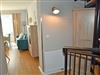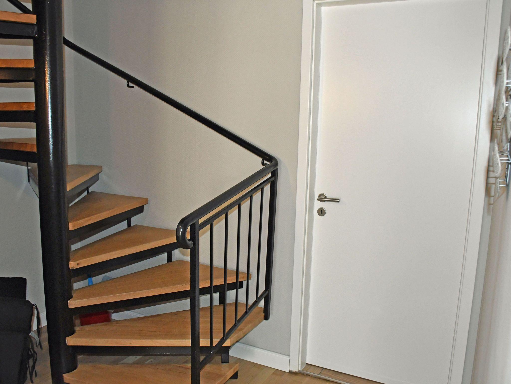 Vom Flur aus gelangt man über die Wendeltreppe in den unteren Wohnbereich der Ferienwohnung mit Küche, Wohn- und Essbereich, sowie dem Zugang zur in westlicher Richtung ausgerichteten Terrasse. Die Wohnungen sind ausgestattet mit einem Parkettboden im warmen Holzfarbton, weißen Fenstern und Zimmertüren.