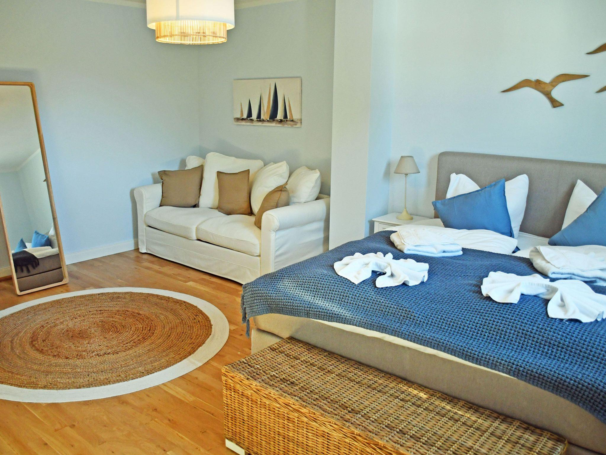 Jede der Wohnungen wird ebenerdig über die Eingangstür betreten. Hier erstreckt sich gleich rechtsseitig ein kleines Duschbad, sowie dem Flur folgend ein großzügiger langgezogener Schlafraum. Ein bequemes Boxspringbett (1,80m) mit Nachttischen und Leselampen sorgt hier für hohen Komfort und erholsamen Schlaf der Gäste und bildet den zentralen Punkt des Raumes. Ein 3- türiger Kleiderschrank und eine Kommode bieten ausreichend Stauraum für Kleider, das Schlafsofa im gradlinigen nordischen Stil bietet die Möglichkeit einer zusätzlichen Aufbettung für einen Gast in dem großen Schlafraum. Der große Bettkasten bietet Stauraum für die zur Aufbettung zusätzlich benötigten Bettdecken. Die Fenster können bei Bedarf zum Schlafen verdunkelt werden.