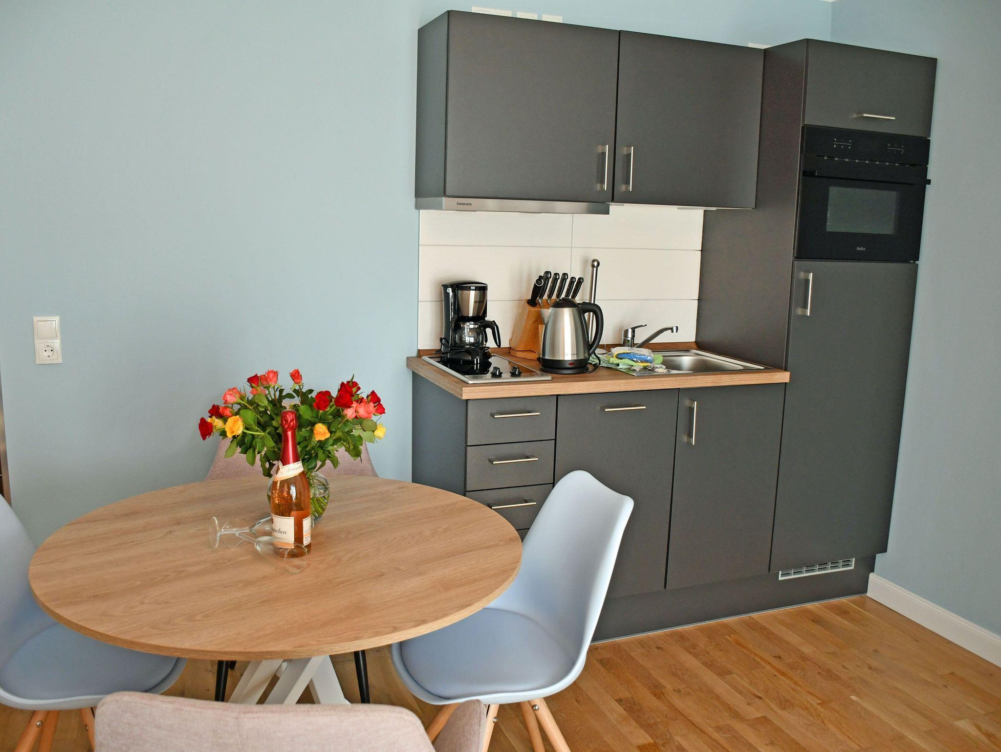 Für die, wie in einer Ferienwohnung üblich, Zubereitung kleiner Mahlzeiten stellt die Küchenzeile ausreichend Möglichkeit dar. Die Küchenzeile ist komplett mit Induktionskochfeld, Backofen, Kühlschrank, Spülmaschine, Kaffeemaschine, Toaster, Wasserkocher und Geschirr ausgestattet. Der runde, robuste und pflegeleichte Esstisch bietet einen Rahmen für gesellige Mahlzeiten.