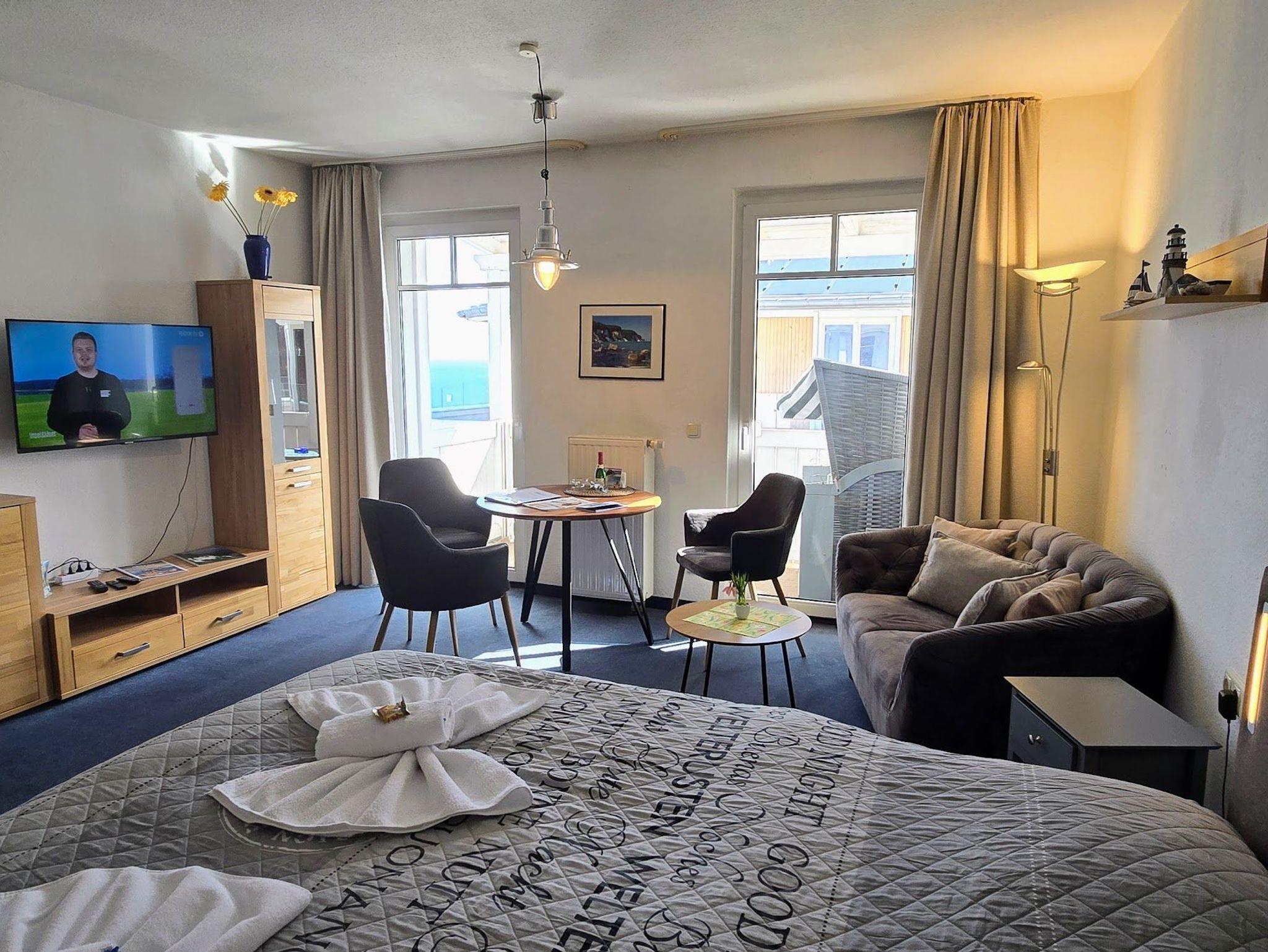 Das 2 Raumapartment in der 4. Etage besteht aus einem Wohnschlafraum mit Doppelbett. Und einem zweiten Zimmer mit Schlafcouch und 2. Fernseher. Möbilierter Balkon auf der Ostseite. Die Küche ist getrennt vom Wohnraum und großzügig ausgestattet. Dusche und WC.Vom Balkon hat man einen schönen Blick auf die Ostsee.