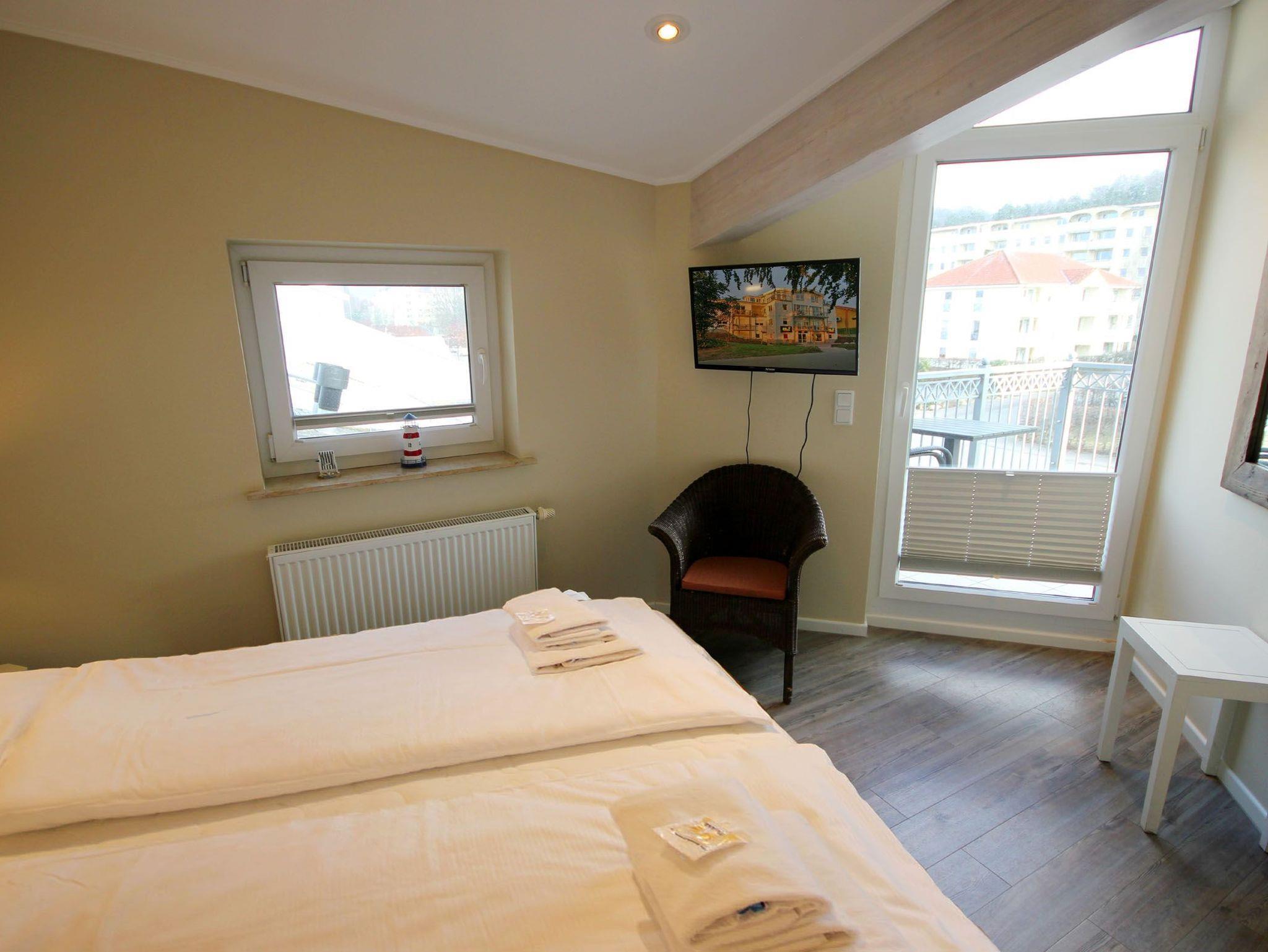 Ihre 2-Zimmer Ferienwohnung 65RB11 Sonne befindet sich im 2. Obergeschoss und ist ca. 50 qm groß. Die Nichtraucherwohnung verfügt über einen Balkon in Richtung Osten und ist für bis zu 2 Personen gut geeignet. Neben dem gemütlichen Wohnbereich mit Zugang zum Balkon, gehört eine Sitzecke, ein Essbereich, Flachbild TV sowie WLAN. Im Schlafzimmer erwartet Sie ein Doppelbett, ein zusätzlicher TV, ein Kleiderschrank sowie ein weiterer Zugang zum Balkon. Zudem können Sie eine voll ausgestattete und im Wohnbereich integrierte Küchenzeile mit Geschirrspüler, Backofen, Wasserkocher, Toaster, Kaffeemaschine sowie umfangreiches Küchengeschirr nutzen. Das moderne Badezimmer erwartet Sie mit Waschtisch, WC und Dusche. Einen Parkplatz sowie eine Fahrradunterstellmöglichkeit befinden sich direkt am Objekt.