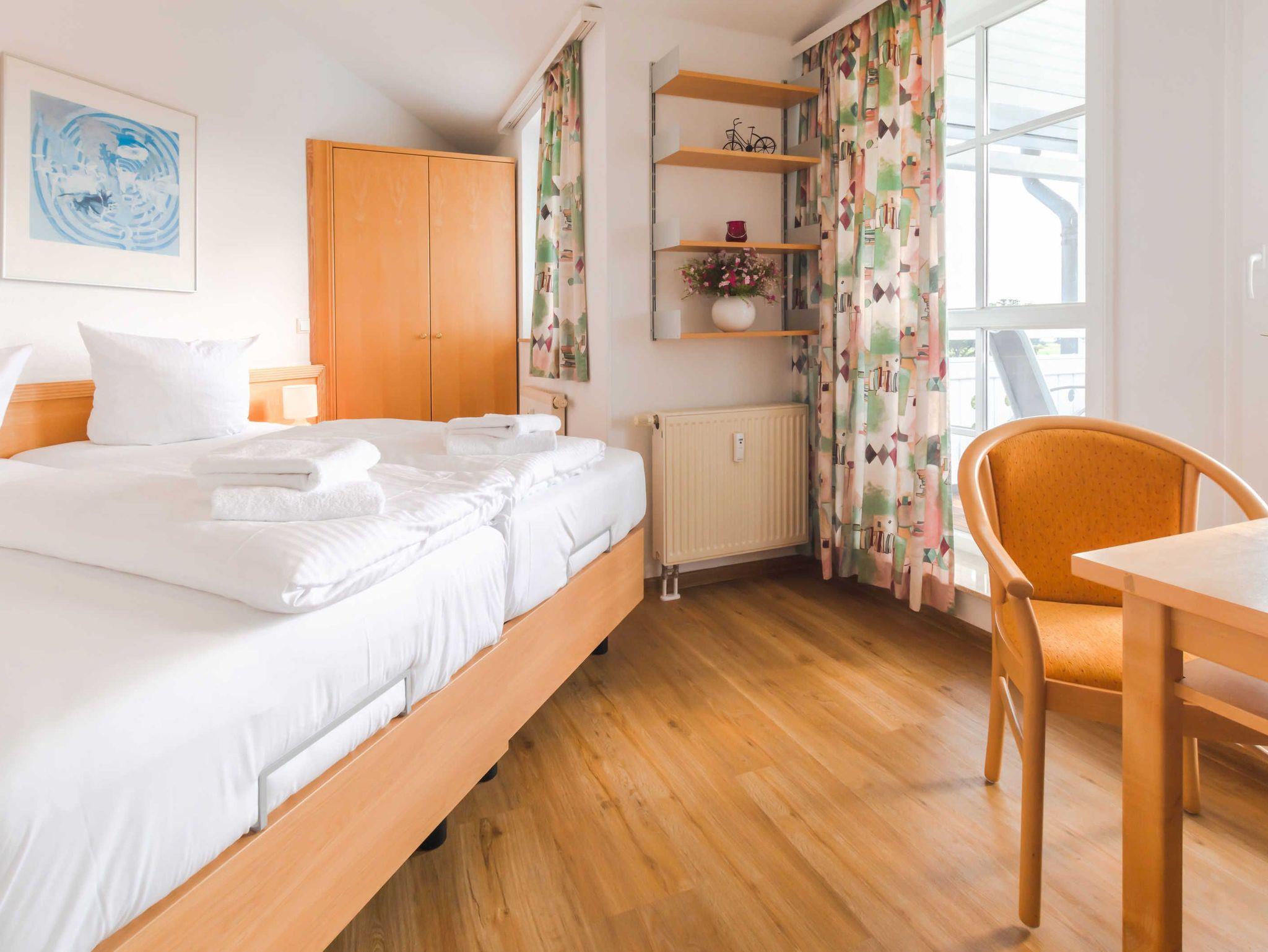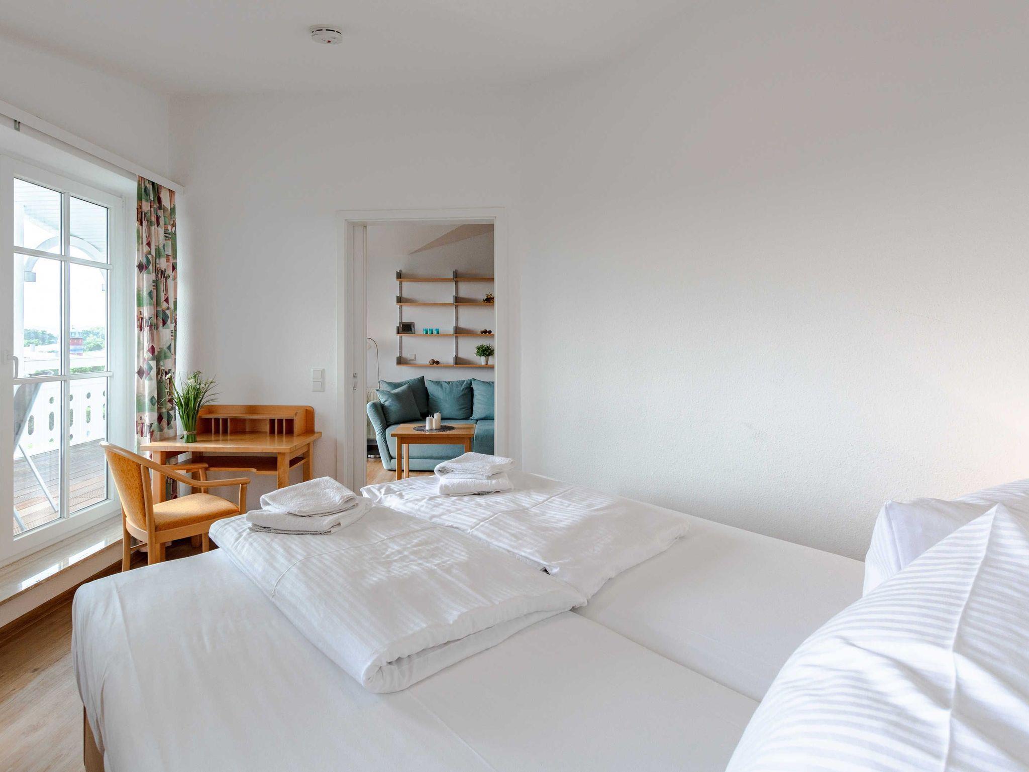 Helles Ferienappartement im Ostseebad Sellin auf Rügen mit 4 Schlafplätzen . ein Schlafzimmer mit Doppelbett und eine Schlafcouch als Aufbettung
