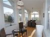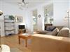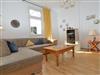 Dieses sehr gemütliche 3-Raum-Appartement verfügt über ca. 95 m² Wohnfläche und befindet sich im Obergeschoss der historischen Bädervilla. Es verfügt über ein großes, helles Wohnzimmer in freundlichen Farben mit einer gemütlichen Sitzecke vor dem Kamin, einem TV und dem Durchgang zur verglasten Loggia im Bäderstil. In der Loggia befinden sich eine kleine Sitzecke und der große Esstisch mit Stühlen für bis 5 Personen.