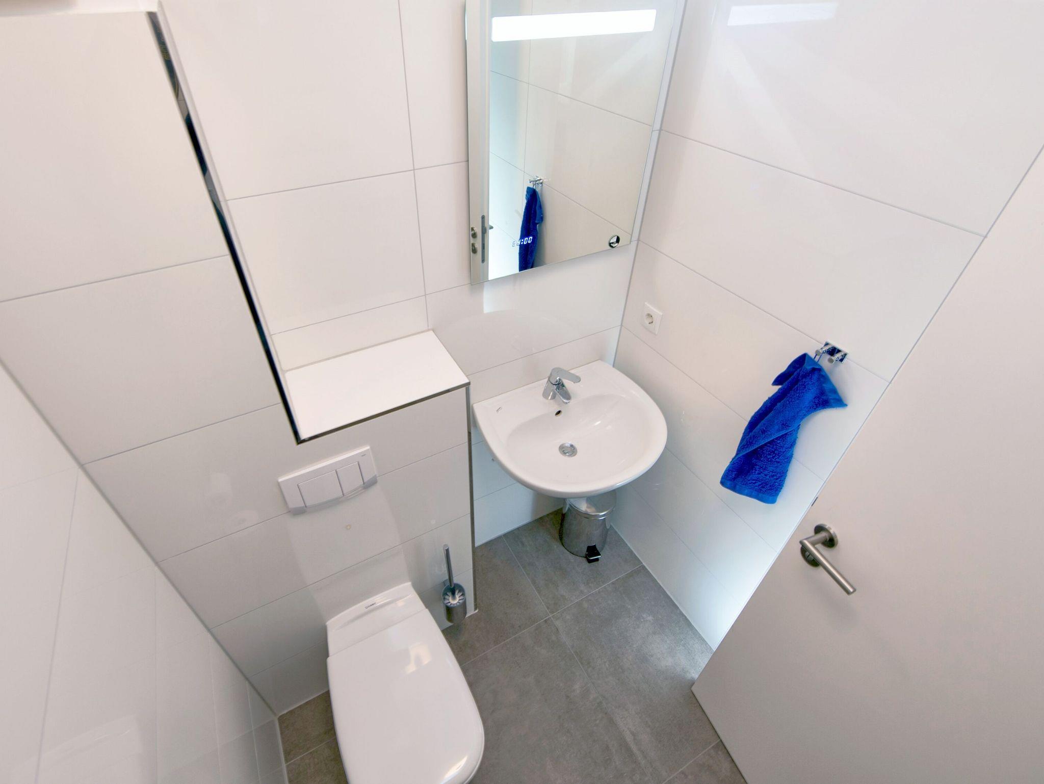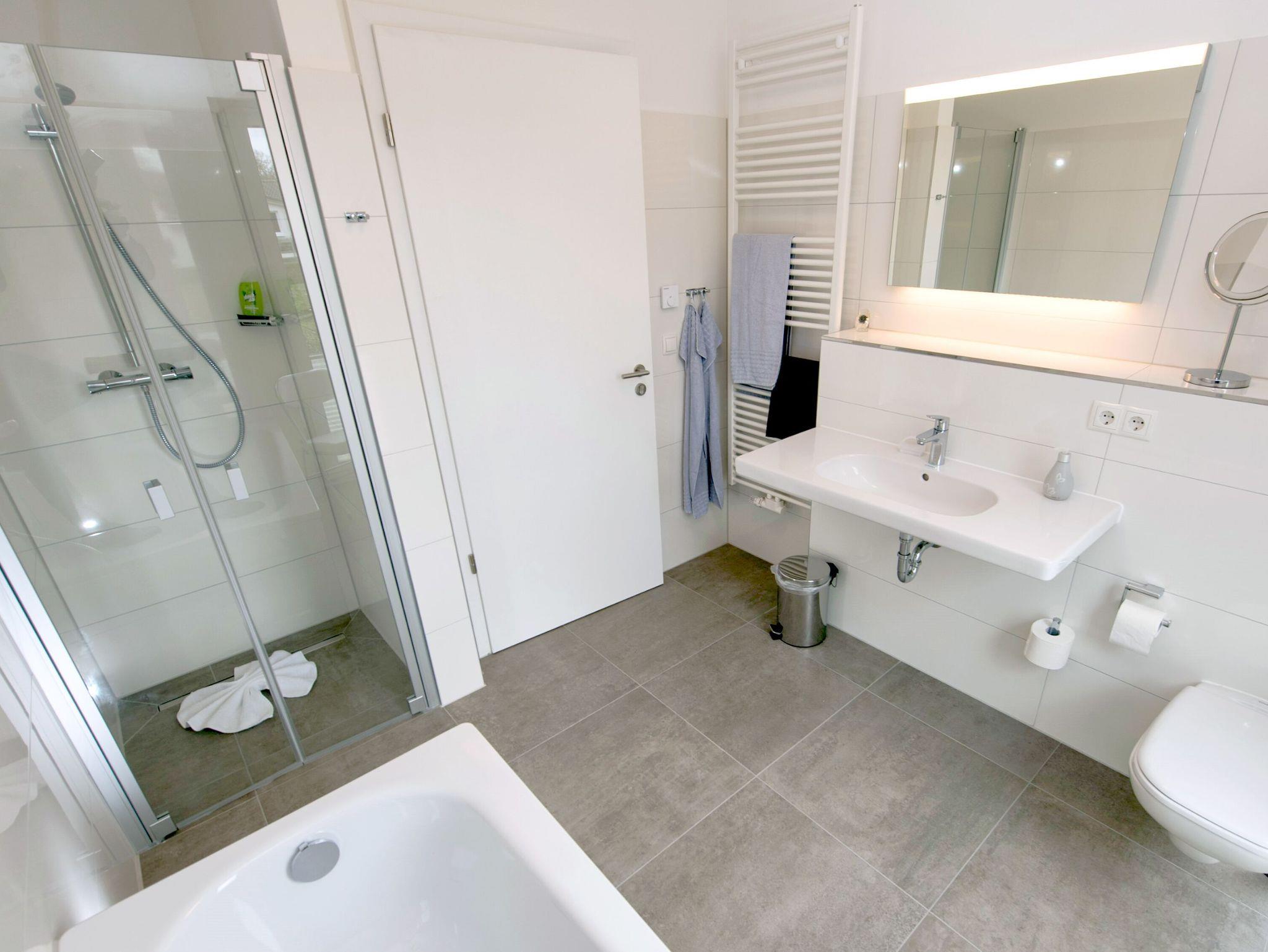 Im modernen Duschbad gibt es neben einer großzügigen, ebenerdigen Dusche auch eine Badewanne. Außerdem ist ein separates WC mit Waschtisch vorhanden.