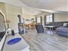 Die harmonisch im Wohnbereich integrierte Küchenzeile ist ausgestattet mit einem Kühlschrank mit Gefrierfach, einem 4-Platten-Cerankochfeld, einem Backofen, einer Geschirrspülmaschine, einer Mikrowelle, Wasserkocher, Kaffeemaschine, Toaster und diversem Kleininventar, das die Küchenausstattung komplettiert.