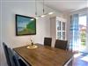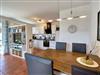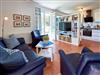 Der Wohnraum ist aufgeteilt in eine gemütliche Sitzecke aus Leder mit einem bequemen Sofa, zwei Sesseln und Couchtisch und einen Essbereich mit einem Esstisch für vier Personen sowie einer Küchenzeile. Hier befinden sich ein Kühlschrank mit Gefrierfach, Geschirrspüler, 4-Platten-Cerankochfeld, Backofen, Mikrowelle und diverse Kleingeräte, die die Ausstattung vervollständigen.