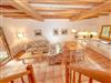 Die Haushälfte 2 erstreckt sich auf zwei Etagen über ca. 100 m² Wohnfläche und verfügt im Erdgeschoss über ein großes und funktional eingerichtetes Wohnzimmer, das durch die offenen Balken besonders gemütlich wirkt. Die Terrasse zur Westseite ist mit Sonnenliegen und Sitzgruppe ausgestattet.