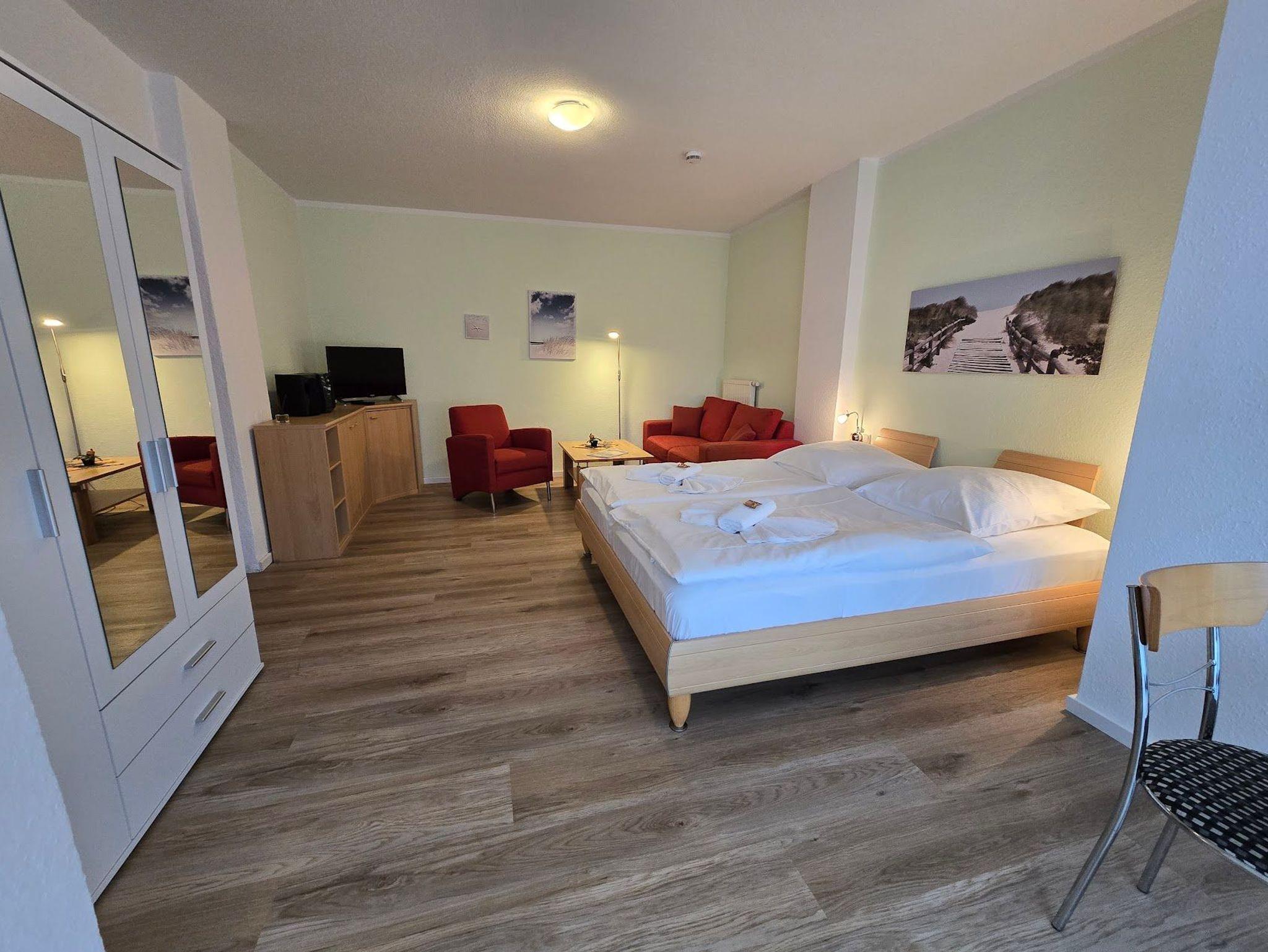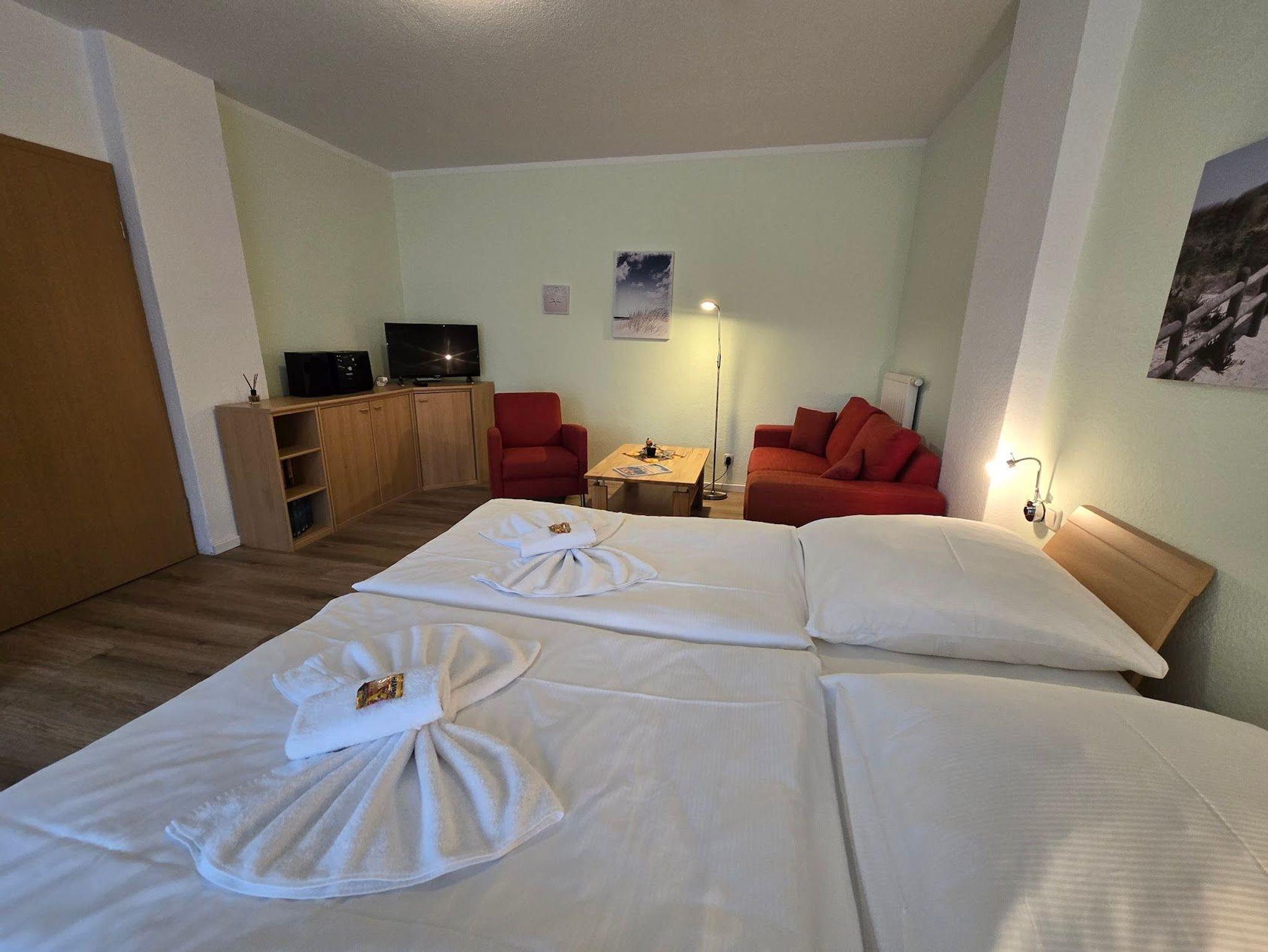Das 1 Raumappartement hat einen Wohn-Schlafraum mit Doppelbett für 2 Pers.und einer ausziehbaren Couch, Kabel-TV,CD Stereoanlage ,Esstisch, gut ausgestattete Küchenzeile mit Geschirrspüler, Kaffeemaschine, Toaster und Microwelle. Babybett ( ohne Wäsche )und Hochstuhl für die Kleinen stellen wir zur Verfügung ( bitte vorbestellen ) .