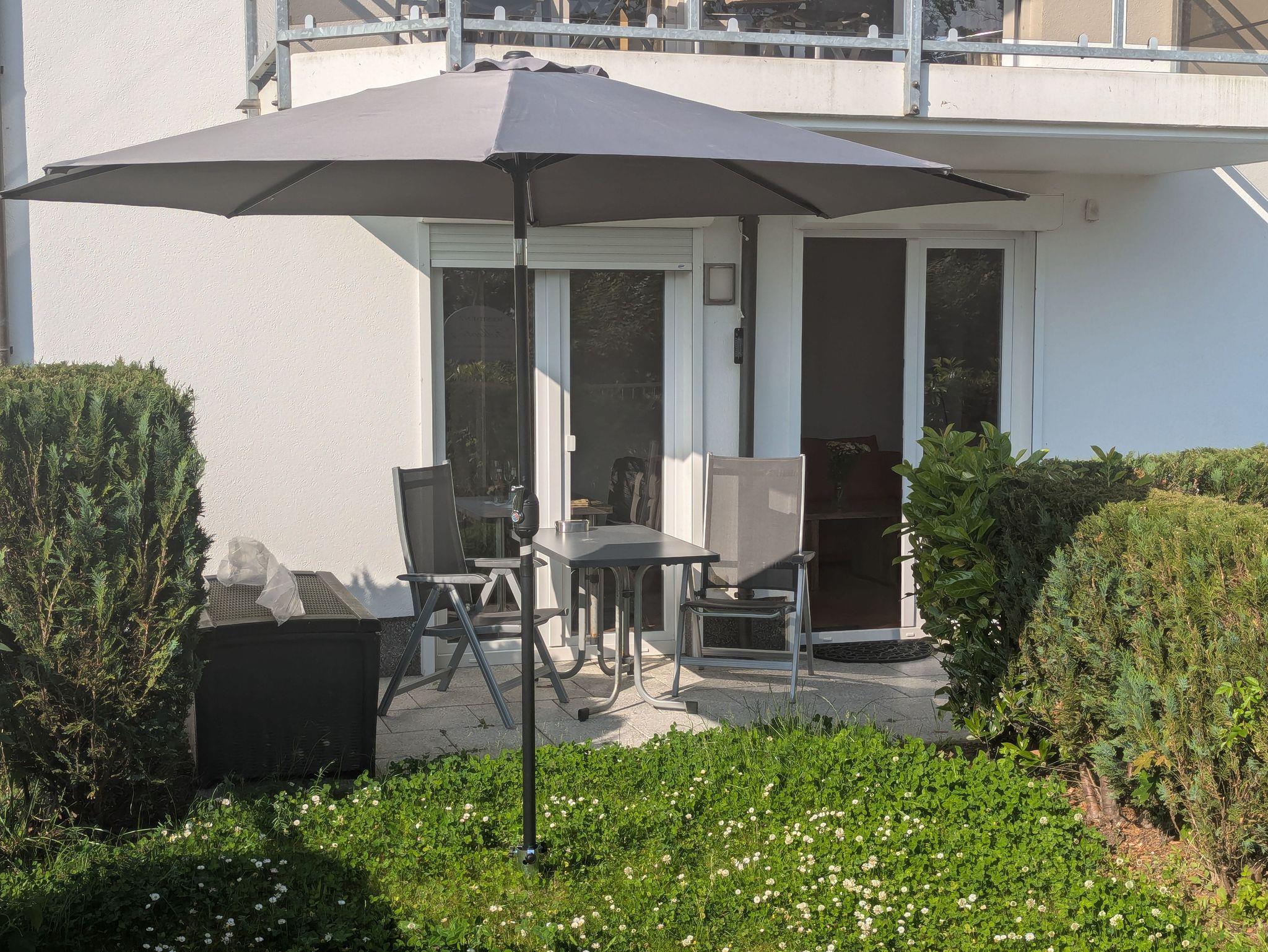 Die möblierte Terrasse mit Sonnenschirm lädt zu gemütlichen Stunden an der frischen Luft ein. Ein privater Parkplatz direkt am Haus rundet das Angebot ab. Haustiere sind nicht erlaubt, was für Allergiker angenehm sein kann.