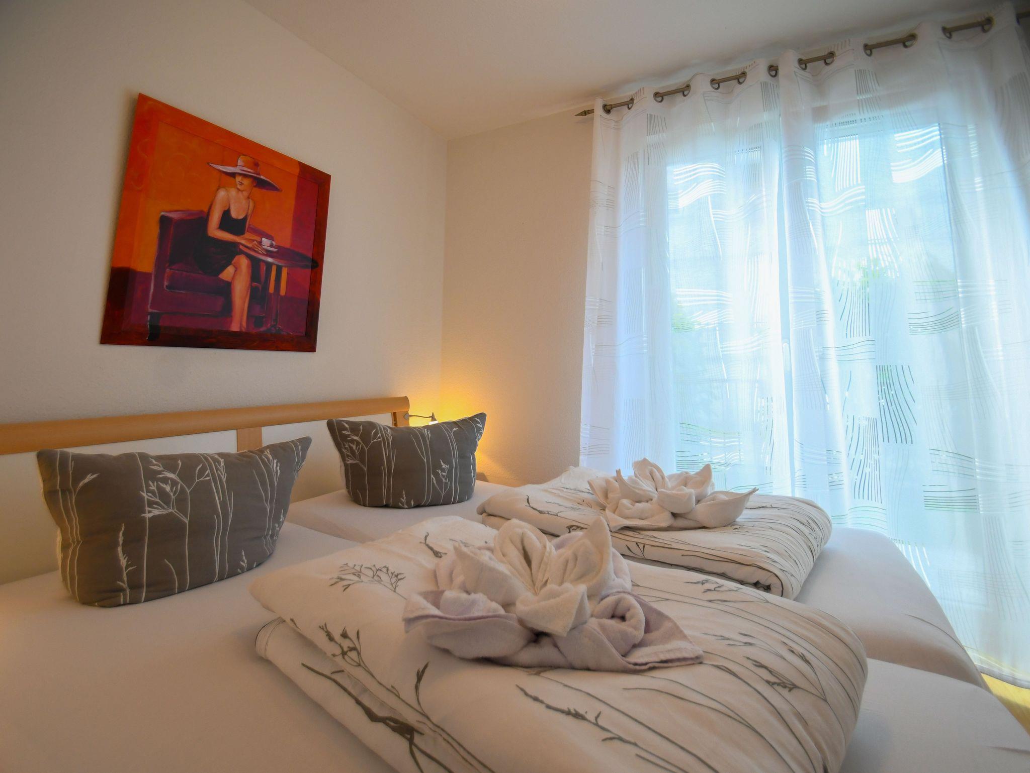 Im separaten Schlafzimmer sorgt ein Doppelbett mit Nachttischen und Leselampen für erholsame Nächte. Der geräumige Kleiderschrank bietet ausreichend Stauraum. Das innenliegende Badezimmer ist funktional und modern mit beheizbarem Handtuchtrockner, Waschtisch, großem Spiegel, Kosmetikspiegel, WC und Fön ausgestattet.