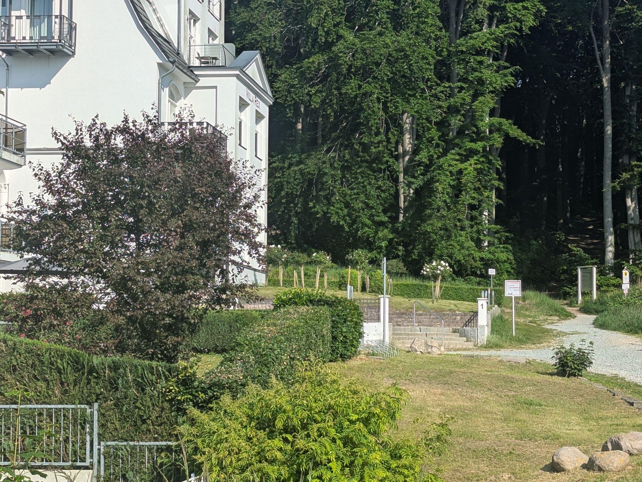 Die Wohnung befindet sich nur ca.300 m vom feinen kilometerlangen Hauptstrand entfernt und liegt direkt am Hochufer Wanderweg nach Binz . ( 2. Haus vor dem wunderschönen Buchenwald ) Die Wilhelmstrasse mit den einzigartigen Villen in Bäderarchitektur befindet sich in unmittelbarer Nähe.