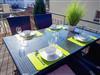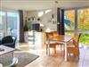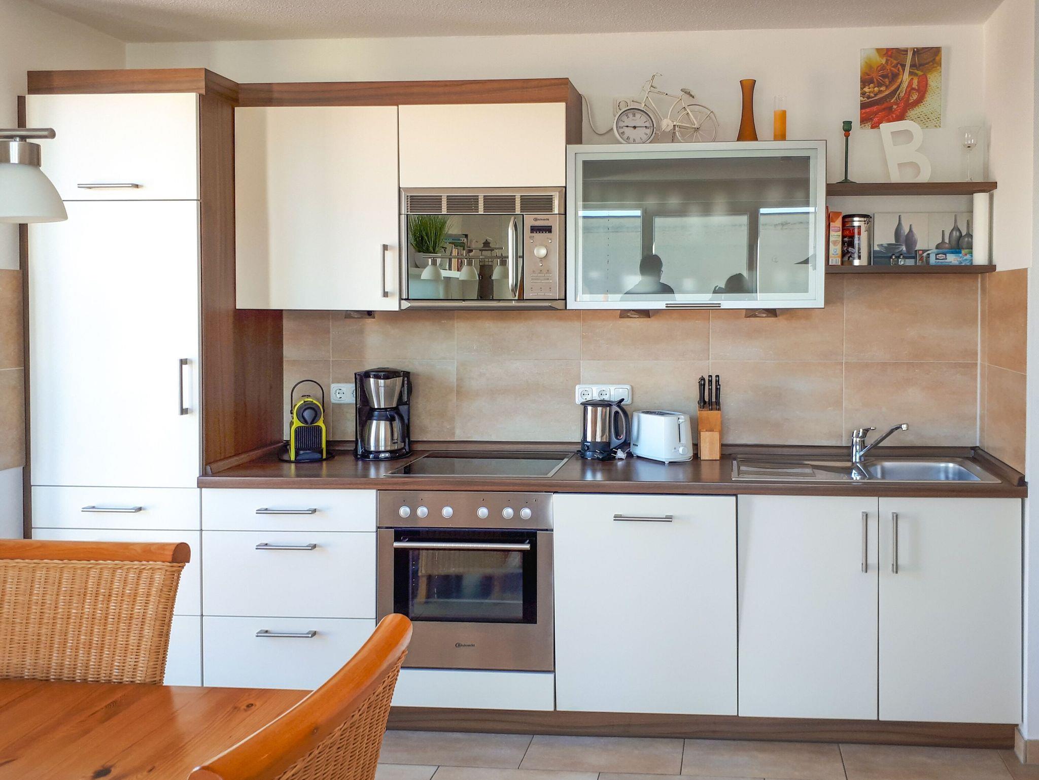 Vom Eingangsbereich aus gelangen Sie über den Flur in den modern ausgestatteten Wohnbereich mit einem LCD-Fernseher mit integrierter Stereoanlage und DVD-Player sowie einem großen Esstisch und integrierter Küchenzeile. In dieser finden Sie einen Kühlschrank mit Gefrierfach, einen Backofen, ein 4-Zonen-Cerankochfeld, eine Spülmaschine sowie Mikrowelle, Toaster, Mixer, einen Eierkocher für das morgendliche Frühstücksei und diverses Kleininventar, das die Küchenausstattung komplettiert.
