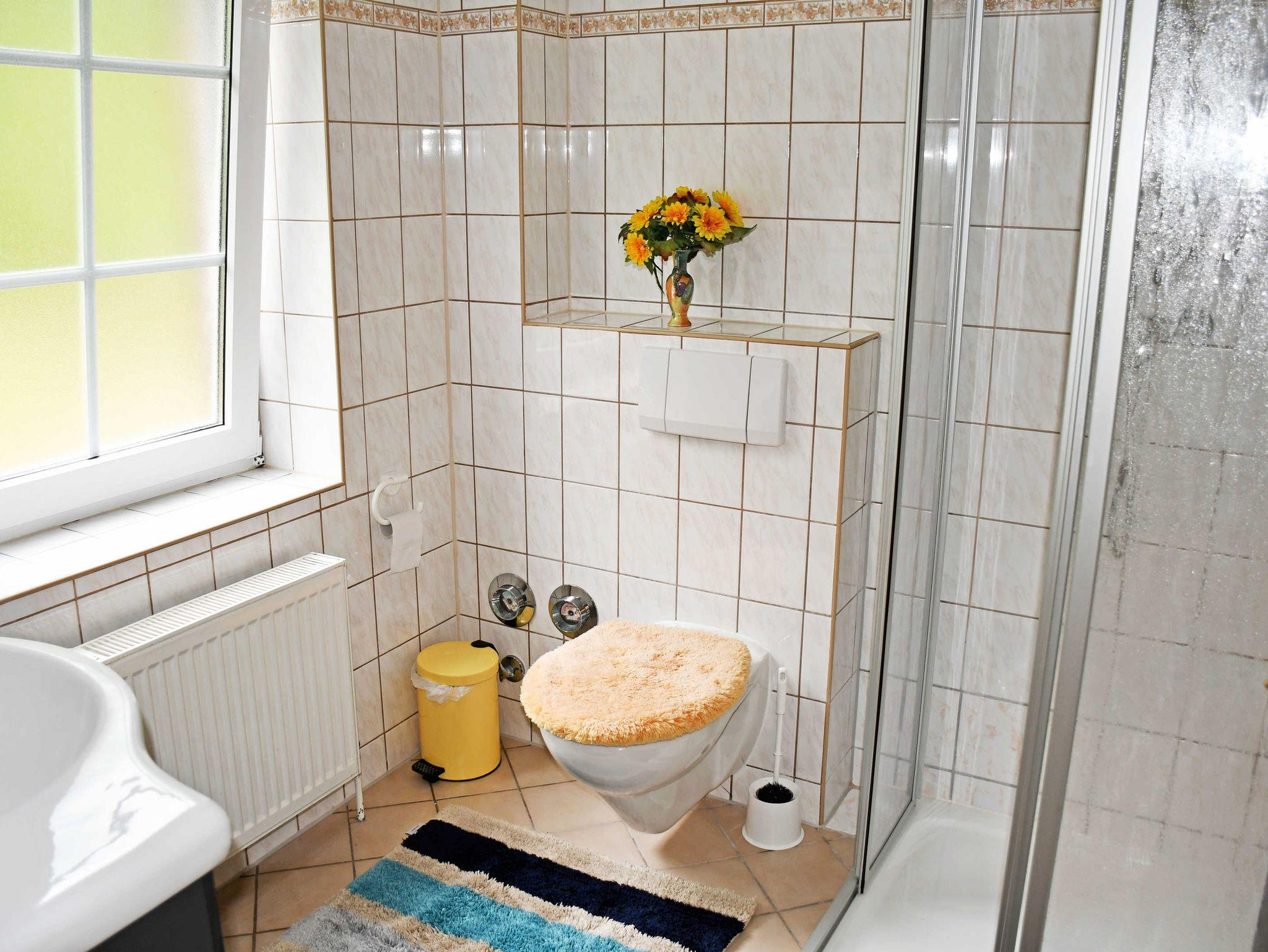 Das moderne Bad ist mit Dusche, WC und Waschtisch ausgestattet und verfügt über Tageslicht.