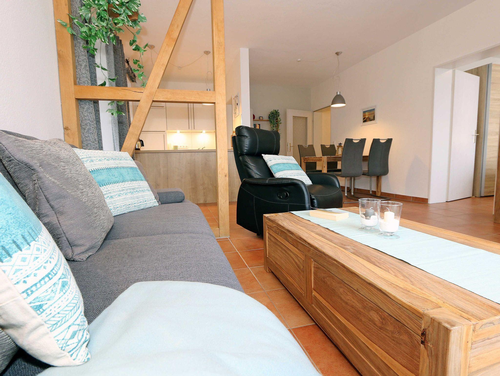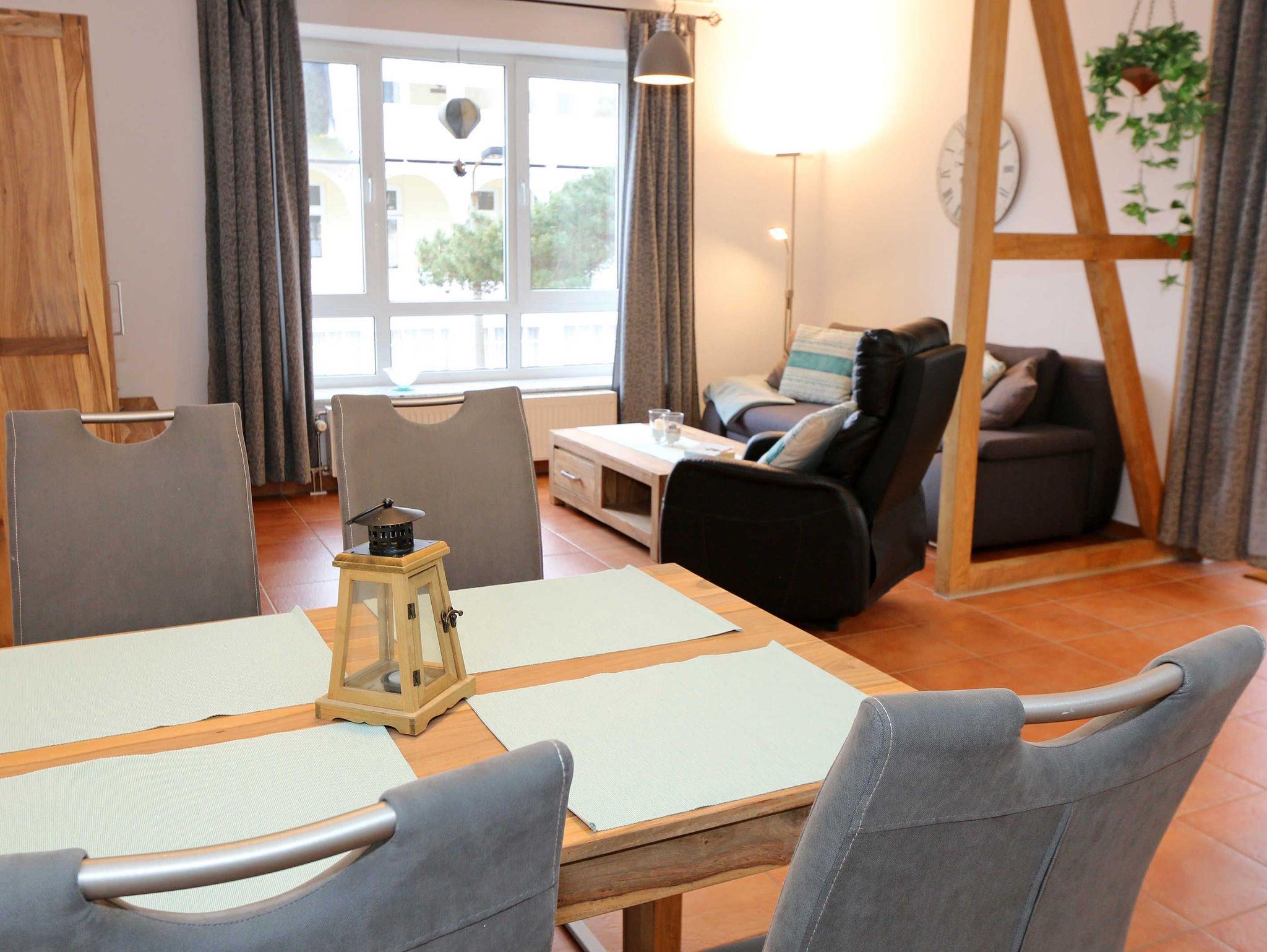 Die ausgestattete 2-Raum-Nichtraucher-Wohnung im 1. OG des ?Haus Holstein? liegt am erweiterten Kurpark, direkt am Friedensberg mit hervorragender Wohnqualität und verfügt über ca. 63 qm Wohnfläche. Der geräumige Flur ist mit einer Garderobe sowie einem integrierten Abstellraum ausgestattet. Der 13 qm große und überdachte Balkon (Süden) mit Komfort-Bestuhlung und Sonnenliege ist vom Wohnbereich aus begehbar. Die Wohnung ist für 2 bis max. 4 Erwachsene ausgestattet und besteht aus einem Wohnbereich mit einer Couch (Aufbettung für 3./4. Person, 1,50 m x 2,00 m), massivem Couchtisch, einem Funktions-Sessel, einer Stehlampe sowie einer Vitrine. Der technische Bereich wird durch einen LED-TV, einen DVD-Player, einer Mini-Stereo-Anlage mit Bluetooth und USB-Anschluss sowie Internet (WLAN) abgerundet. Der Internetzugang (WLAN) ist für Sie inklusive. Die großzügige Essecke umfasst einen massiven Vollholz-Tisch und vier dazugehörige Stühle. Die angrenzende und offene Küchenzeile bietet Ihnen einen Kühlschrank mit Gefrierfach, einen Backofen mit 4 Zonen Induktionskochfeld, einen Geschirrspüler, einer Mikrowelle, einer Kaffeemaschine, einen Toaster, einen Eierkocher, einen Handmixer, einen Wasserkocher sowie viele kleine Küchenutensilien. Im Schlafzimmer befindet sich ein Doppelbett (1,80 m x 2,00 m) mit einer Komforthöhe über 60 cm, Kaltschaum-Wendematratzen H2/H3, zwei Nachttischablagen und einen großen Kleiderschrank. Ein großer Ganzkörperspiegel rundet den Raum ab. Das innenliegende Bad ist mit einem Waschplatz mit beleuchtetem Spiegel, einer Dusche mit flachem Einstieg, Fön, WC, Handtuchhalter sowie einer Waschmaschine versehen. Im Abstellraum finden Sie kleine Helfer wie einen Staubsauger, ein Bügeleisen mit Bügelbrett und einen Wäscheständer für den Balkon. Alle Räumlichkeiten sind in der Wohnung gefliest und haben jeweils ein Insektenschutzgitter. Haustiere sind nicht erlaubt. Ein überdachter PKW-Stellplatz Nr. 12 (max. 2 m Höhe) befindet sich direkt unterm Haus. Im Gemeinschaftskeller stehen Ihnen eine Münzwaschmaschine und ein Münztrockner zur Verfügung. Abstellmöglichkeiten für Fahrräder sind gegeben. Die Erstausstattung eines Wäschepaketes (komplette Bettwäsche, 1 Duschhandtuch, 1 kleines Handtuch) können Sie bis 14 Tage vor Anreise gegen einen Aufpreis dazu buchen oder durch eigene ergänzen. Ab 2 gebuchten Paketen erhalten Sie einmalig 1 Geschirrhandtuch und 1 Duschvorleger hinzu.