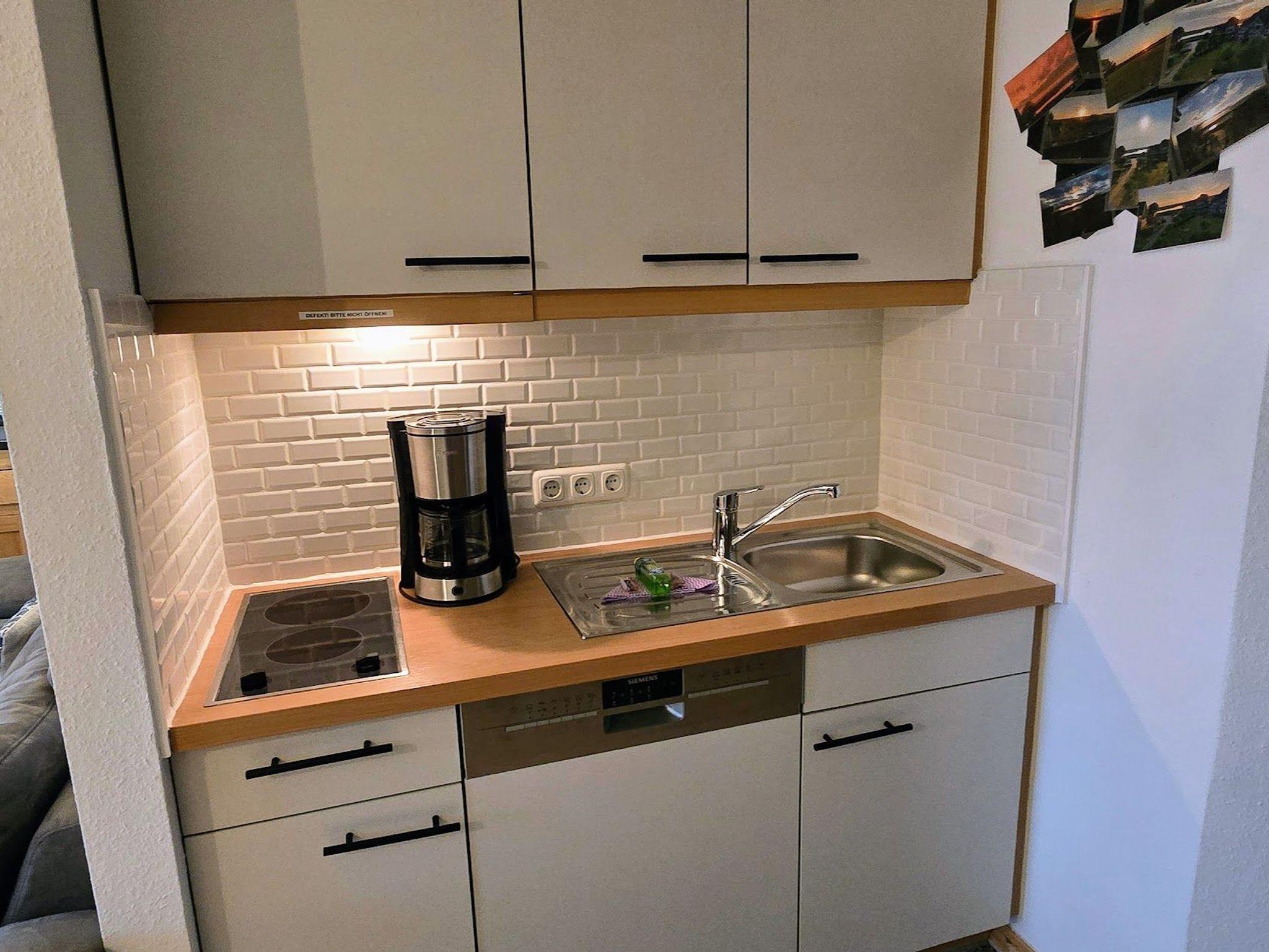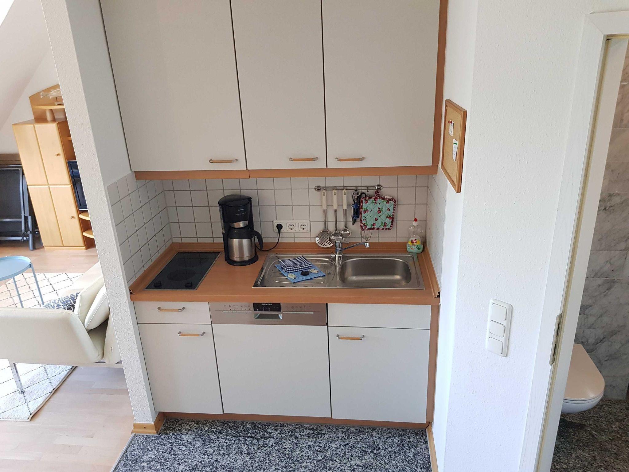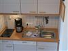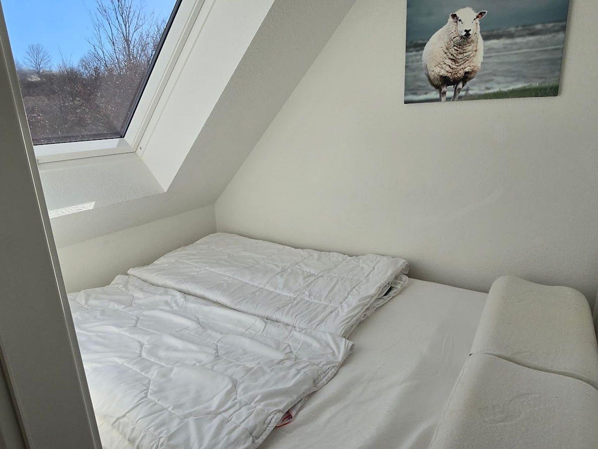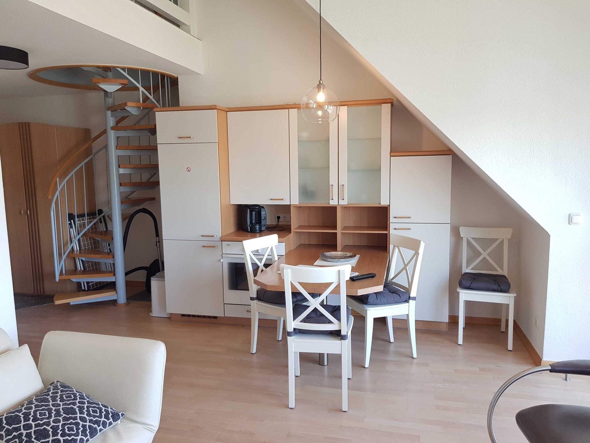 Die Wohnung 06 im Haus Granitz ist eine 3-Zimmer-Maisonette-Wohnung mit Galerie, die bis zu 4 Personen Platz und Komfort bietet. Sie befindet sich im Ober- und Dachgeschoss und hat eine Größe von ca. 54 qm. Sowohl vom Balkon, als auch aus dem Wohnraum hat man einen schönen Blick auf den Neuensiener See (und falls die Sonne scheint, auf spektakuläre Sonnenuntergänge). Der Wohnbereich ist mit einer hochwertigen Multifunktionscouch sowie einem Schwingsessel (beide mit Lederbezug) möbliert. Durch die Angliederung der Bereiche Kochen und Essen ist die Wohnung sehr großzügig. Die Küche ist mit Backofen, Geschirrspüler und Kühlschrank (mit Gefrierfach) ausgestattet, die nötigen Küchenutensilien (neues Geschirr und Besteck) sind in ausreichender Zahl vorhanden. Vom Wohnraum aus erreicht man über eine Wendeltreppe die Galerie, die über einen zum Bett (ca. 190 x 90 cm) ausziehbaren Sessel (als 4. Schlafgelegenheit) verfügt. Daran schließt sich ein Hauptschlafzimmer mit Doppelbett (ca. 200 x 180 cm) sowie ein zusätzliches kleines Schlafzimmer (Koje) mit einem Bett (ca. 200 x 90 cm) an. Selbstverständlich sind die Matratzen sowie die Kopfkissen und Bettdecken neuwertig. Komplettiert wird die Wohnung durch ein in Marmor und Granit gehaltenes Duschbad (mit Duschbatteriethermostat) im Obergeschoss.
