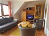 Große offene Maissonette Wohnung mit Doppelbett und kleinem Kinderschlafzimmer. Im Wohnbereich Couch mit zwei Sessel und Esstisch für 4 Personen. Küchenzeile mit Geschirrspüler. Bad mit Dusche und WC, Balkon mit Tisch und Stühle.