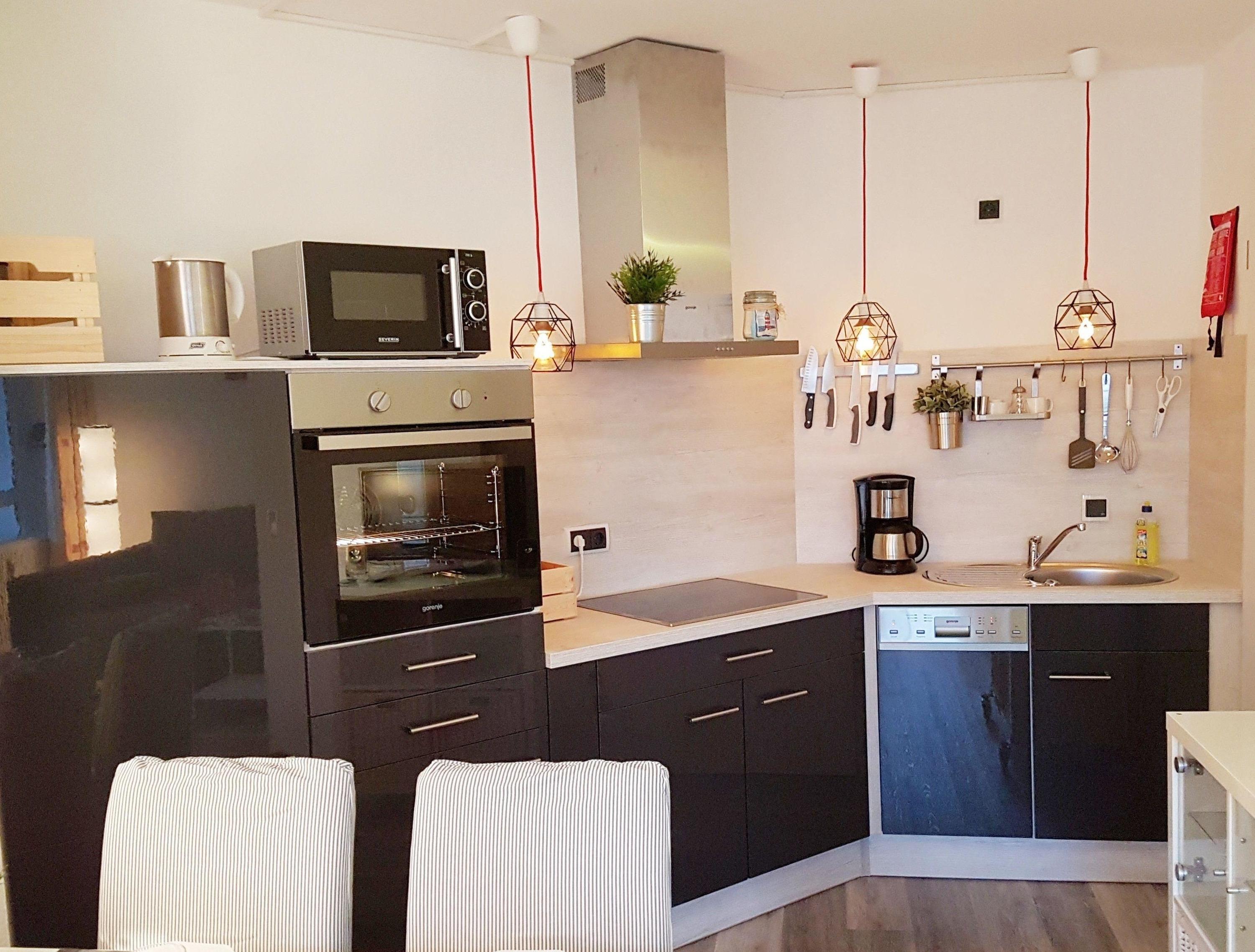 Die Küche bietet einen Umluftofen mit Kochfeld, einen Kühlschrank mit Eisfach, eine Spülmöglichkeit, eine Spülmaschine und die wichtigsten Elektrogeräte wie Mikrowelle, Wasserkocher, Kaffeemaschine und Toaster.
