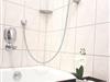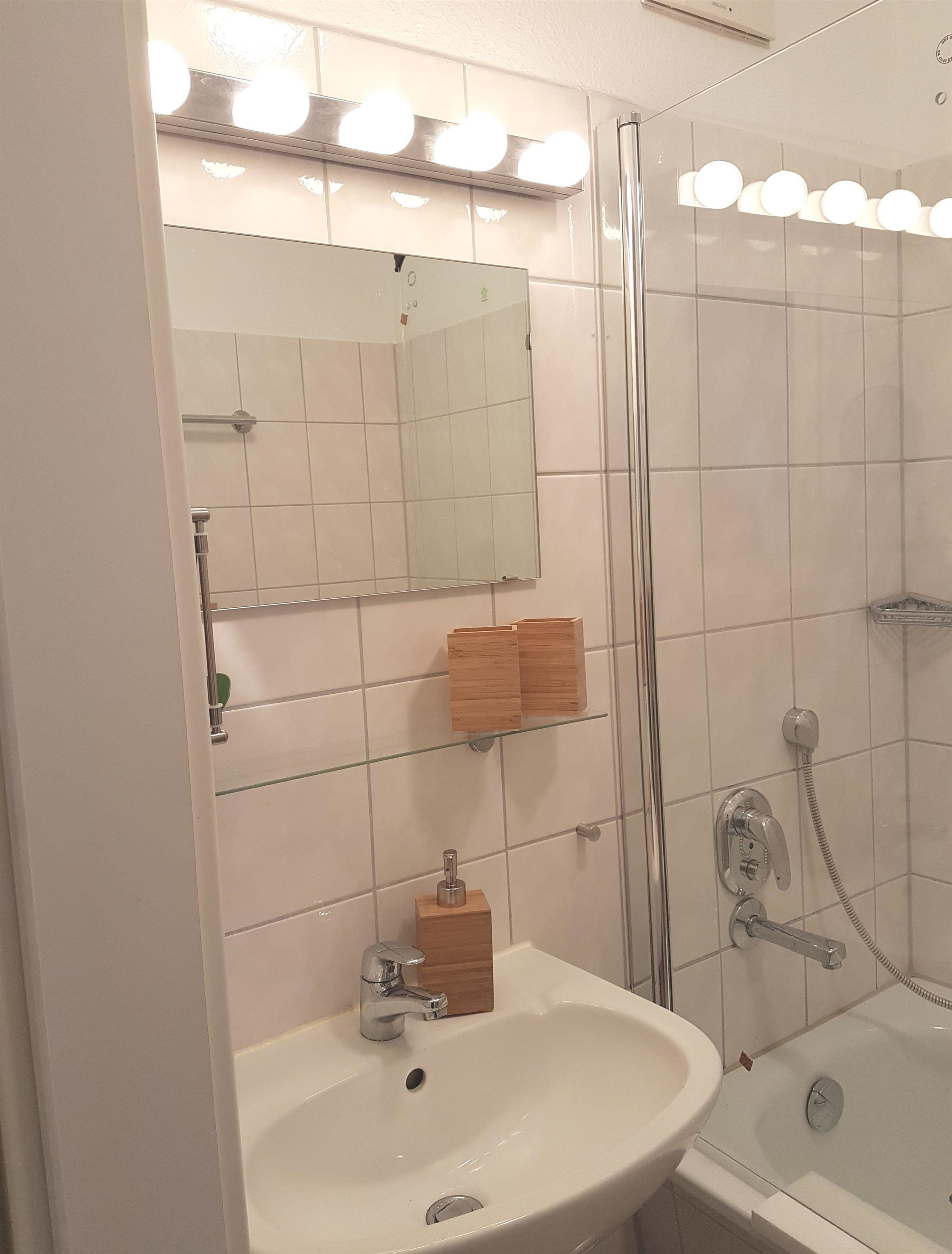 Das Bad besteht aus einer Badewanne mit Dusche und einer Waschmöglichkeit mit Spiegel und Föhn.