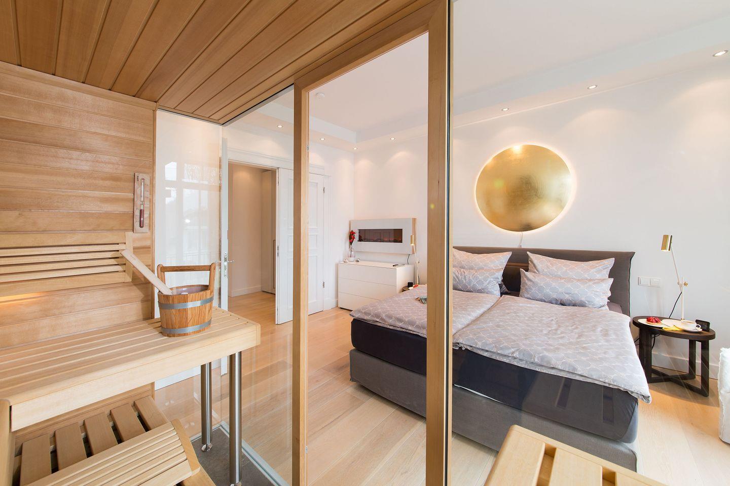 Der Wohlfühlfaktor wird durch exklusive Annehmlichkeiten wie eine wohnungseigene Klafs Sauna und eine Infrarotkabine von Physiotherm erhöht. Ein Massagesessel sowie eine einladende Badewanne bieten weitere Möglichkeiten zur Entspannung. Der Zwei-Seiten-Kamin im großzügigen Wohnzimmer mit Meerblick schafft eine behagliche Atmosphäre und lädt zum Verweilen ein.