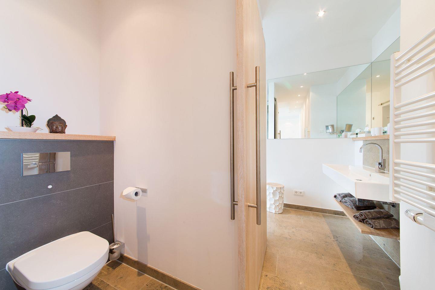 Die Wohnung verfügt über drei geräumige Schlafzimmer, die jeweils mit einem eigenen Badezimmer verbunden sind, sowie einem zusätzlichen Gäste-WC. Jedes Badezimmer ist mit hochwertigen Armaturen ausgestattet und bietet Komfort und Luxus.