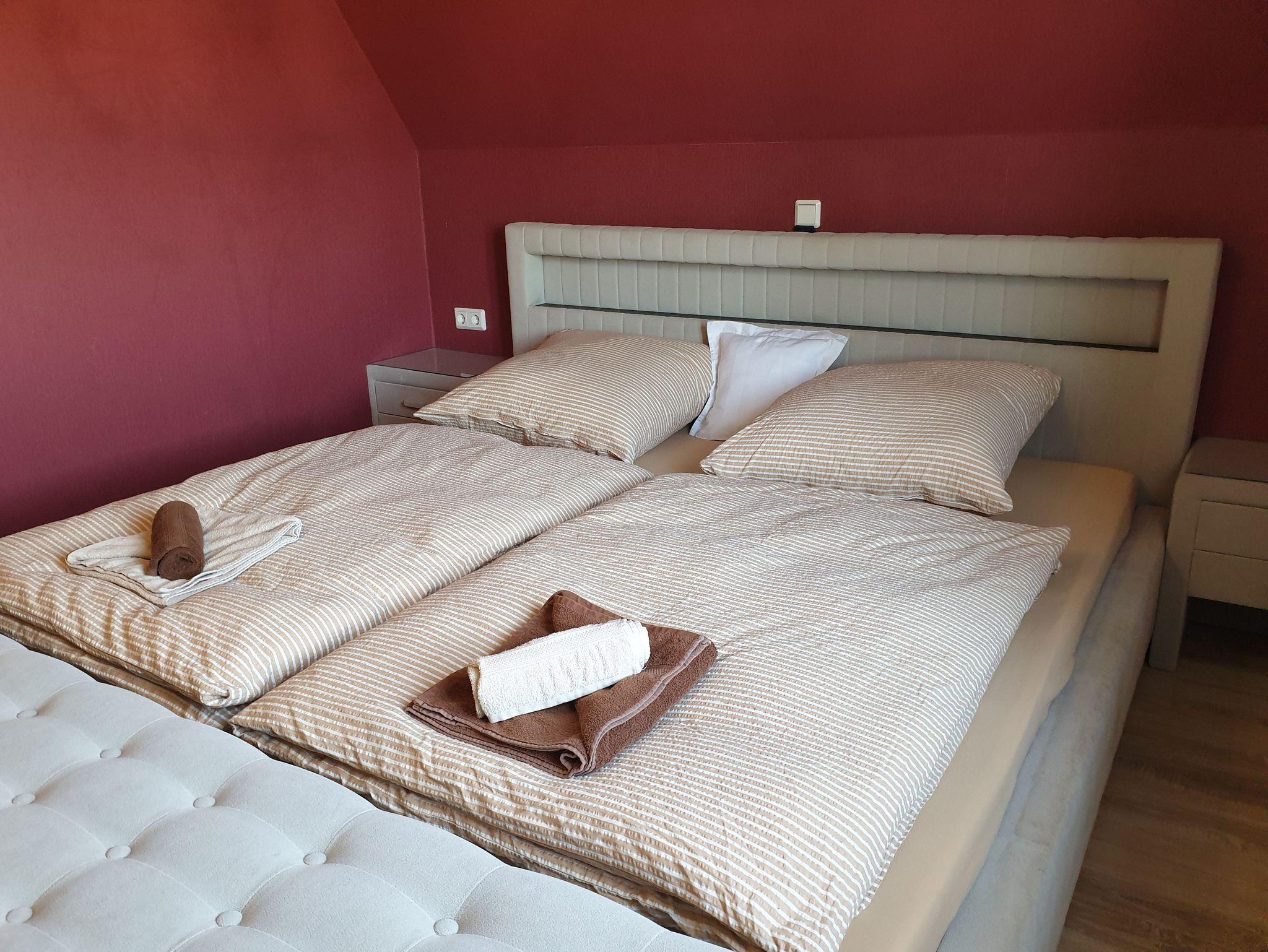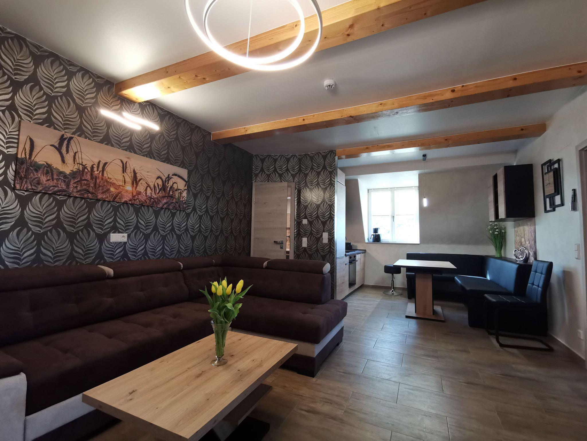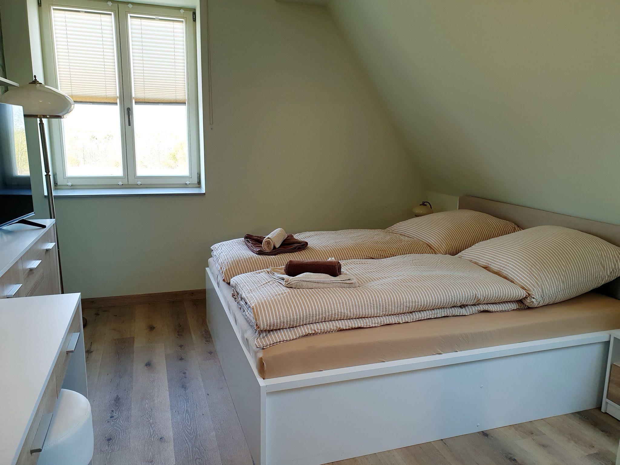 Die Ferienwohnung ist modern eingerichtet und hat 2 getrennte Schlafräume mit je einem Doppelbett, ein offenes Wohnzimmer mit Einbauküche und einem Bad mit Badewanne und Dusche/WC.