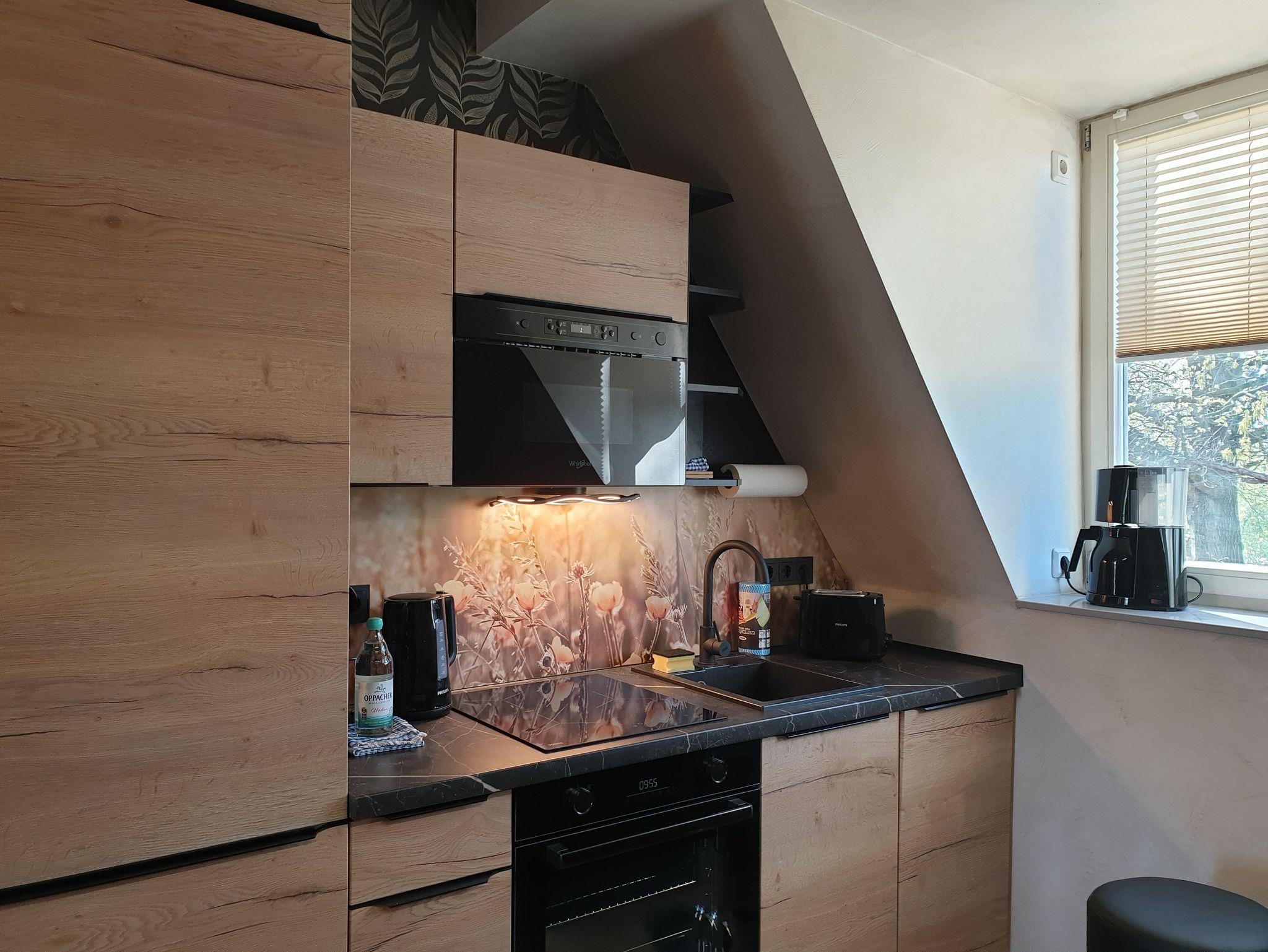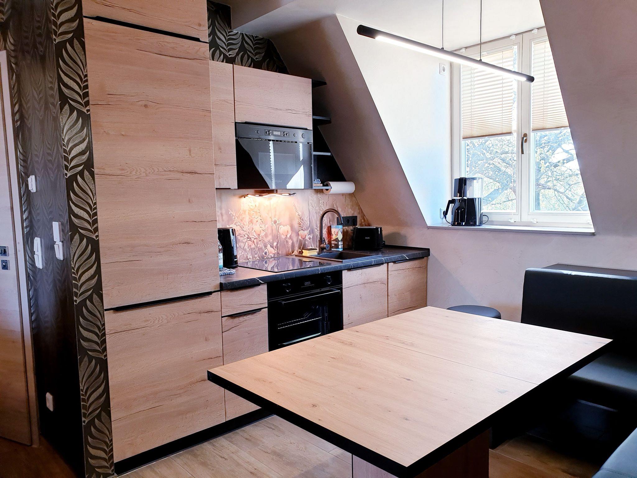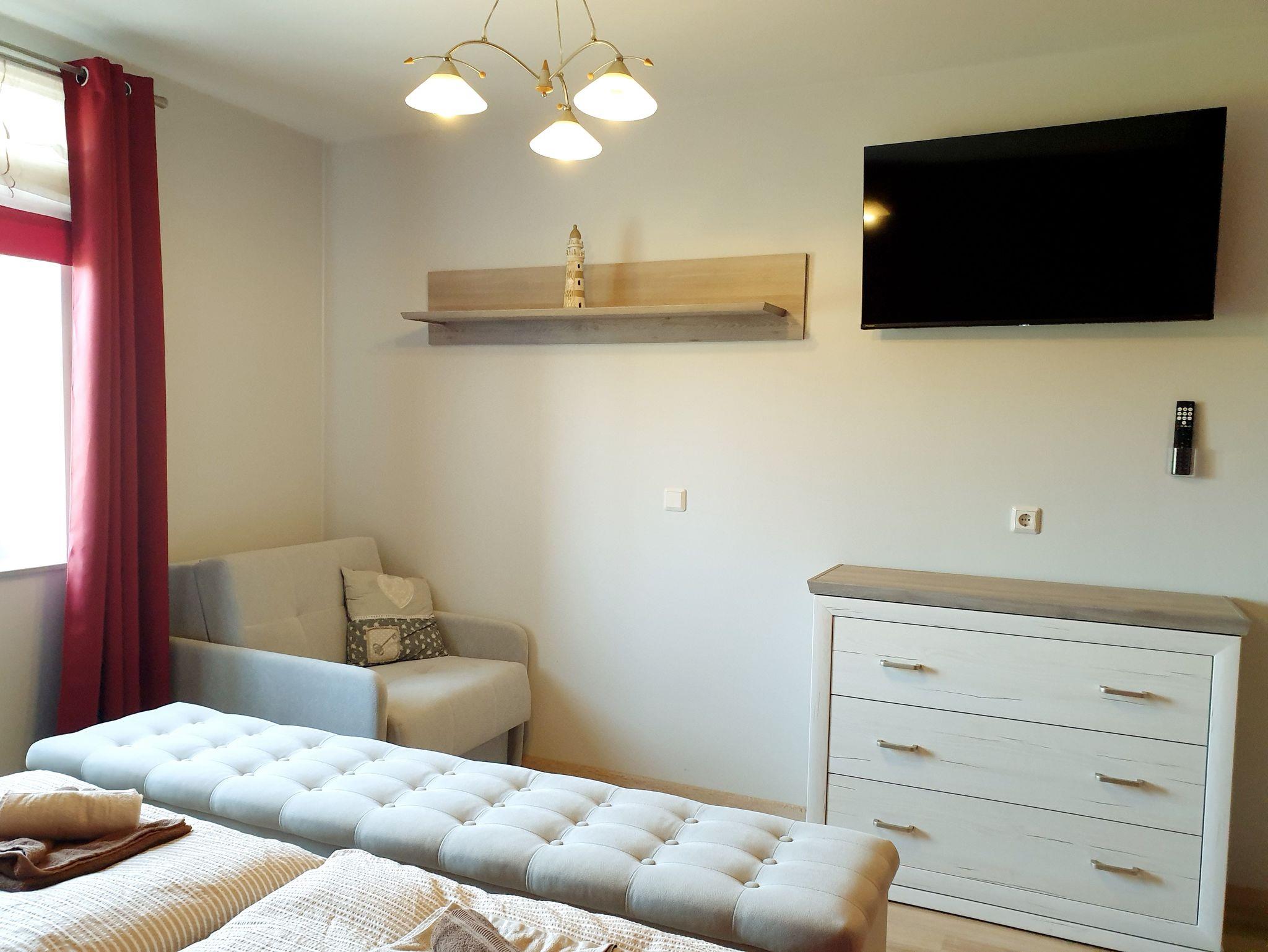 Die Ferienwohnung ist modern eingerichtet und hat 2 getrennte Schlafräume mit je einem Doppelbett, ein offenes Wohnzimmer mit Einbauküche und einem Bad mit Badewanne und Dusche/WC.