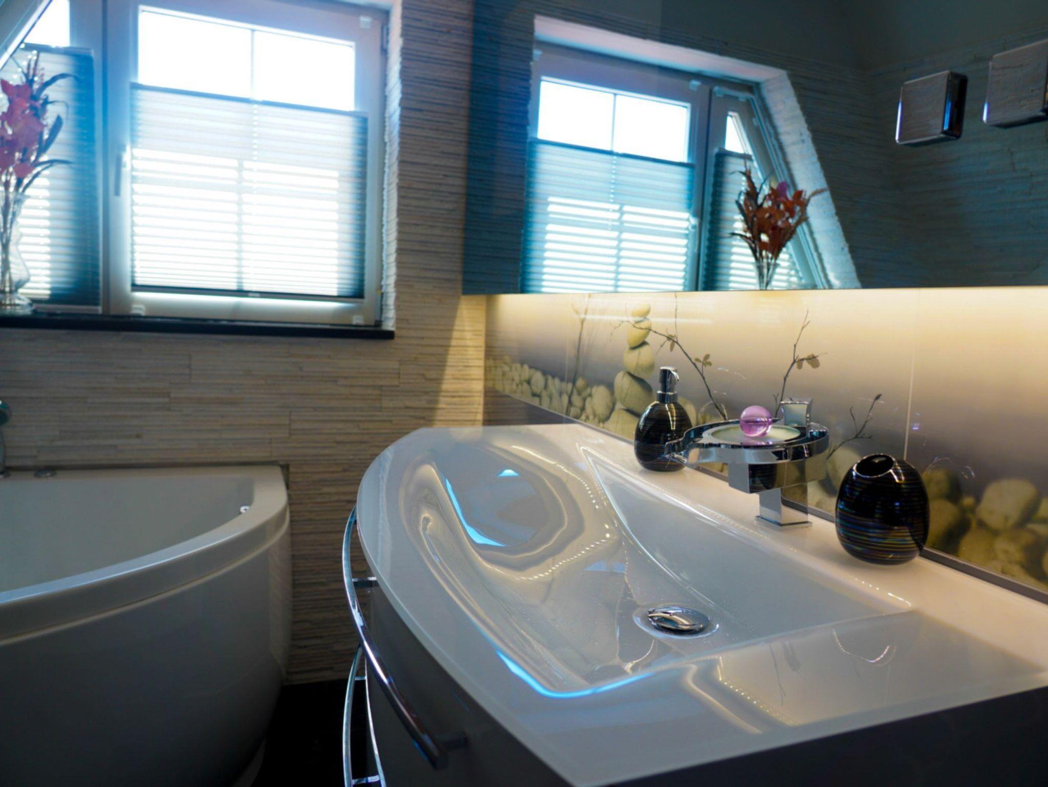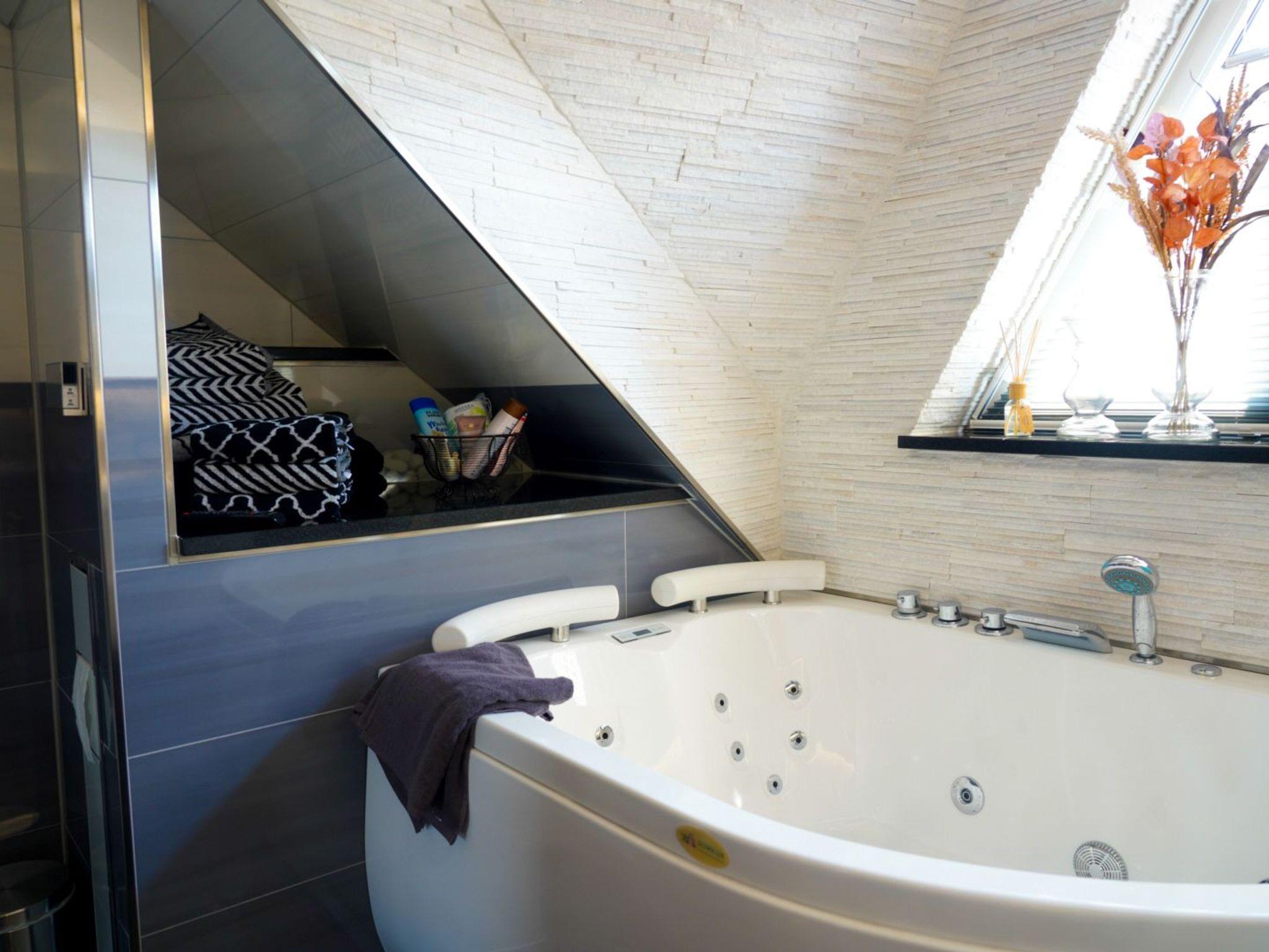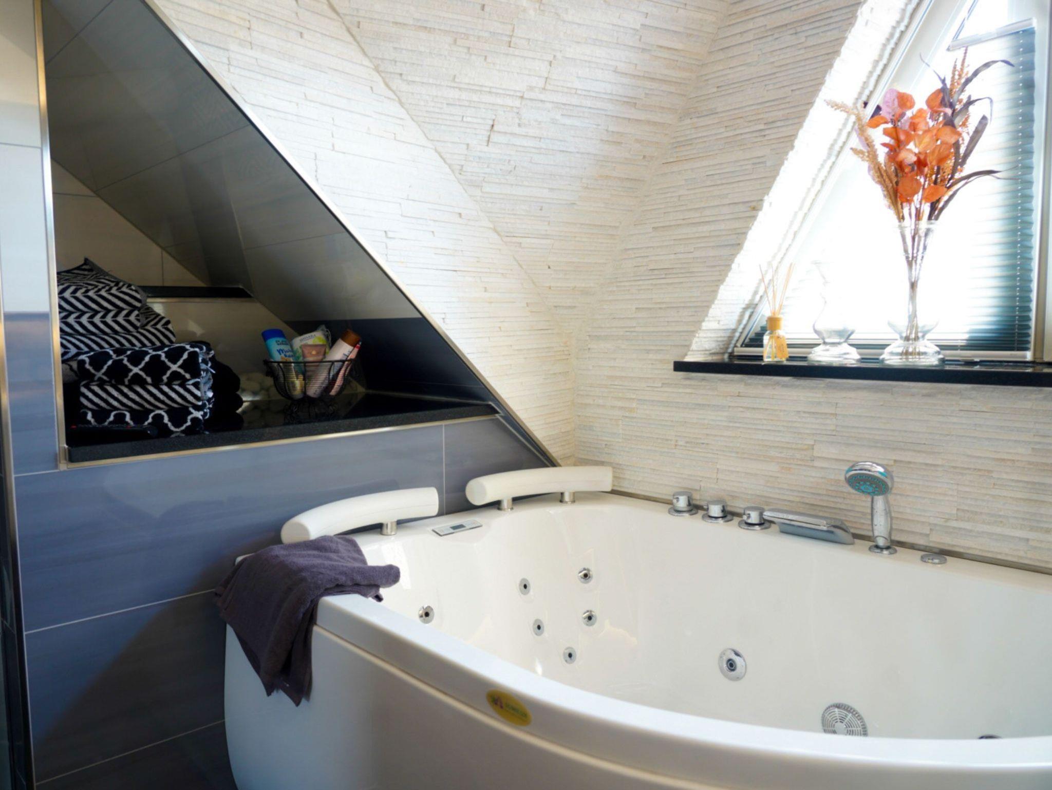 Entspannen Sie im großen Bad und nutzen Sie den gemütlichen Whirlpool samt besonderem Farbspiel und zahlreichen Massagedüsen. Ist Ihnen nebenbei nach ein wenig leichter Unterhaltung, schalten Sie einfach den im Spiegel integrierten Fernseher an und entspannen bei Ihrer Lieblingsserie. Ein tolles Erlebnis bietet unsere Komfortdusche mit einem Farbspiel der besonderen Art. Verschiedene Einstellungen der Düsen lassen Sie noch besser abschalten. Aber auch das WC mit integriertem Bidet sowie eine kleine Auswahl an Hygieneprodukten sorgen für kleine Wellnessmomente. Lassen Sie sich ruhig Zeit und gönnen Sie sich ein paar Minuten mehr. Denn müssen die anderen Gäste auf Toilette, nutzen Sie einfach das Gäste-WC im Erdgeschoss. Handtücher und Fön können Sie übrigens getrost Zuhause lassen, damit in Ihrem Koffer mehr Platz für ein weiteres Urlaubsoutfit bleibt.