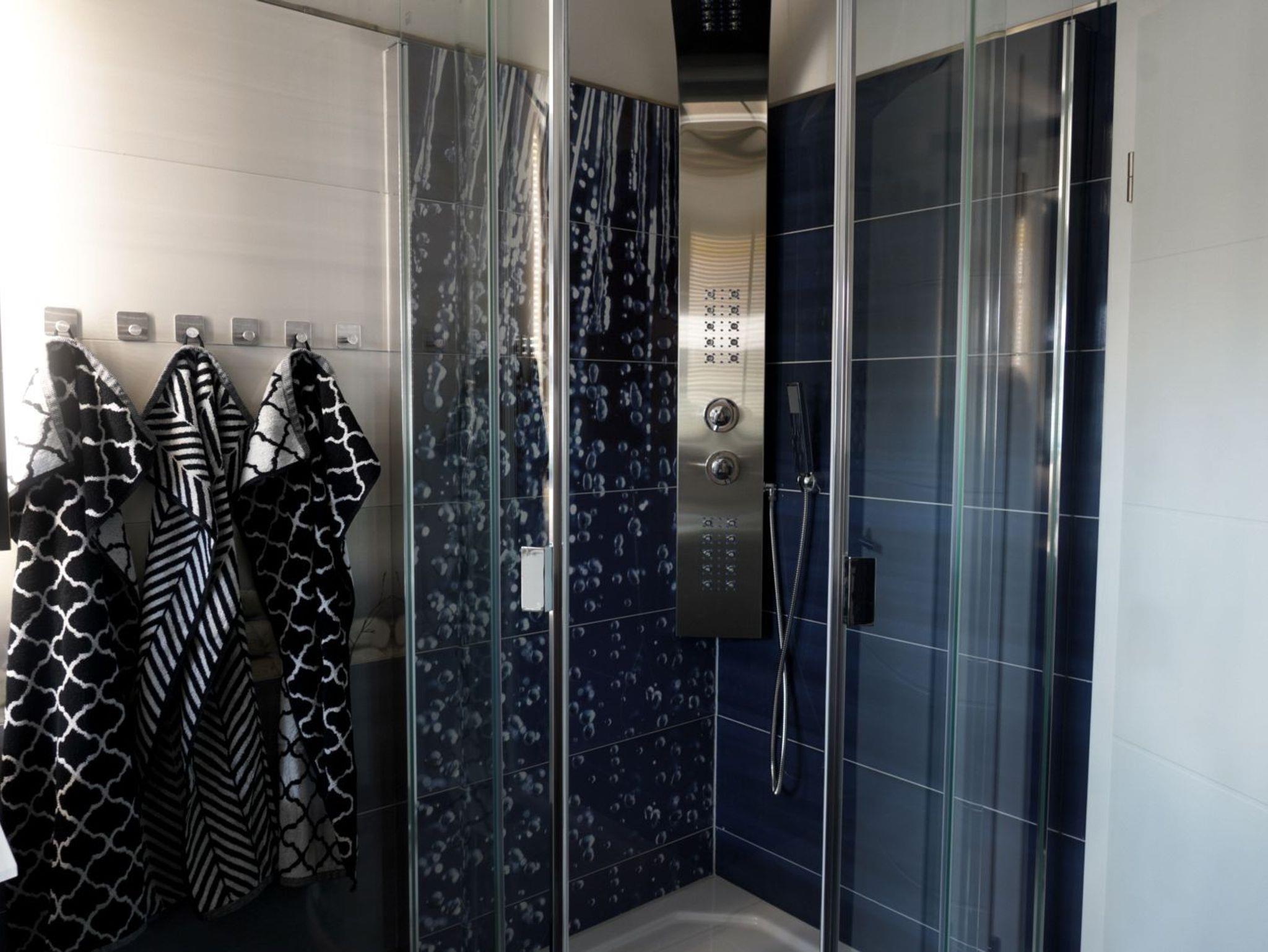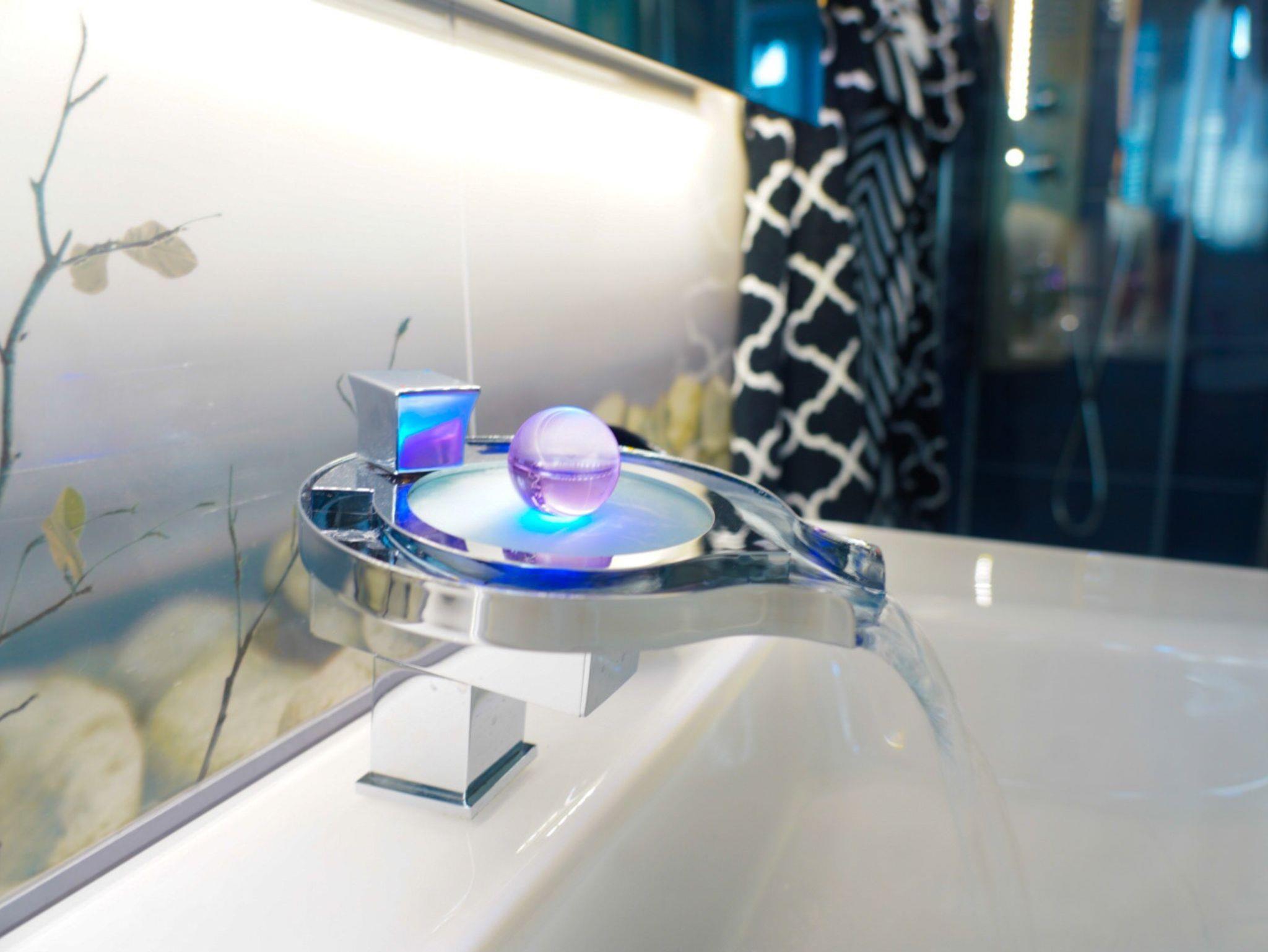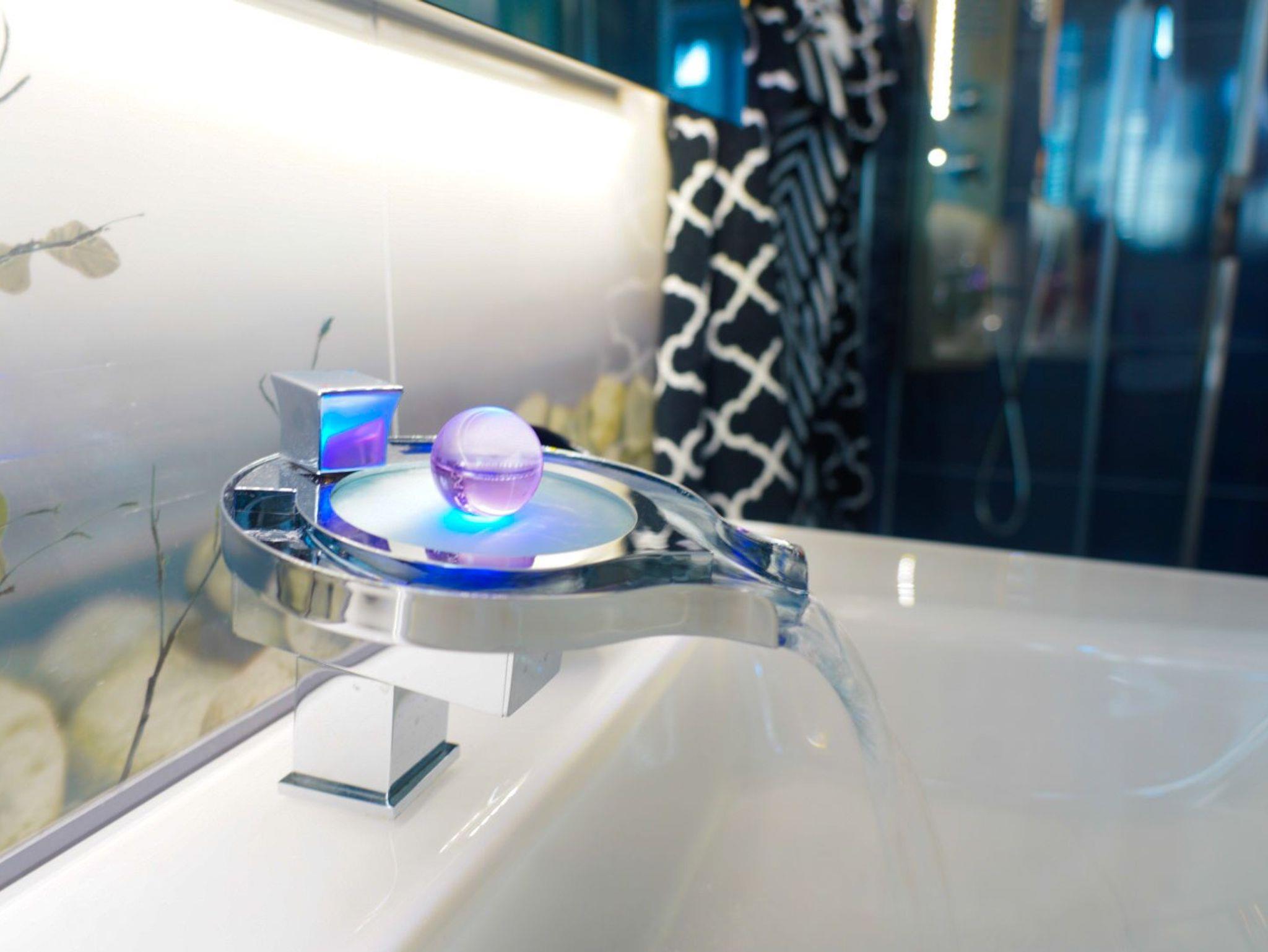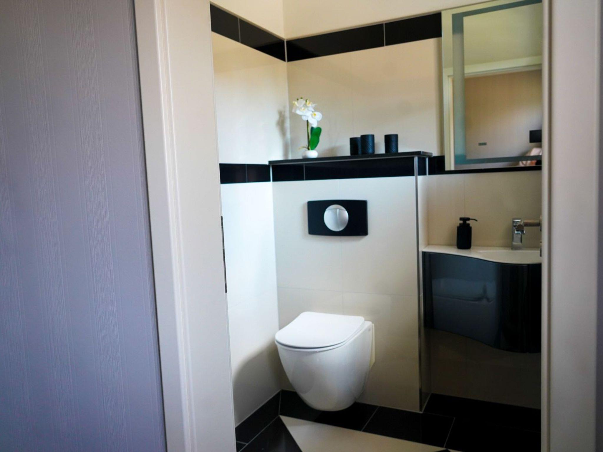 Entspannen Sie im großen Bad und nutzen Sie den gemütlichen Whirlpool samt besonderem Farbspiel und zahlreichen Massagedüsen. Ist Ihnen nebenbei nach ein wenig leichter Unterhaltung, schalten Sie einfach den im Spiegel integrierten Fernseher an und entspannen bei Ihrer Lieblingsserie. Ein tolles Erlebnis bietet unsere Komfortdusche mit einem Farbspiel der besonderen Art. Verschiedene Einstellungen der Düsen lassen Sie noch besser abschalten. Aber auch das WC mit integriertem Bidet sowie eine kleine Auswahl an Hygieneprodukten sorgen für kleine Wellnessmomente. Lassen Sie sich ruhig Zeit und gönnen Sie sich ein paar Minuten mehr. Denn müssen die anderen Gäste auf Toilette, nutzen Sie einfach das Gäste-WC im Erdgeschoss. Handtücher und Fön können Sie übrigens getrost Zuhause lassen, damit in Ihrem Koffer mehr Platz für ein weiteres Urlaubsoutfit bleibt.