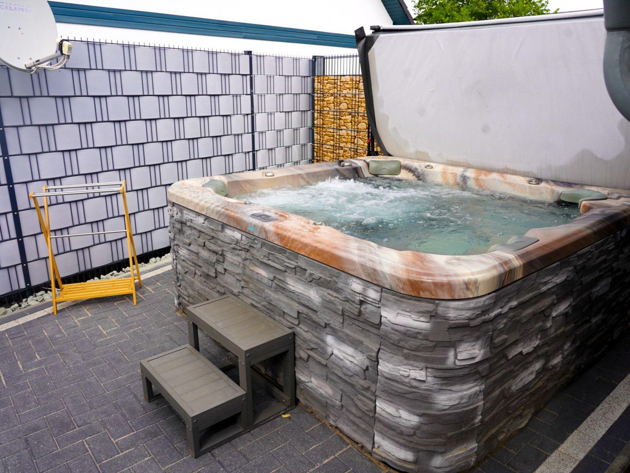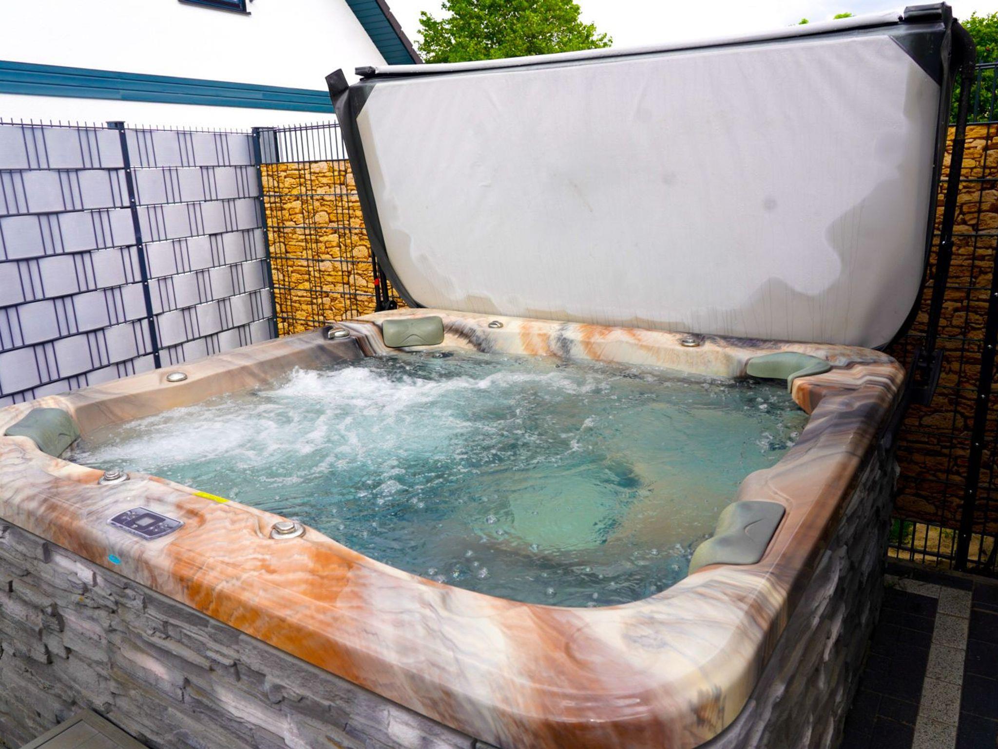 Das Highlight unseres Ferienhauses bildet die große Außenterrasse mit zahlreichen Sitz- und Liegemöglichkeiten. Der Whirlpool lädt nicht nur im Sommer zum Entspannen ein. Die integrierte Heizfunktion spendet Ihnen auch bei niedrigen Temperaturen Wärme und Geborgenheit. Auch hier können Sie sich über ein Farbspiel und zahlreiche Massagedüsen freuen. Für gemütliche Abende sorgt der Grillkamin. Genießen Sie neben ruhigen Momenten am Feuer auch saftig gegrillte Speisen. Dank integriertem Topf können Sie auch deftige Suppen direkt über den Flammen zubereiten.