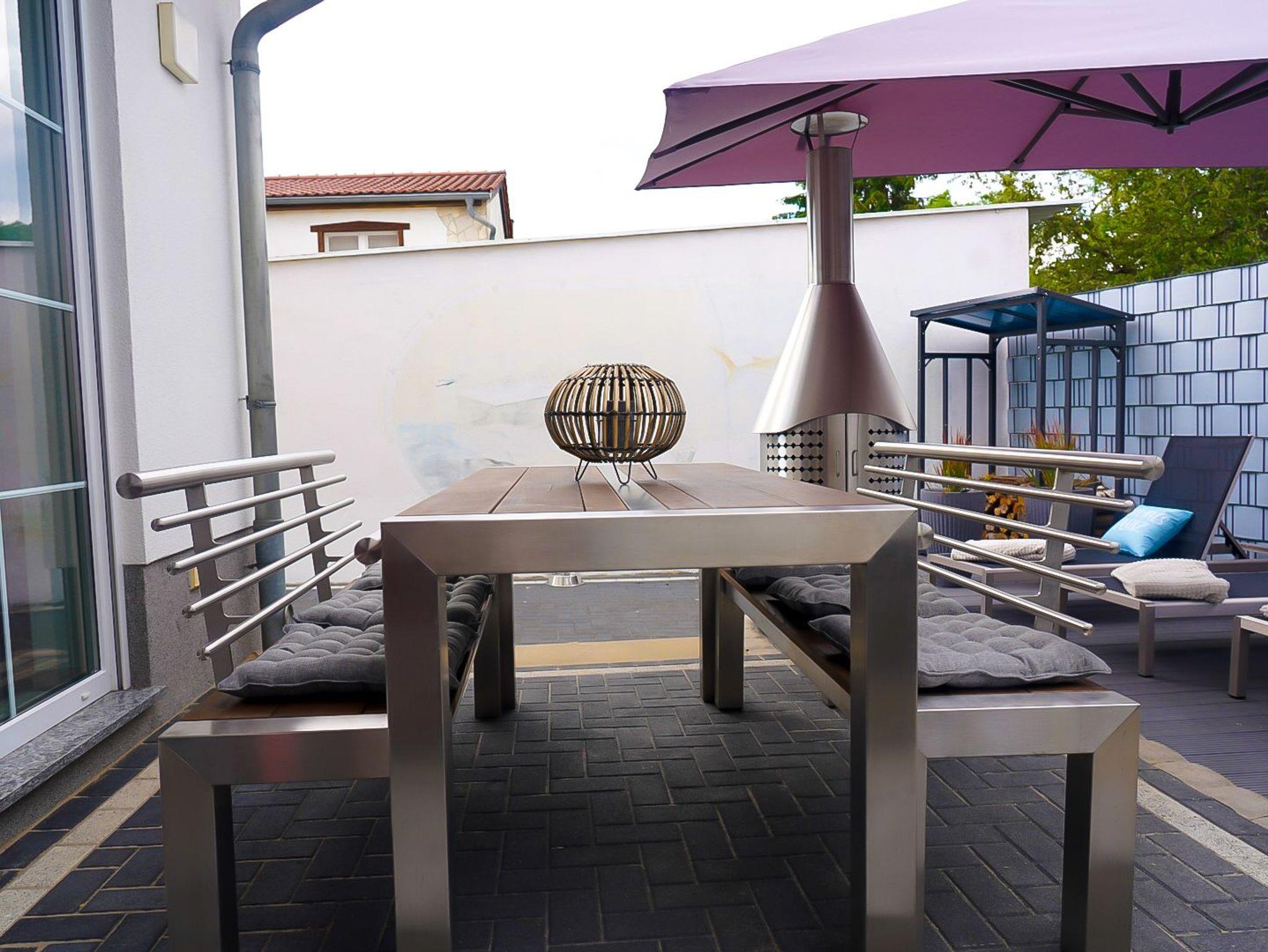 • 1 Terrasse mit Sitzmöglichkeiten mit Grillkamin & beheizbaren Whirlpool