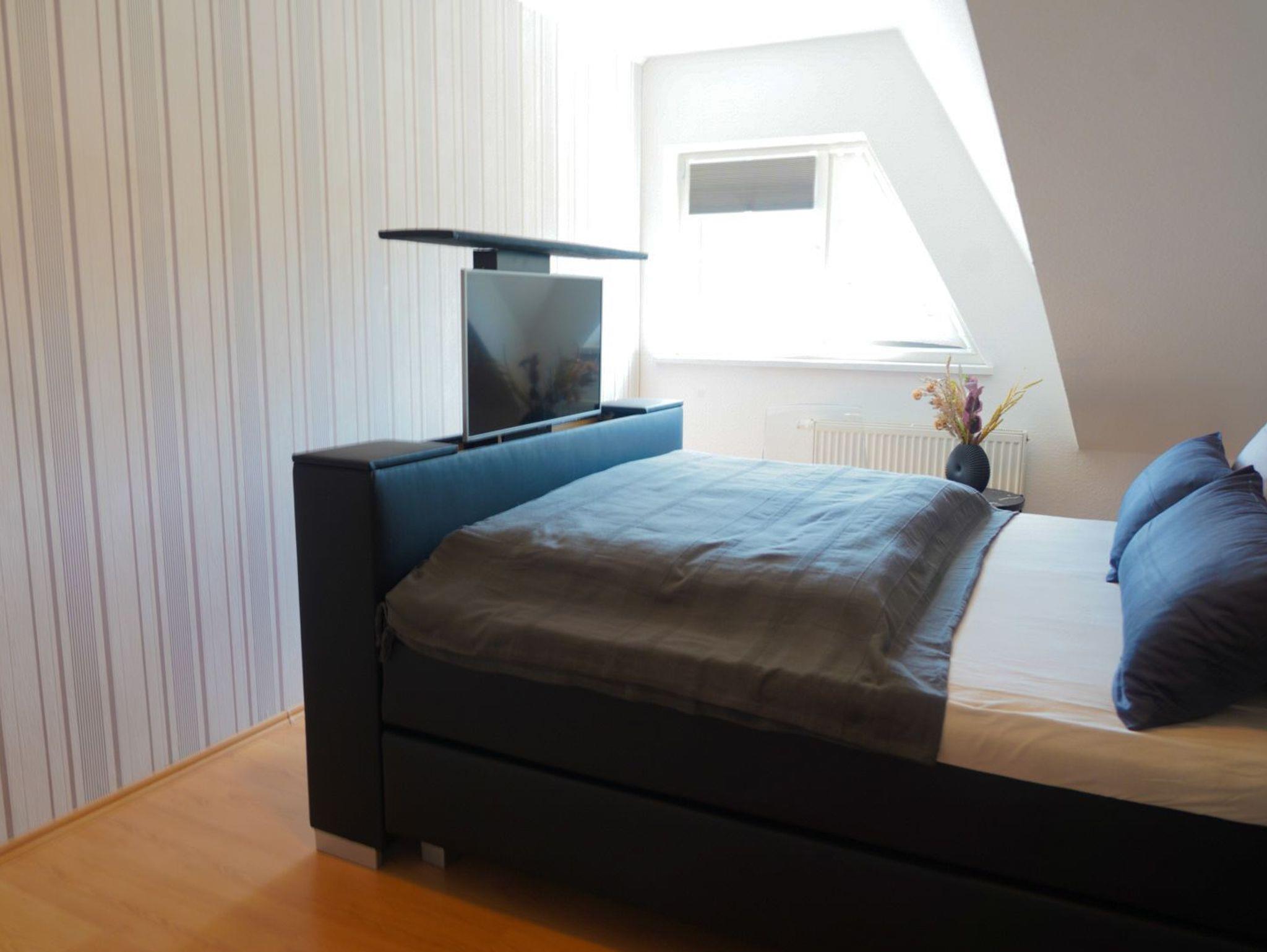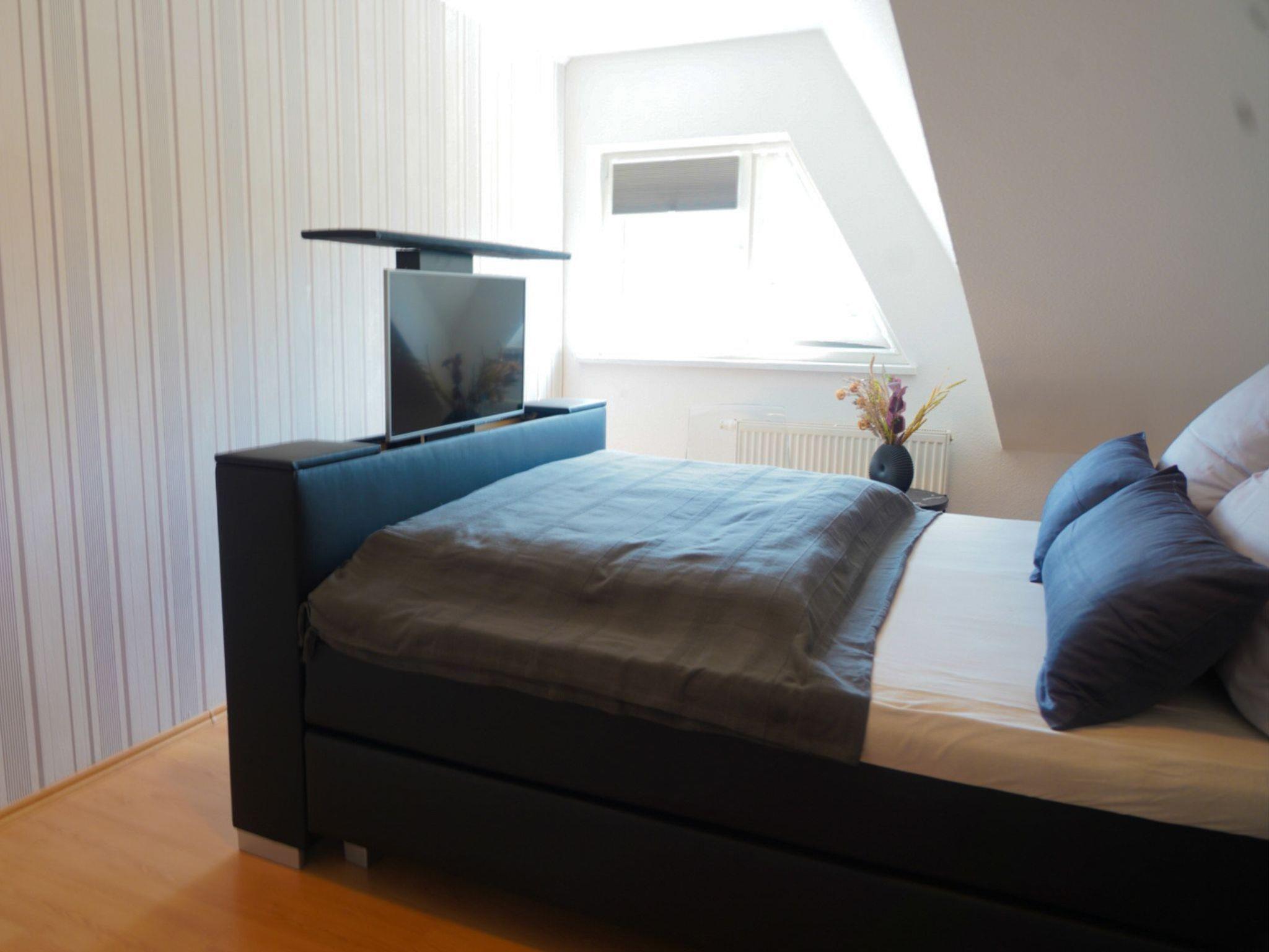 Das Ferienhaus bietet Ihnen Platz für bis zu 6 Personen. Es gibt 3 liebevoll dekorierte Schlafzimmer, die allesamt mit Fernsehern und großen Kleiderschränken ausgestattet sind. Das erste Schlafzimmer besitzt ein großes Doppelbett (1,80x2,00m). Im zweiten Schlafzimmer erwartet Sie ein besonderes Highlight: Am Fußende des großen Doppelbetts (1,60x2,00m) befindet sich ein Fernseher, der auf Knopfdruck nach oben fährt. Im dritten Schlafzimmer stehen zwei Einzelbetten (jeweils 0,90x2,00m) für Sie bereit, die Sie selbstverständlich zusammenschieben können. Damit der Urlaub direkt beginnen kann, beziehen wir die Betten bereits kostenfrei für Sie.