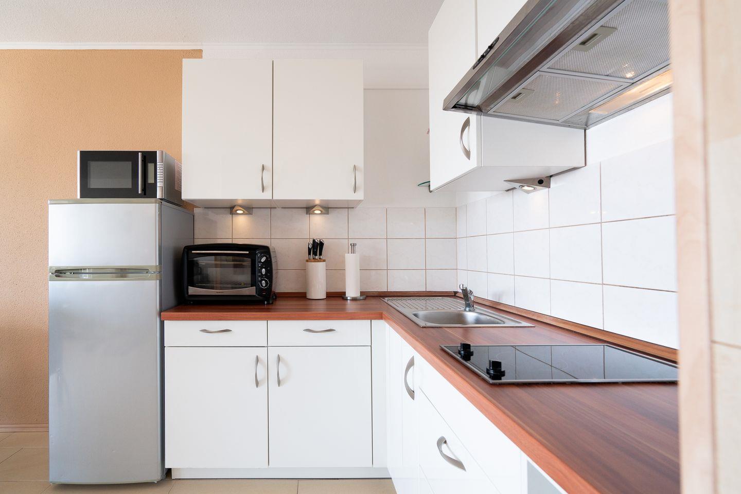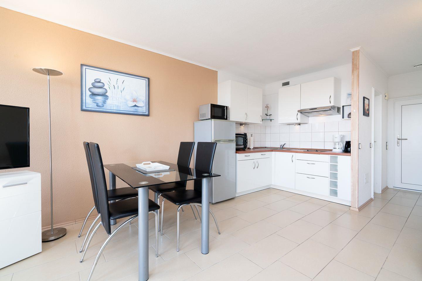 Die helle 1-Raum-Ferienwohnung liegt in der 4. Etage, vom Balkon blicken Sie über die Anlage hinweg in die Lübecker Bucht. Die Küche mit Backofen, Herd und Mikrowelle ist in den kombinierten Wohn- und Essbereich integriert. Der Schlafbereich mit Doppelbett (140 cm x 200 cm) lässt sich durch ein Schiebeelement vom Wohn- und Essbereich abtrennen. Im Wohnbereich steht zudem ein Schlafsofa, so dass die Wohnung für vier Personen geeignet ist. Das hell geflieste Duschbad ist innenliegend. Zum Strand sind es nur wenige Fußschritte. PKW-Stellplatz inklusive.
